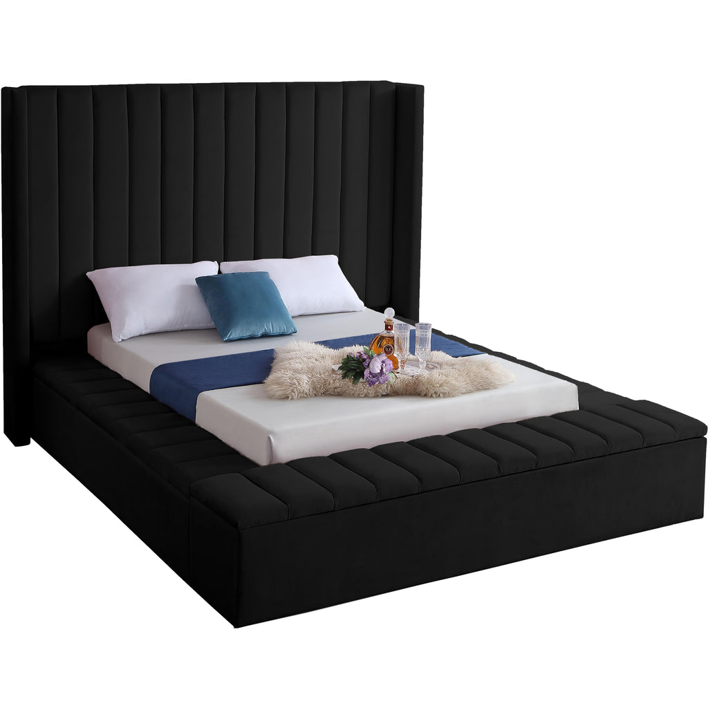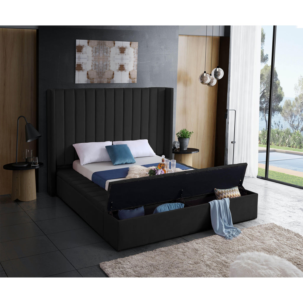 Make a bold statement in your bedroom with this stunning Kiki black velvet queen bed. Its black velvet design with channel tufting gives it a chic, textured appearance that's both comfortable and dramatic. This queen size bed features storage rails along its full slats frame, making it the perfect solution for individuals in limited sleeping spaces. Its width of 91.5 inches, depth of 99 inches, and height of 65 inches offers ample room to sleep without being cramped.