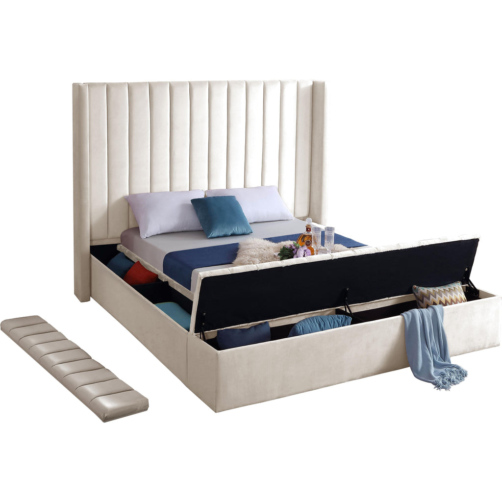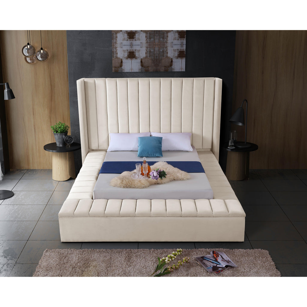 Make a bold statement in your bedroom with this stunning Kiki cream velvet queen bed. Its cream velvet design with channel tufting gives it a chic, textured appearance that's both comfortable and dramatic. This queen size bed features storage rails along its full slats frame, making it the perfect solution for individuals in limited sleeping spaces. Its width of 91.5 inches, depth of 99 inches, and height of 65 inches offers ample room to sleep without being cramped.