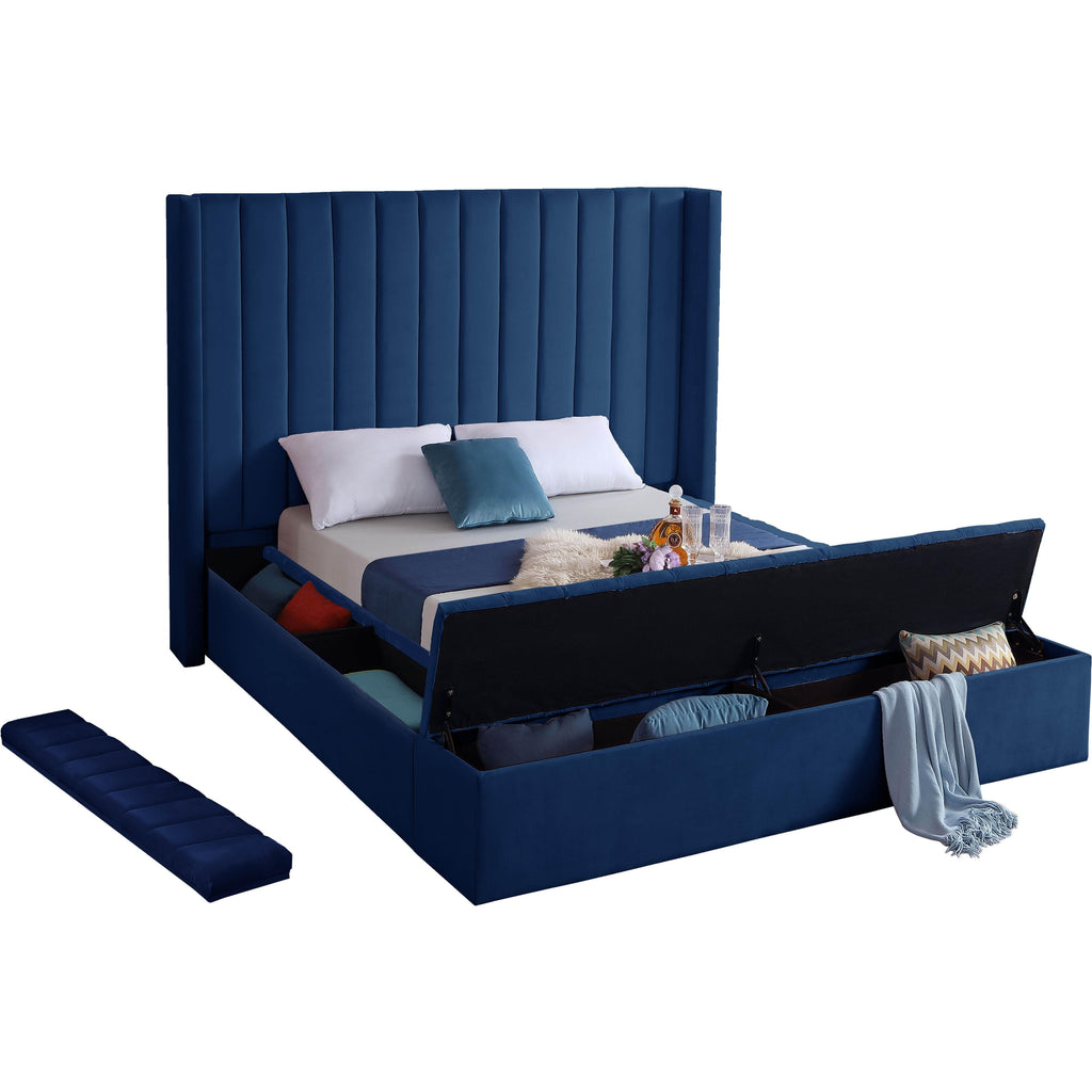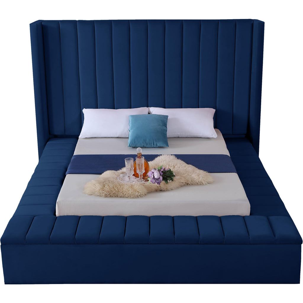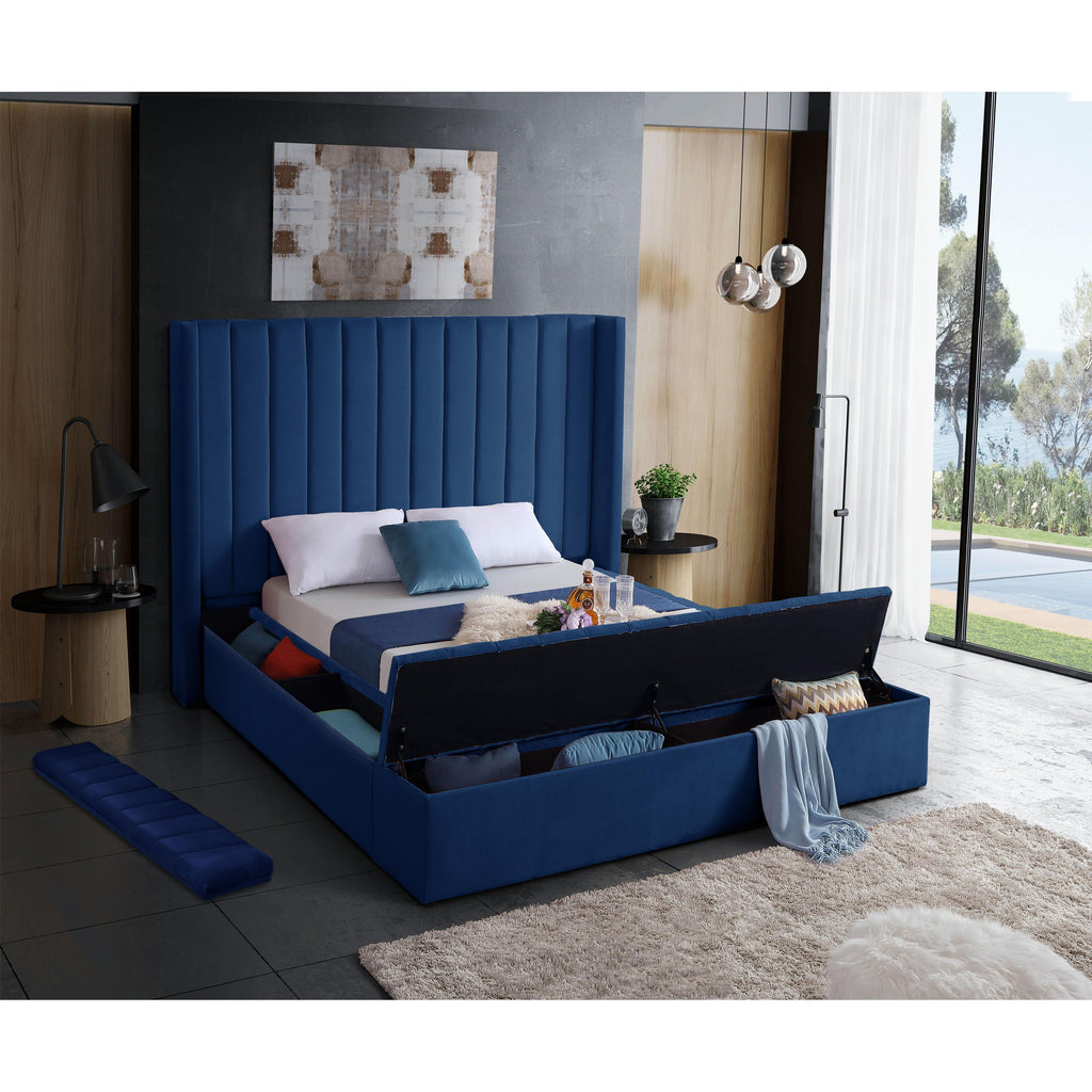 Make a bold statement in your bedroom with this stunning Kiki navy velvet queen bed. Its navy velvet design with channel tufting gives it a chic, textured appearance that's both comfortable and dramatic. This queen size bed features storage rails along its full slats frame, making it the perfect solution for individuals in limited sleeping spaces. Its width of 91.5 inches, depth of 99 inches, and height of 65 inches offers ample room to sleep without being cramped.