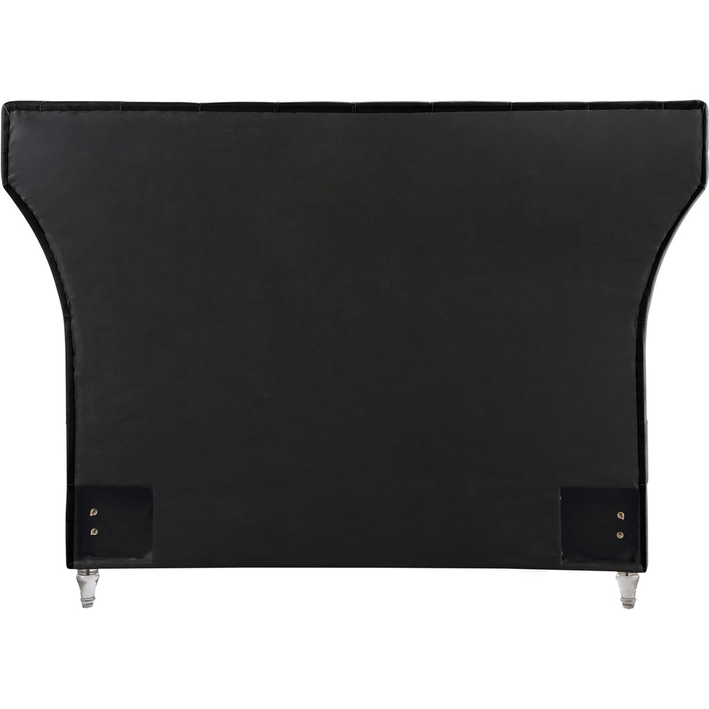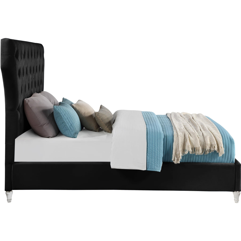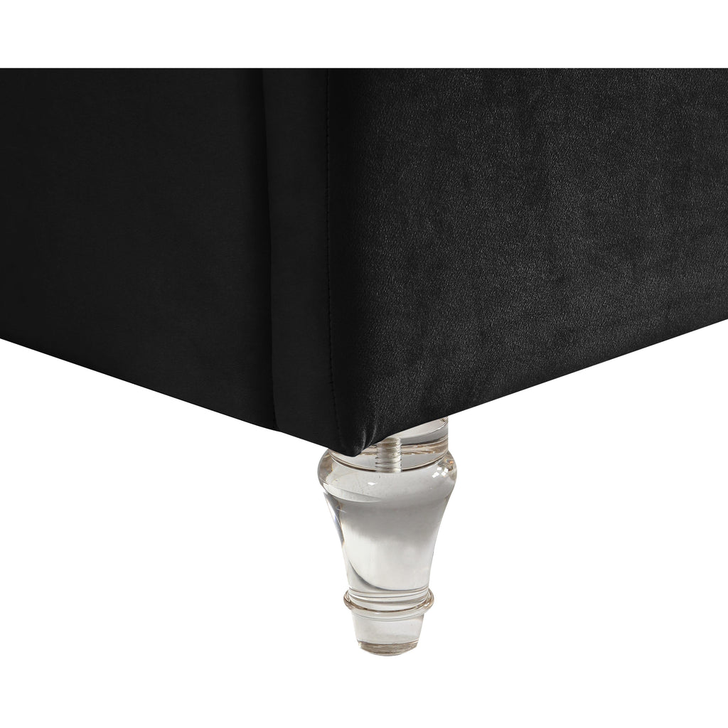 Bring this Kira velvet bed into your space to give your room an instant style boost. This stunning queen-sized bed features soft black velvet upholstery, including the headboard and sideboards. Deep button tufting draws instant visual interest into your room, adding an elegant and sophisticated element that's hard to ignore. The padded design makes sitting up in bed to read or watch TV a more luxurious and comfortable endeavor. Elegant turned feet made from acrylic add a modern finish to the bed.