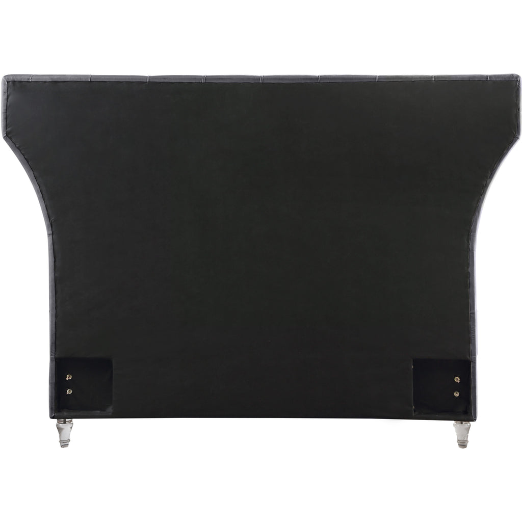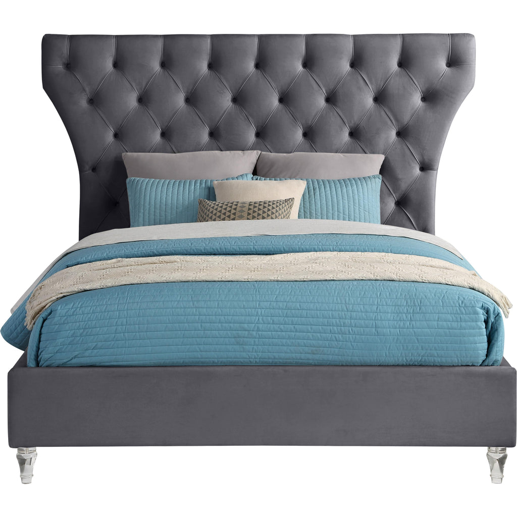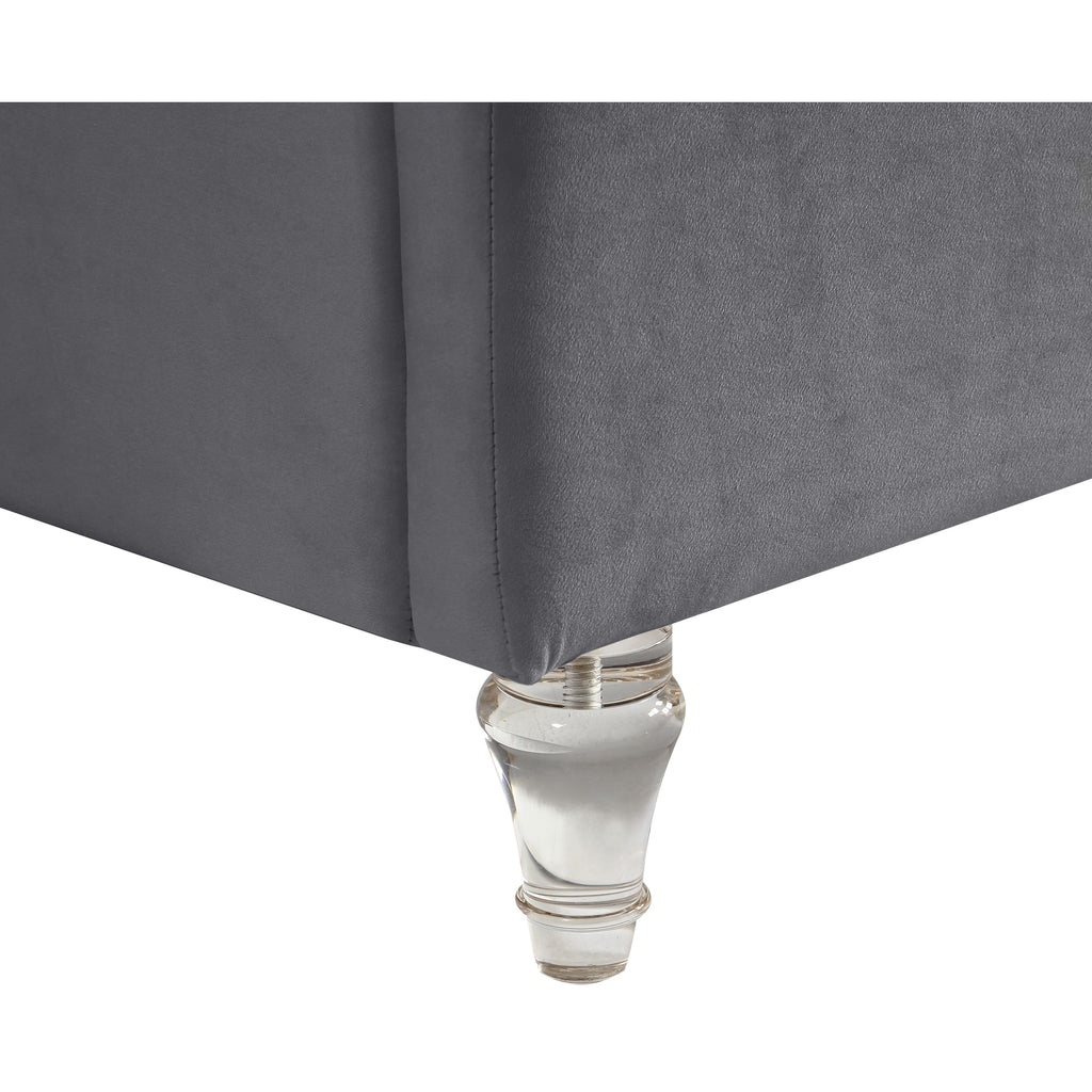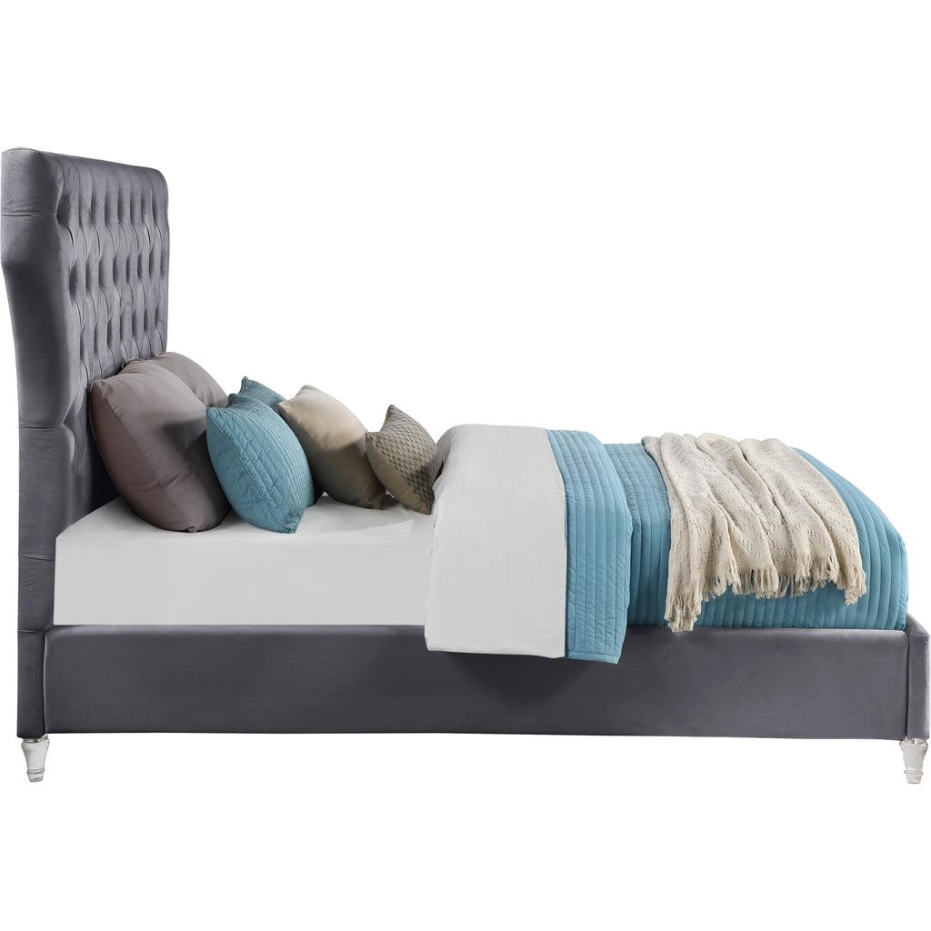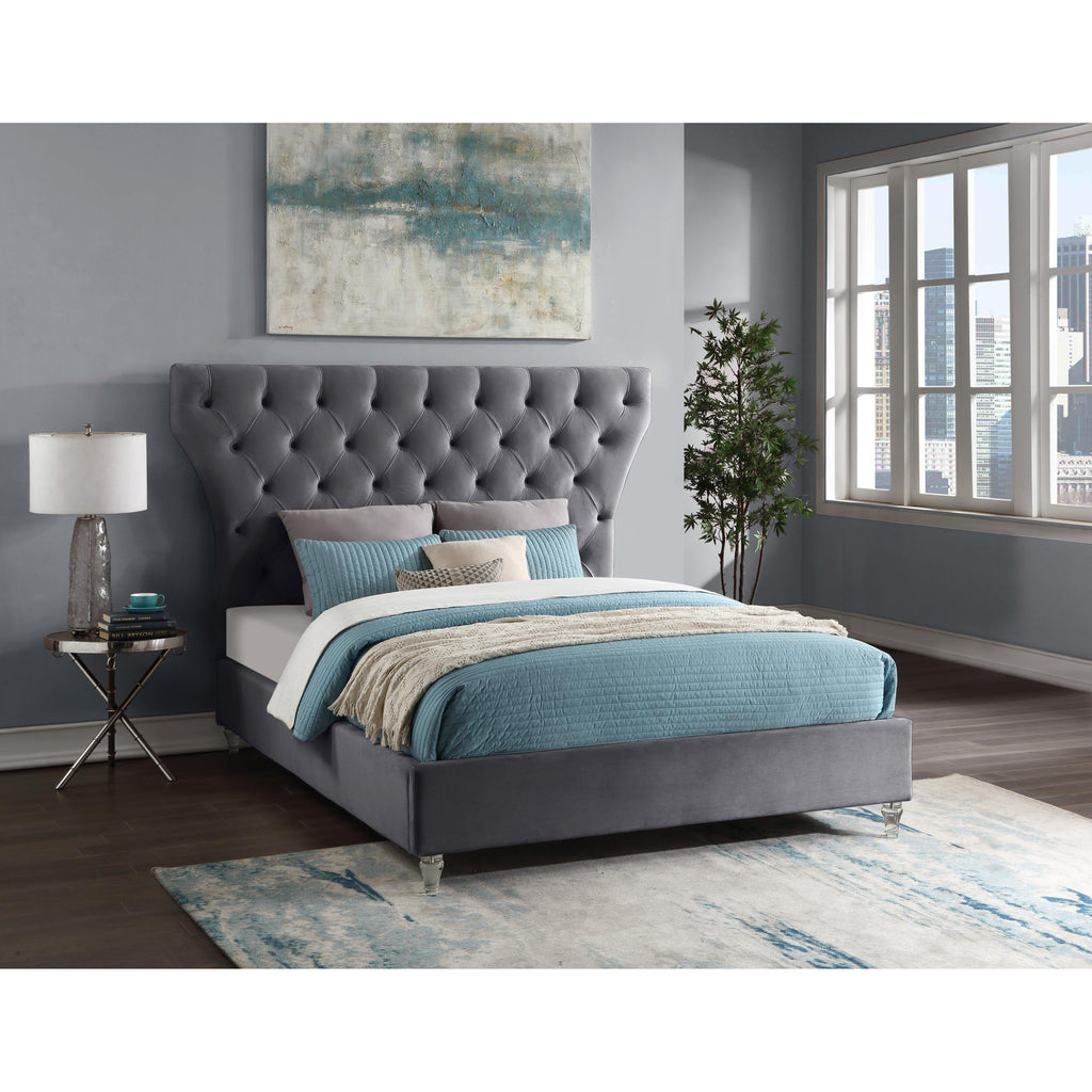 Bring this Kira velvet bed into your space to give your room an instant style boost. This stunning queen-sized bed features soft grey velvet upholstery, including the headboard and sideboards. Deep button tufting draws instant visual interest into your room, adding an elegant and sophisticated element that's hard to ignore. The padded design makes sitting up in bed to read or watch TV a more luxurious and comfortable endeavor. Elegant turned feet made from acrylic add a modern finish to the bed.