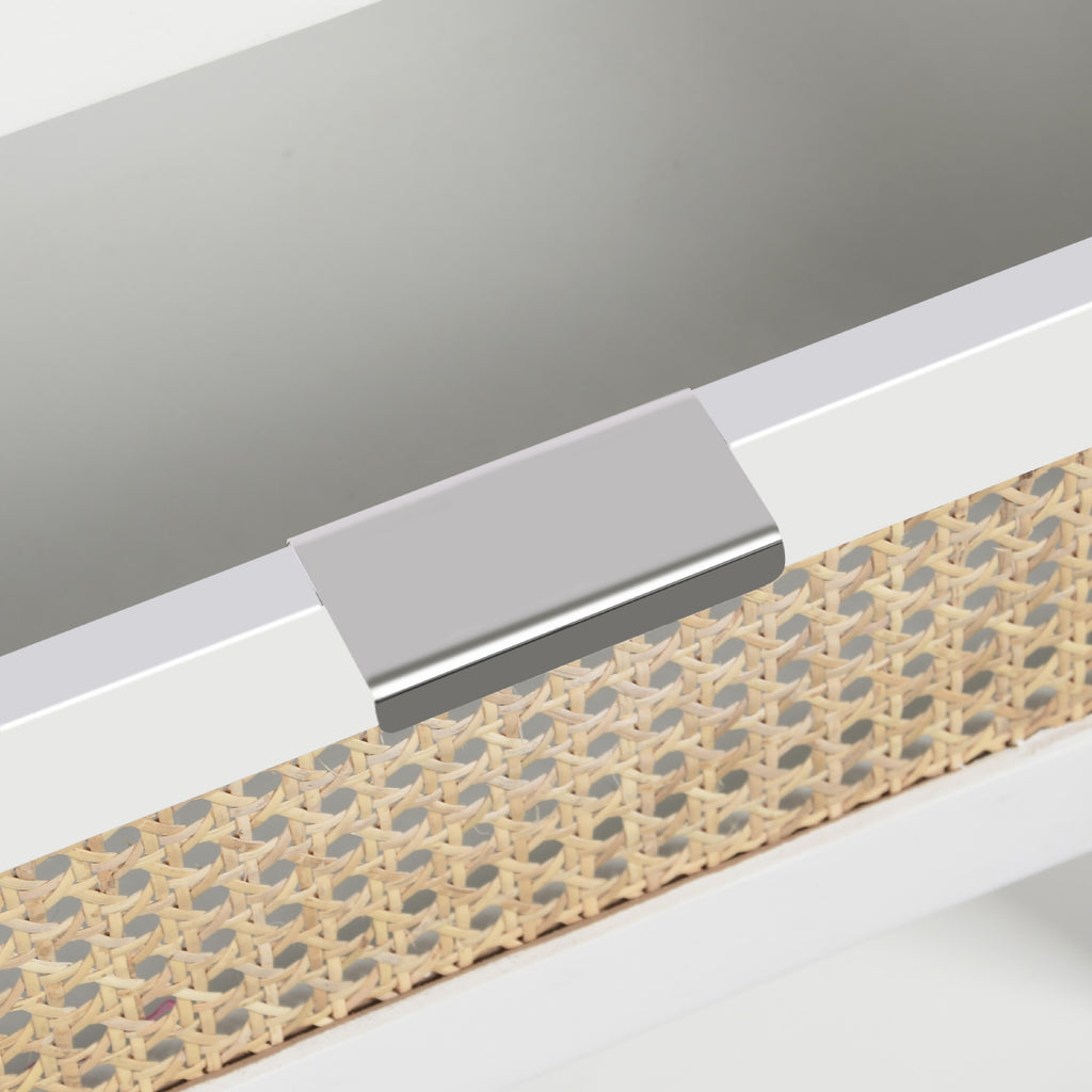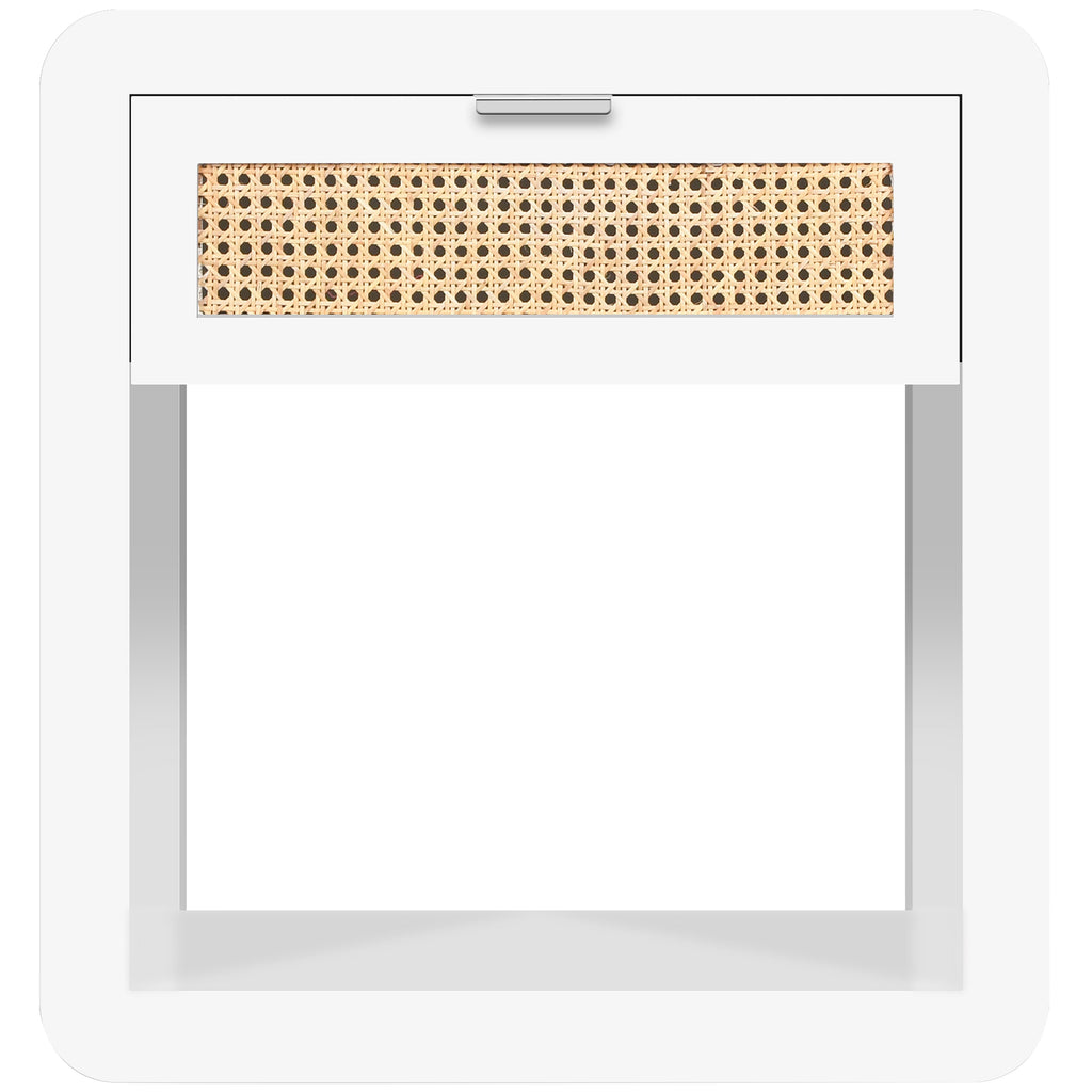 Lend your bedroom a distinctive touch with this Langham white night stand from Meridian Furniture. Featuring an open, rectangular design and a natural cane drawer front, this night stand is truly unique. A sleek white finish complements the existing decor in your bedroom; both brushed brass and chrome handles are included so you can choose which one best matches your decor. This night stand's mid century design is the perfect addition to your living space.
