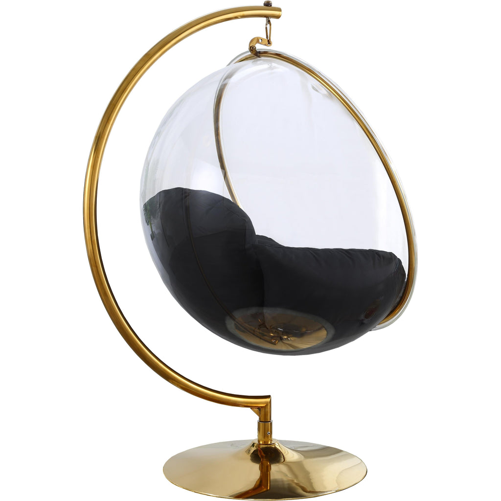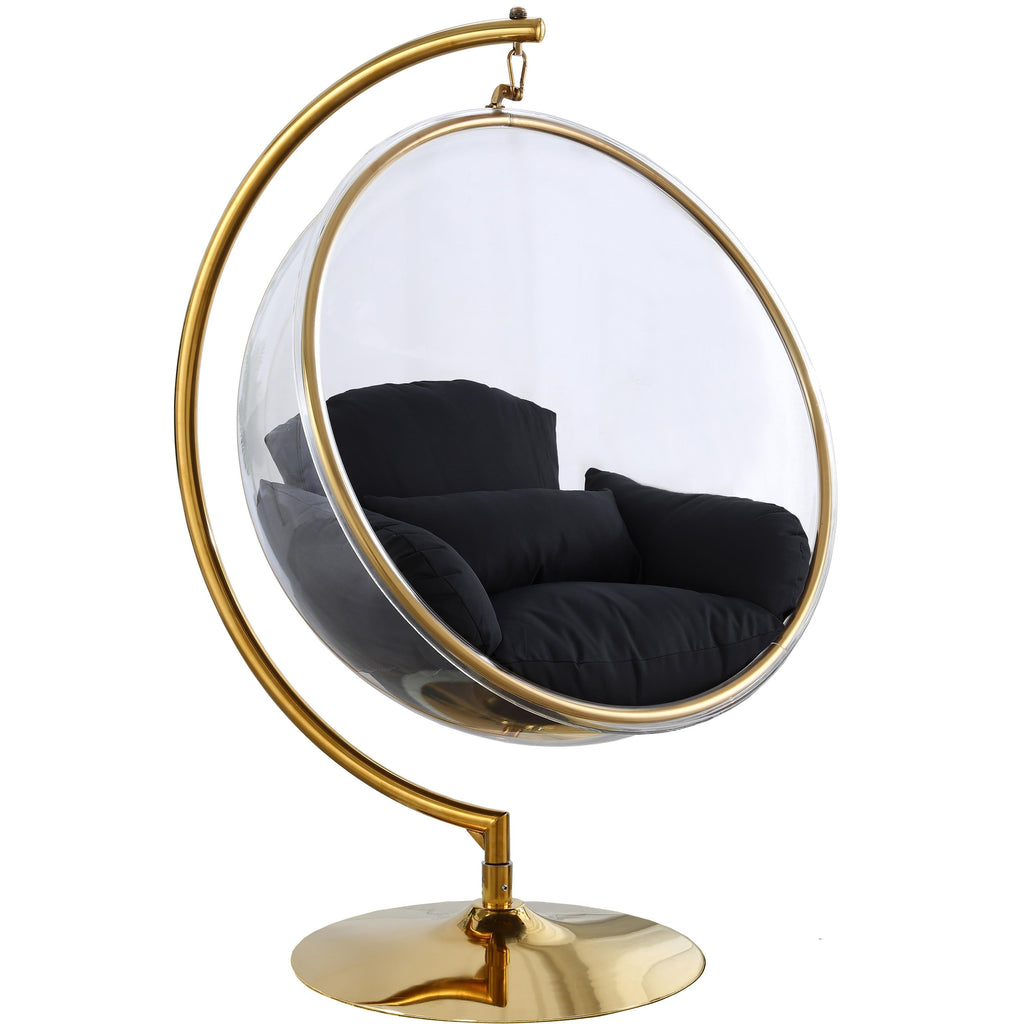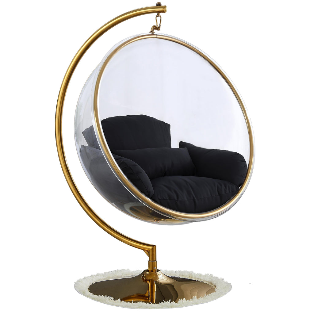 Retreat to your own little bubble, literally, in this Luna acrylic swing bubble accent chair. What a modish addition to your living room, bedroom or other space! This Luna chair features an acrylic egg-style seat topped with black fabric-covered cushions for supreme comfort. The gold metal base and frame provides sturdy support so that you can chillax to your hearts content in your very own sanctuary.
