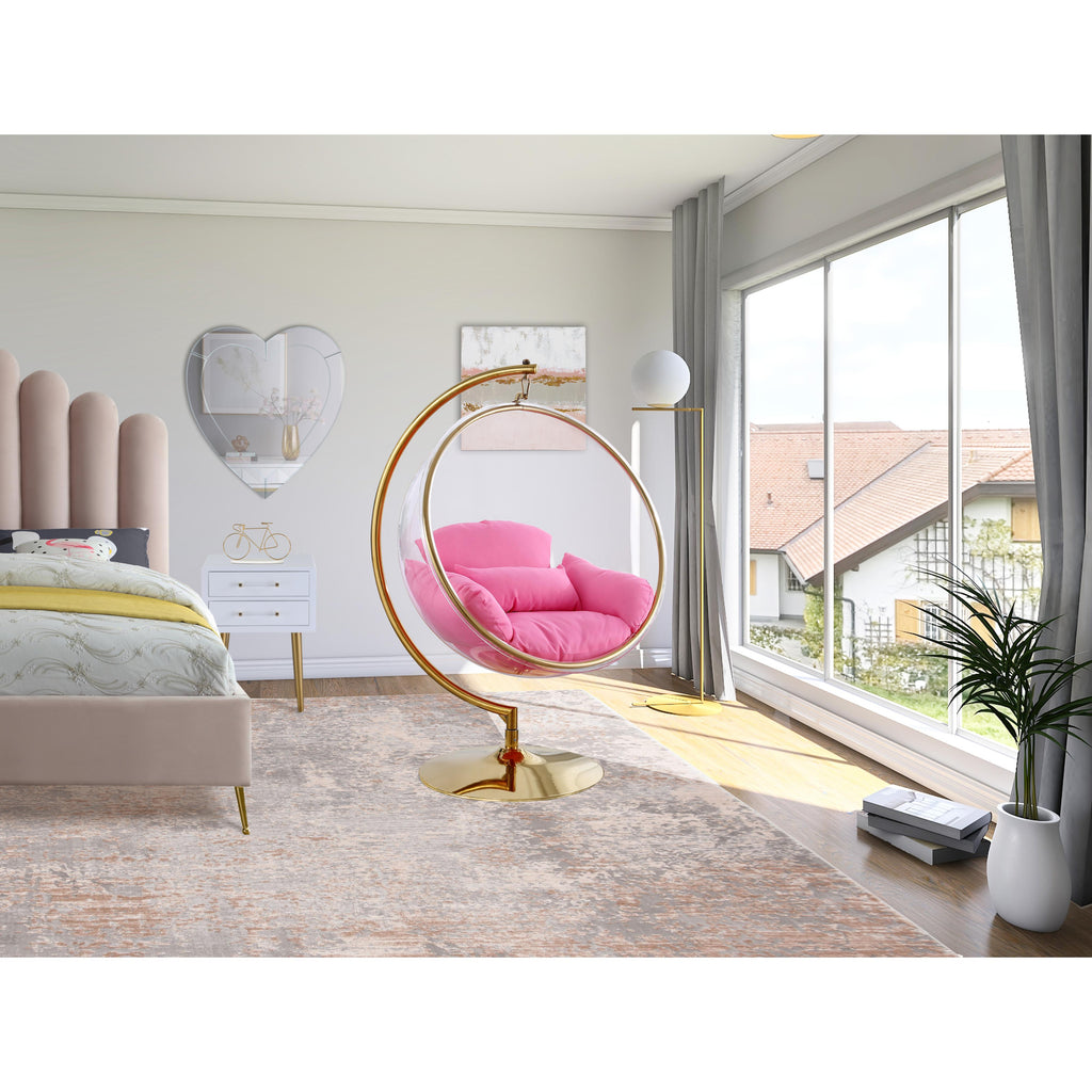 Retreat to your own little bubble, literally, in this Luna acrylic swing bubble accent chair. What a modish addition to your living room, bedroom or other space! This Luna chair features an acrylic egg-style seat topped with pink fabric-covered cushions for supreme comfort. The gold metal base and frame provides sturdy support so that you can chillax to your hearts content in your very own sanctuary.