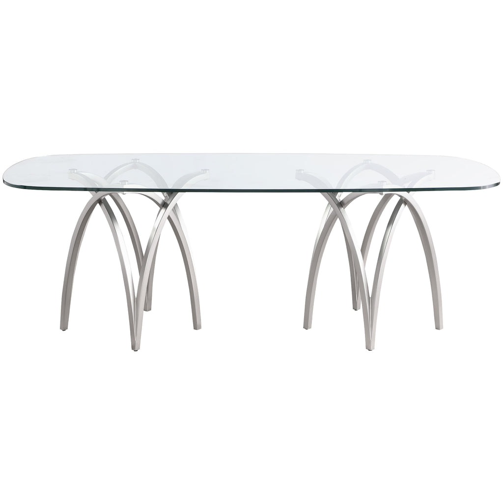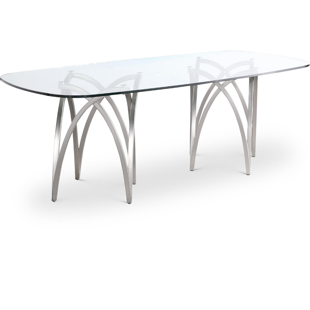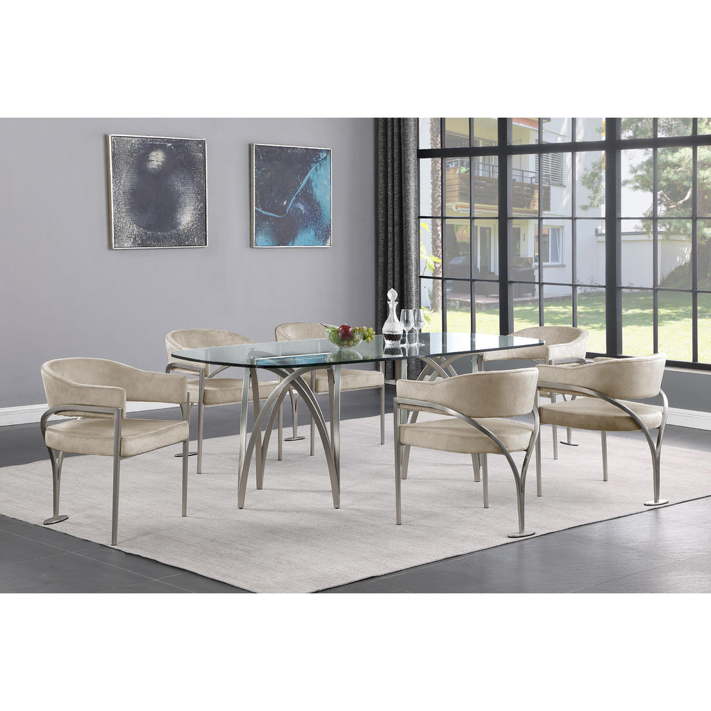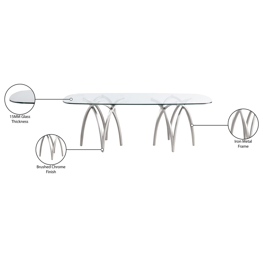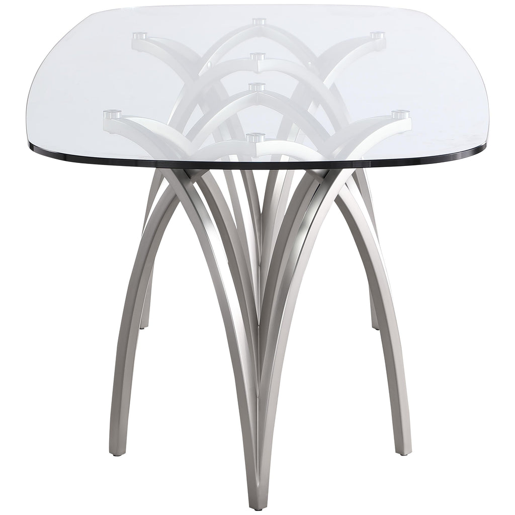 Gather the gang and seat them in elegance around the spacious confines of this Madelyn dining table. This table offers oodles of elbow room for diners to get comfortable over meals large and small. The thick-cut glass top offers a sophisticated take that elevates dining to the next level while a brushed chrome finish on the iron metal frame ensures an affluent look that diners can really appreciate. Pair the table with the matching chair from the same collection for a cohesive finish.