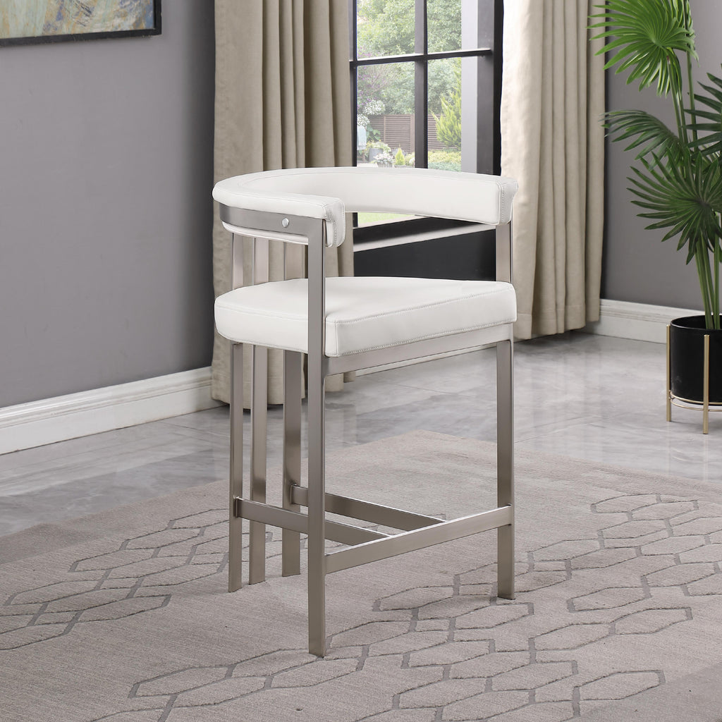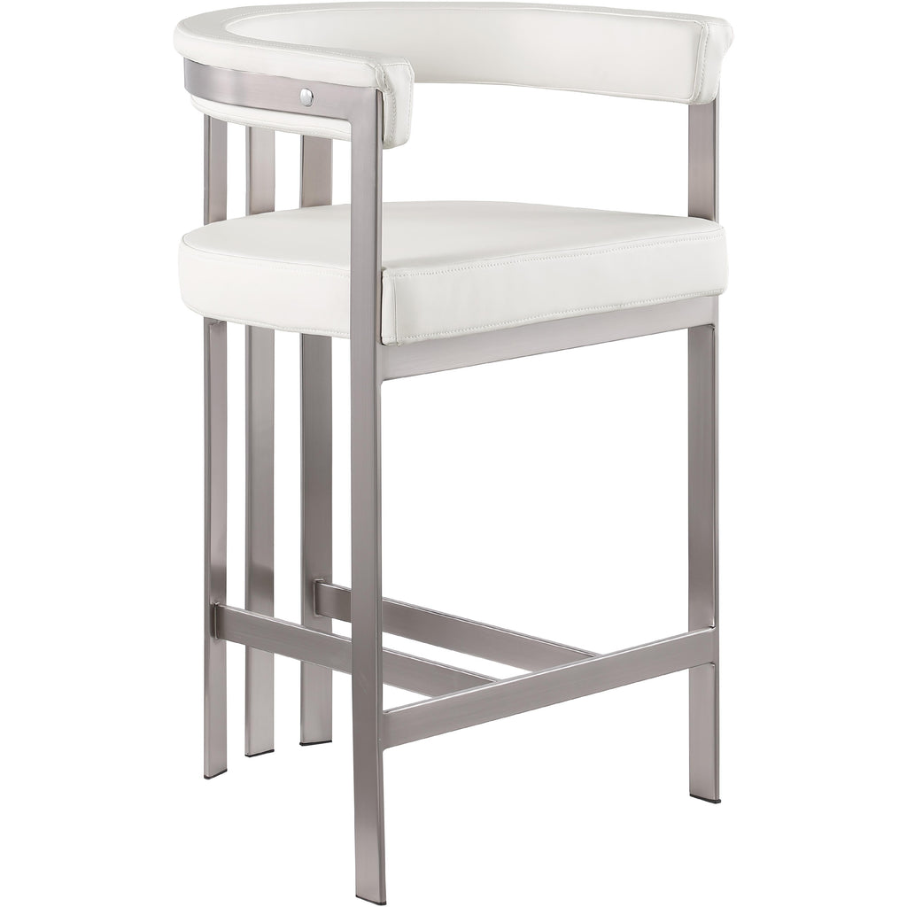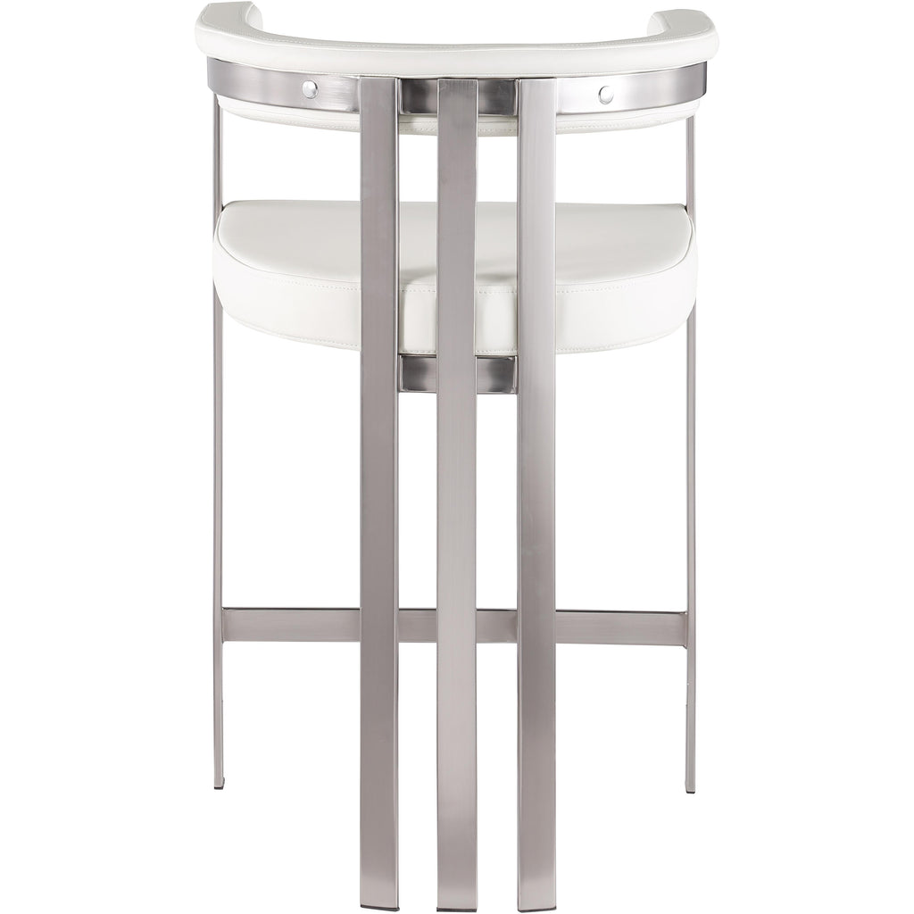 Turn your dining space into a contemporary haven with this Marcello cream vegan leather counter stool. Its soft, high-end cream vegan leather is soft for you to sit on, while its brushed chrome iron frame ensures durability for years to come. Its curved back provides support while you sit and enjoy your meal, so your back won't get tired or hurt while you eat. Its curved, contemporary design is perfect for any modern home.