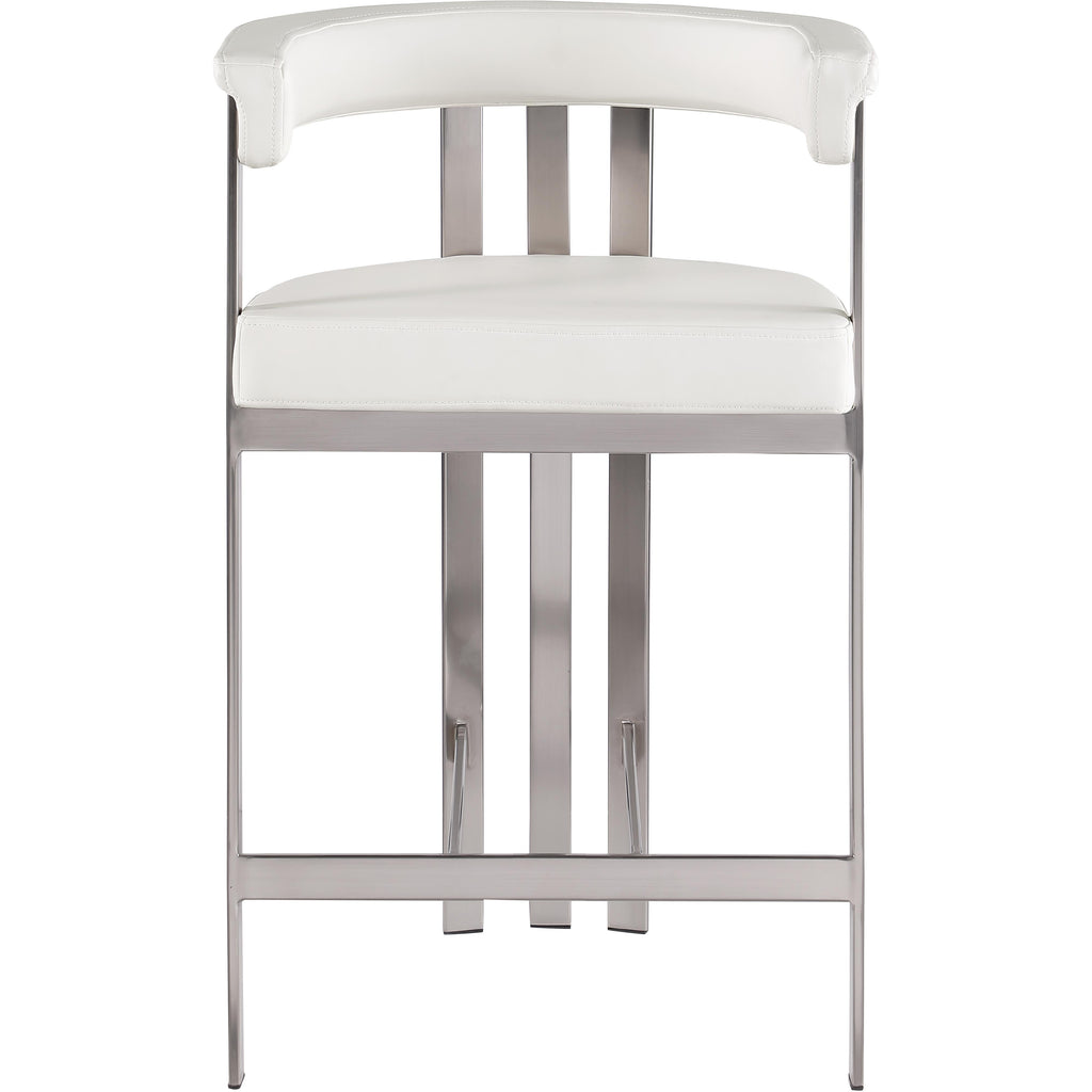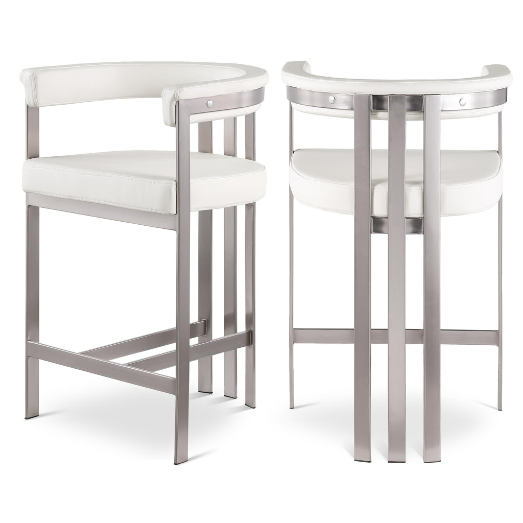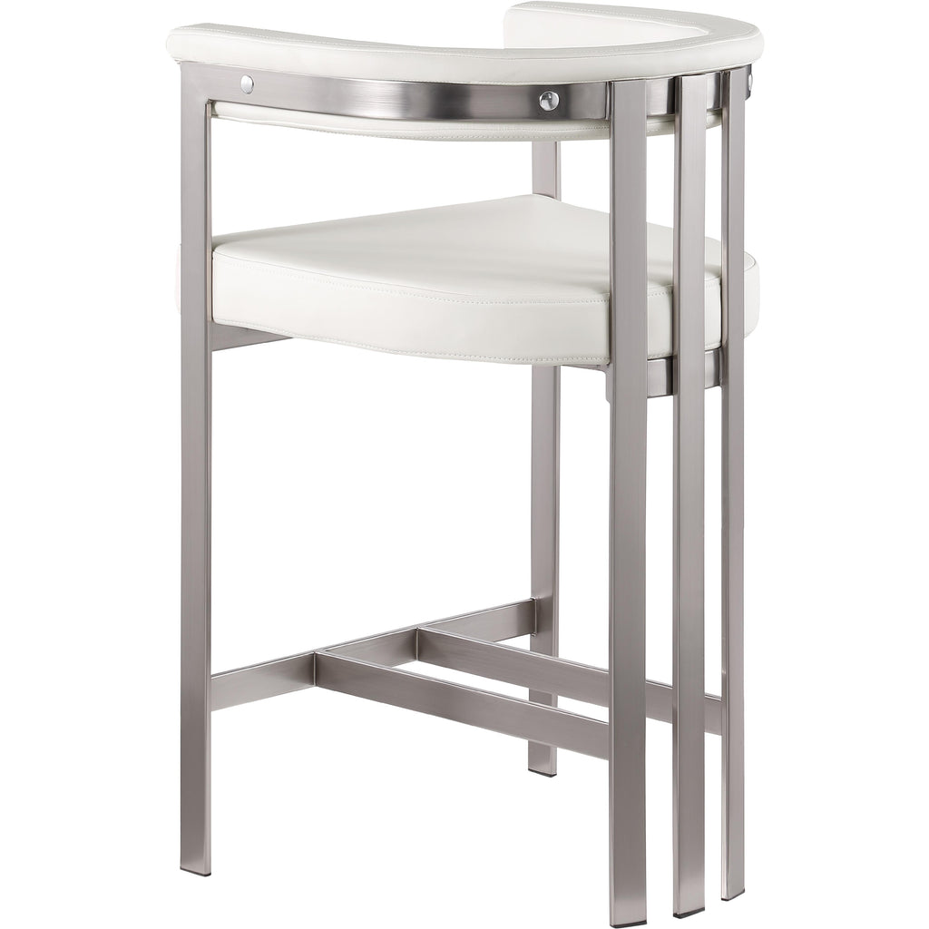 Turn your dining space into a contemporary haven with this Marcello cream vegan leather counter stool. Its soft, high-end cream vegan leather is soft for you to sit on, while its brushed chrome iron frame ensures durability for years to come. Its curved back provides support while you sit and enjoy your meal, so your back won't get tired or hurt while you eat. Its curved, contemporary design is perfect for any modern home.