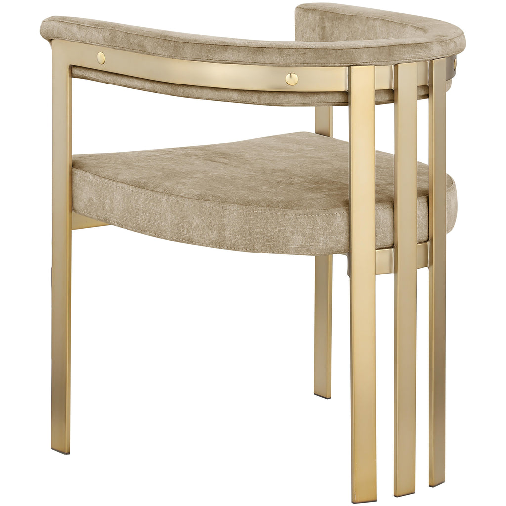 Turn your dining space into a contemporary haven with this Marcello beige velvet dining chair. Its soft, high-end beige velvet is soft for you to sit on, while its brushed brass iron frame ensures durability for years to come. Its curved back provides support while you sit and enjoy your meal, so your back won't get tired or hurt while you eat. Its curved, contemporary design is perfect for any modern home.