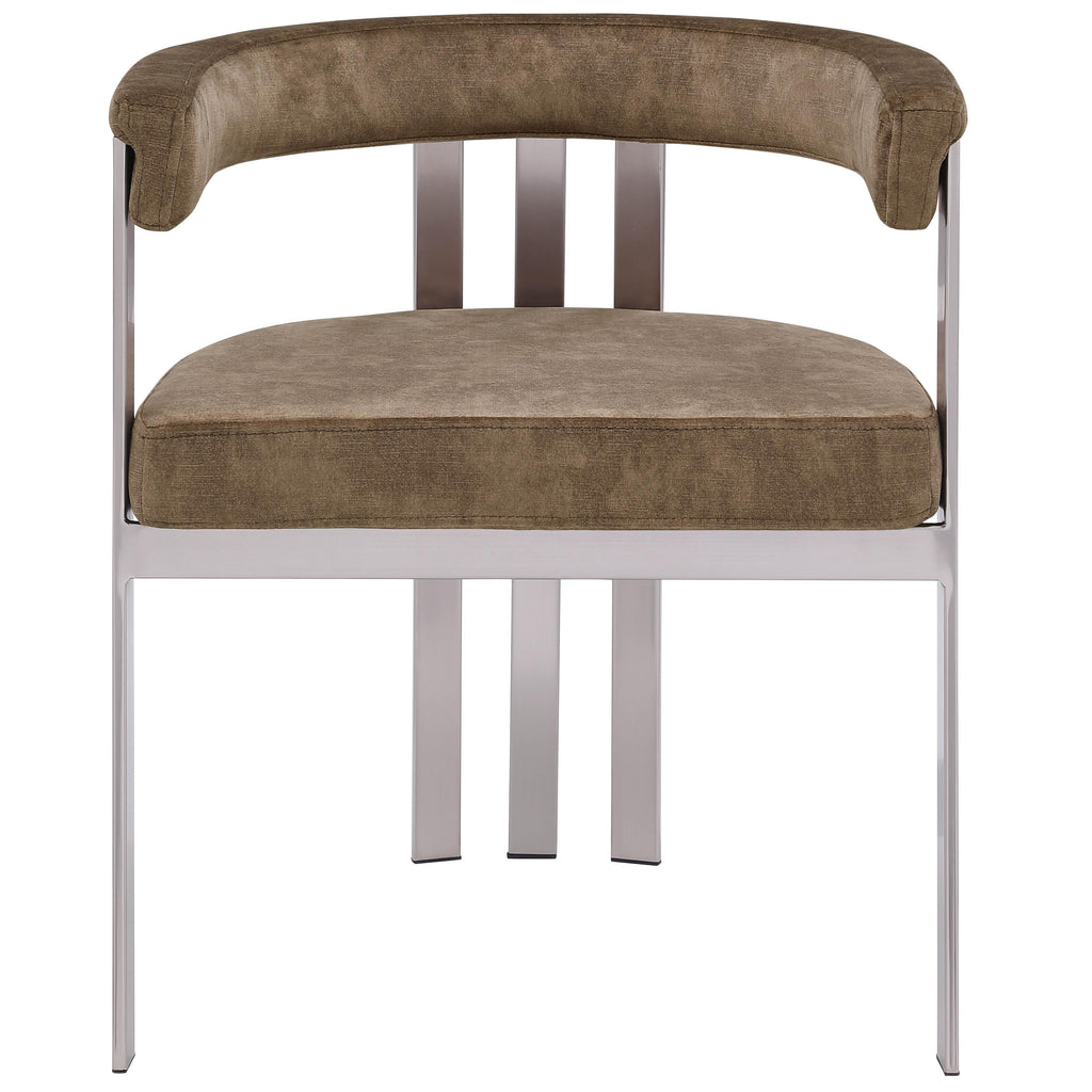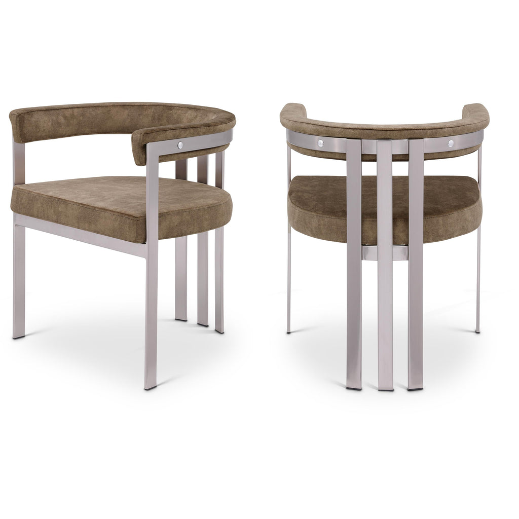 Turn your dining space into a contemporary haven with this Marcello brown velvet dining chair. Its soft, high-end brown velvet is soft for you to sit on, while its brushed chrome iron frame ensures durability for years to come. Its curved back provides support while you sit and enjoy your meal, so your back won't get tired or hurt while you eat. Its curved, contemporary design is perfect for any modern home.