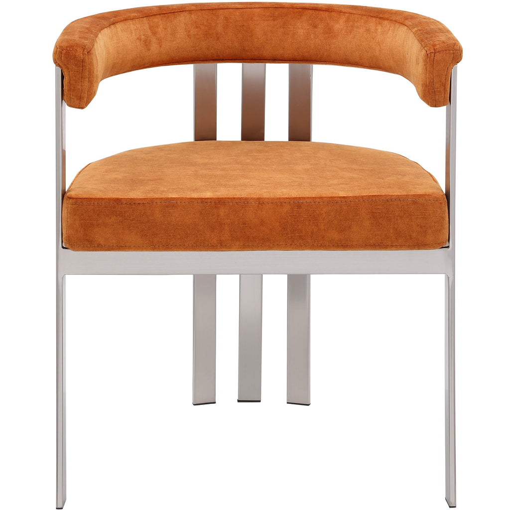 Turn your dining space into a contemporary haven with this Marcello cognac velvet dining chair. Its soft, high-end cognac velvet is soft for you to sit on, while its brushed chrome iron frame ensures durability for years to come. Its curved back provides support while you sit and enjoy your meal, so your back won't get tired or hurt while you eat. Its curved, contemporary design is perfect for any modern home.