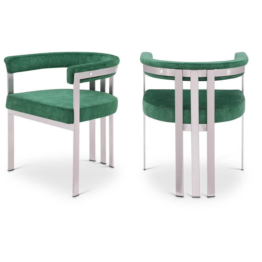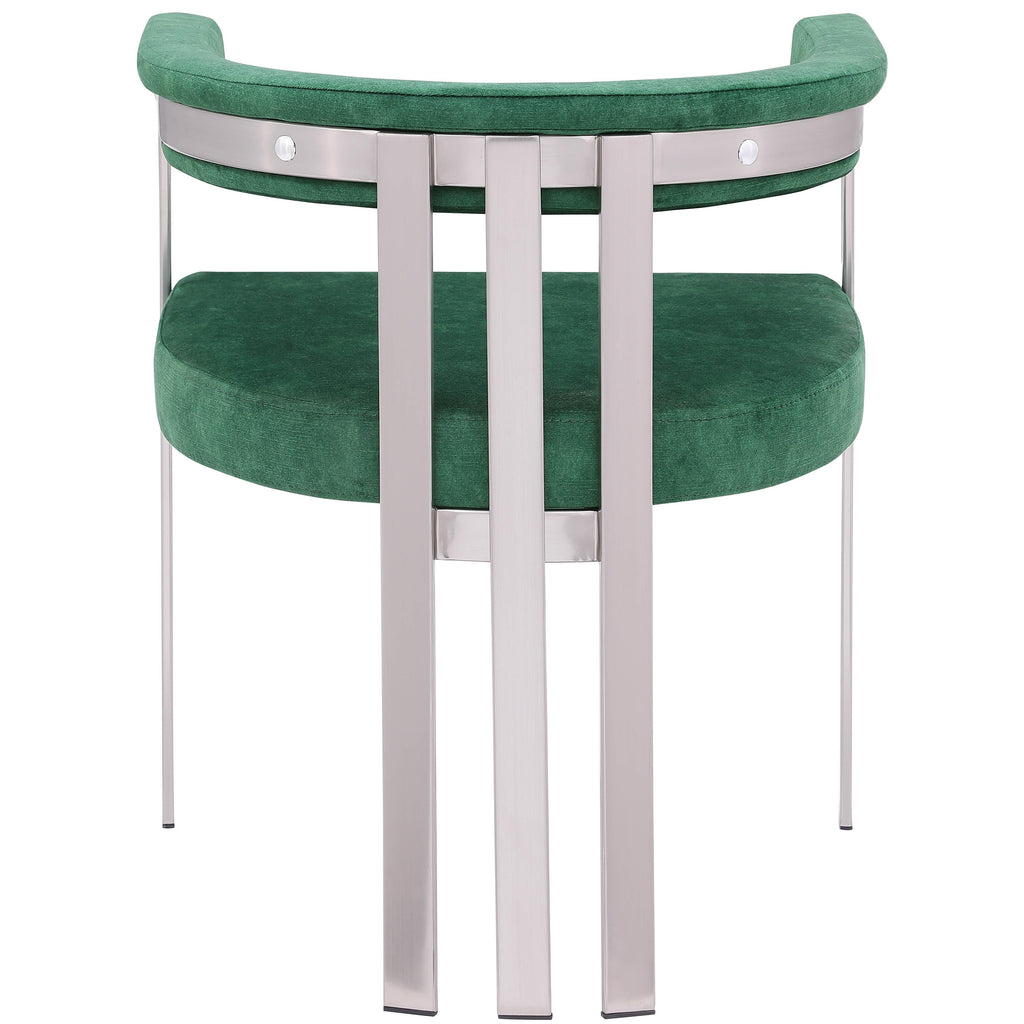 Turn your dining space into a contemporary haven with this Marcello green velvet dining chair. Its soft, high-end green velvet is soft for you to sit on, while its brushed chrome iron frame ensures durability for years to come. Its curved back provides support while you sit and enjoy your meal, so your back won't get tired or hurt while you eat. Its curved, contemporary design is perfect for any modern home.