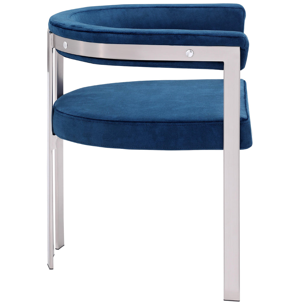 Turn your dining space into a contemporary haven with this Marcello navy velvet dining chair. Its soft, high-end navy velvet is soft for you to sit on, while its brushed chrome iron frame ensures durability for years to come. Its curved back provides support while you sit and enjoy your meal, so your back won't get tired or hurt while you eat. Its curved, contemporary design is perfect for any modern home.