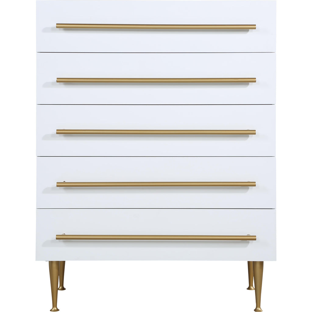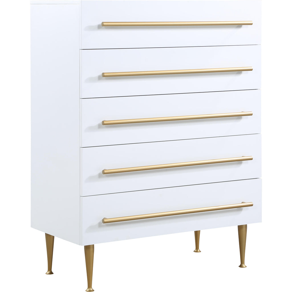 Turn to the Marisol chest to make a big impression in your modern bedroom. This contemporary piece looks great on its own or paired with other items in the Marisol collection. Eye-catchingly elegant, this piece features a rich white finish with brushed gold metal legs and handle for an up-to-the-minute vibe in your bedroom sanctuary. Minimalist hardware adds functionality without overpowering the unit. Wood construction adds to its durable design.