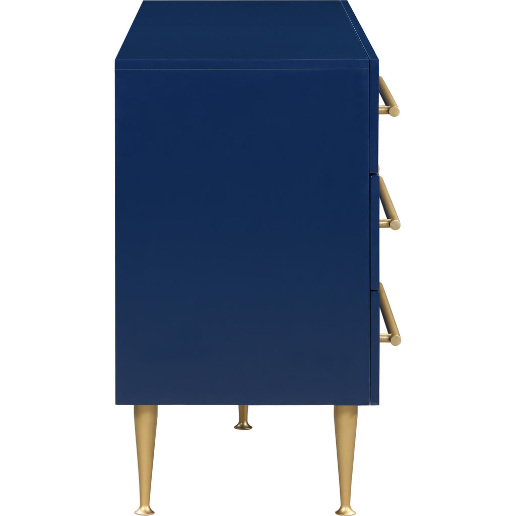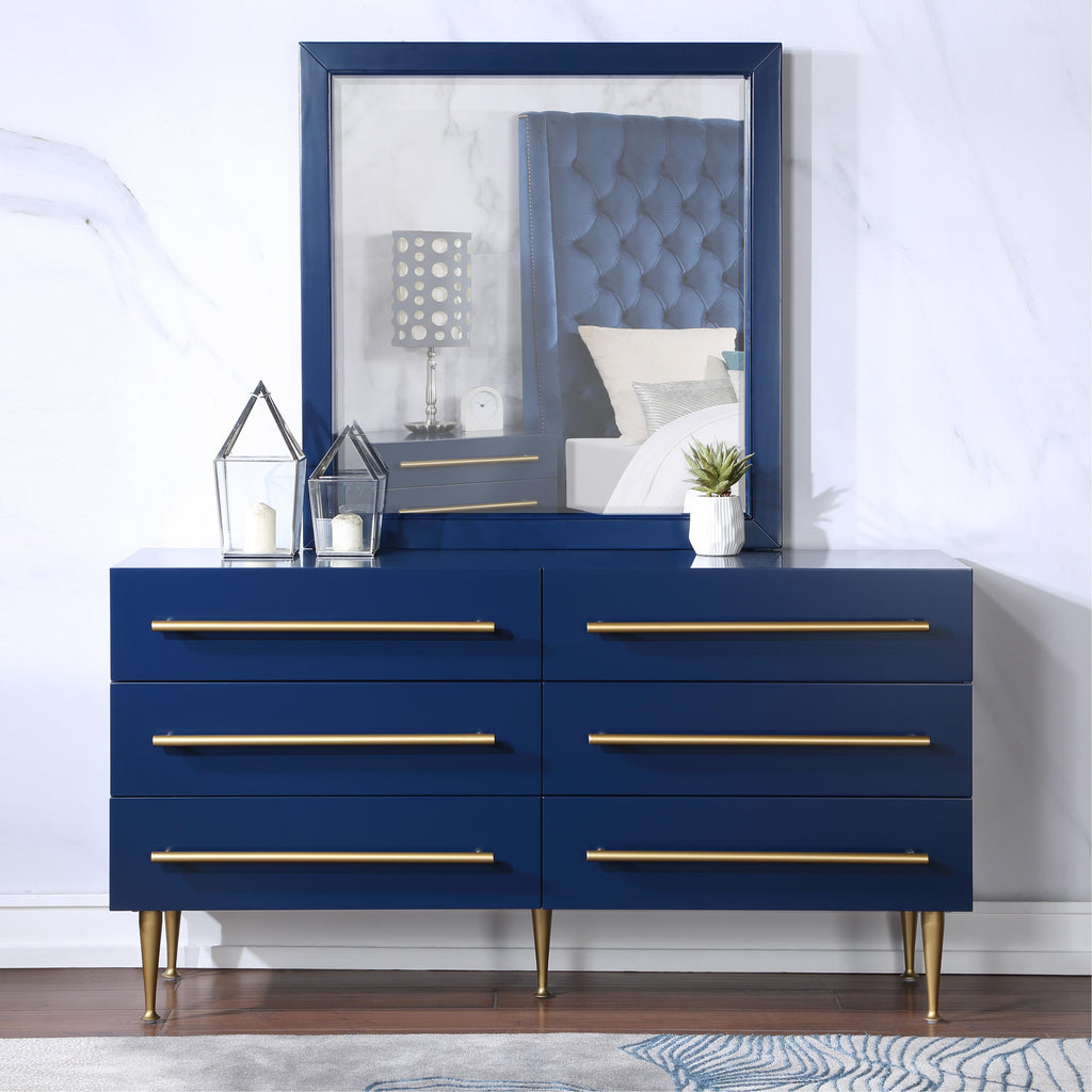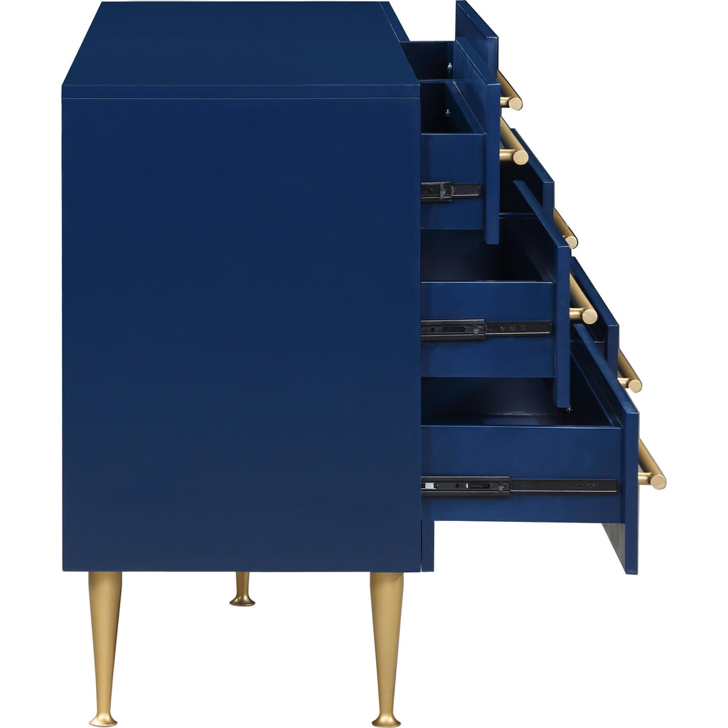 Turn to the Marisol dresser to make a big impression in your modern bedroom. This contemporary piece looks great on its own or paired with other items in the Marisol collection. Eye-catchingly elegant, this piece features a rich navy finish with brushed gold metal legs and handle for an up-to-the-minute vibe in your bedroom sanctuary. Minimalist hardware adds functionality without overpowering the unit. Wood construction adds to its durable design.