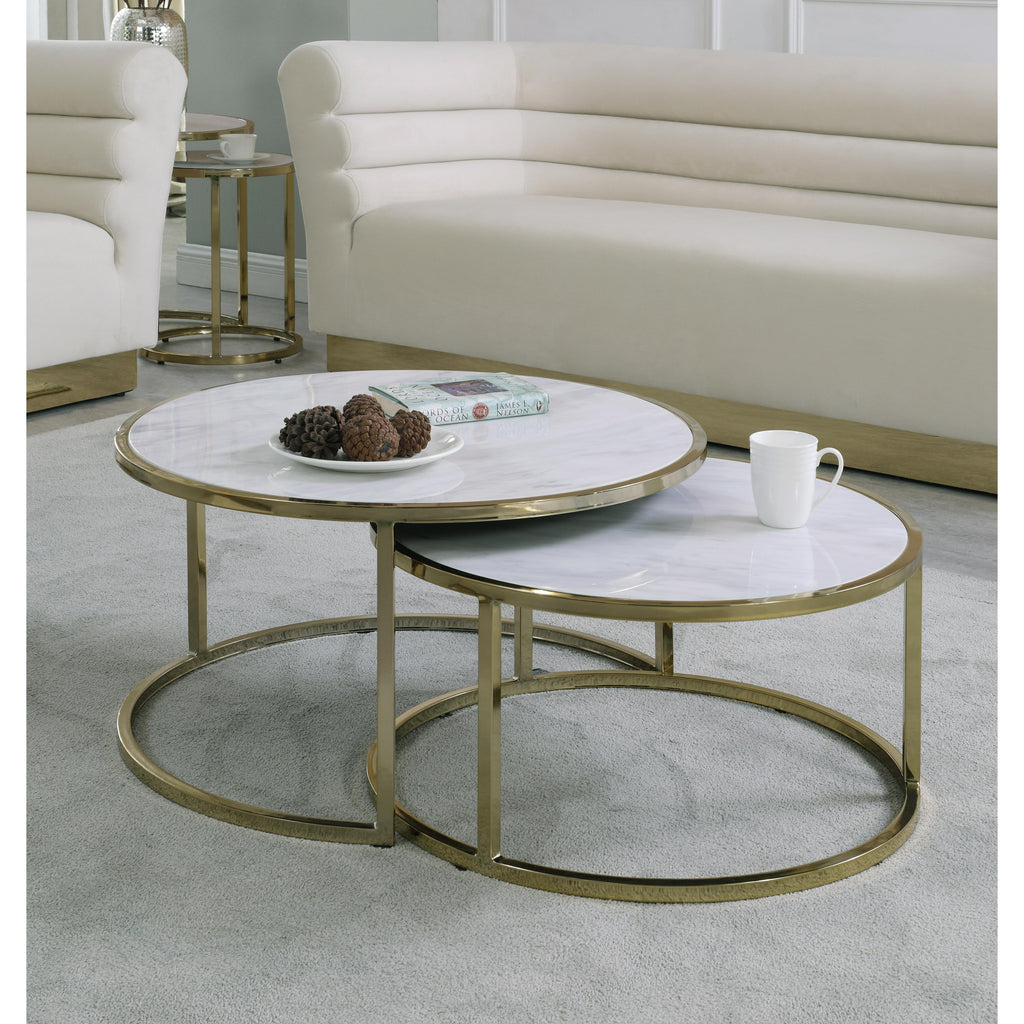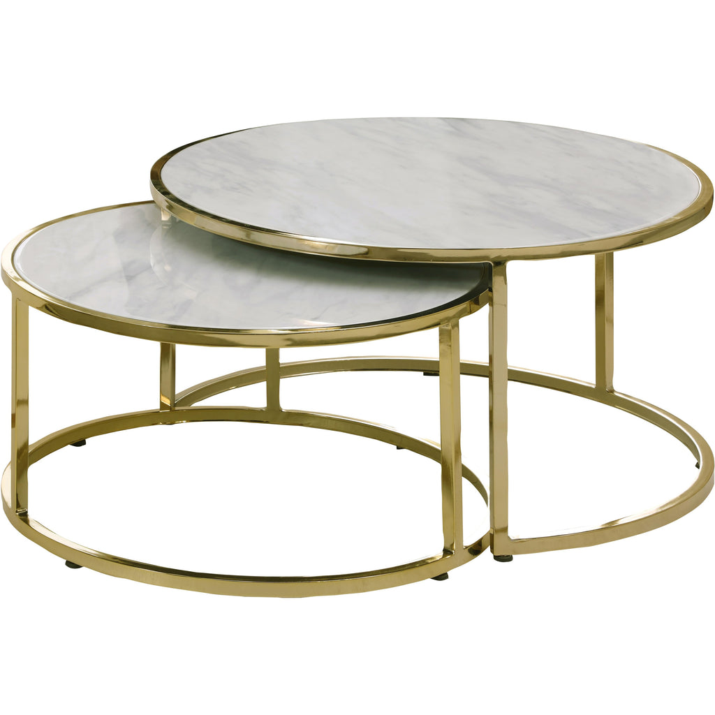 Double your coffee table space with this Massimo Nesting table Set. These two tables mesh together to save space, or pull out the lower table to increase your coffee table real estate. The faux marble neatly matches the gold steel legs. The gold also gives the table tops a beautiful curved edge for contemporary style. Both tables can be used independently of each other, so that you can place one at each end of your room.