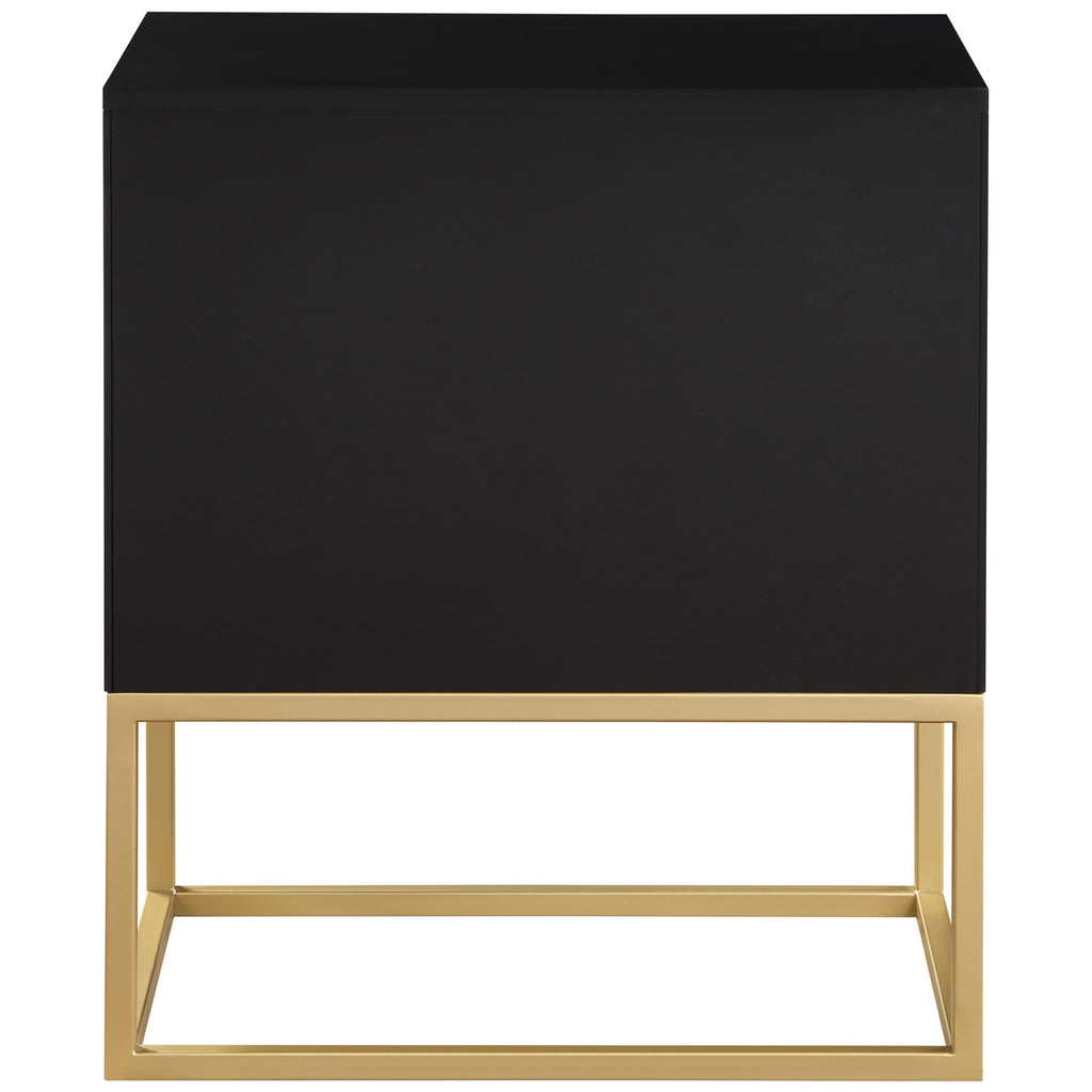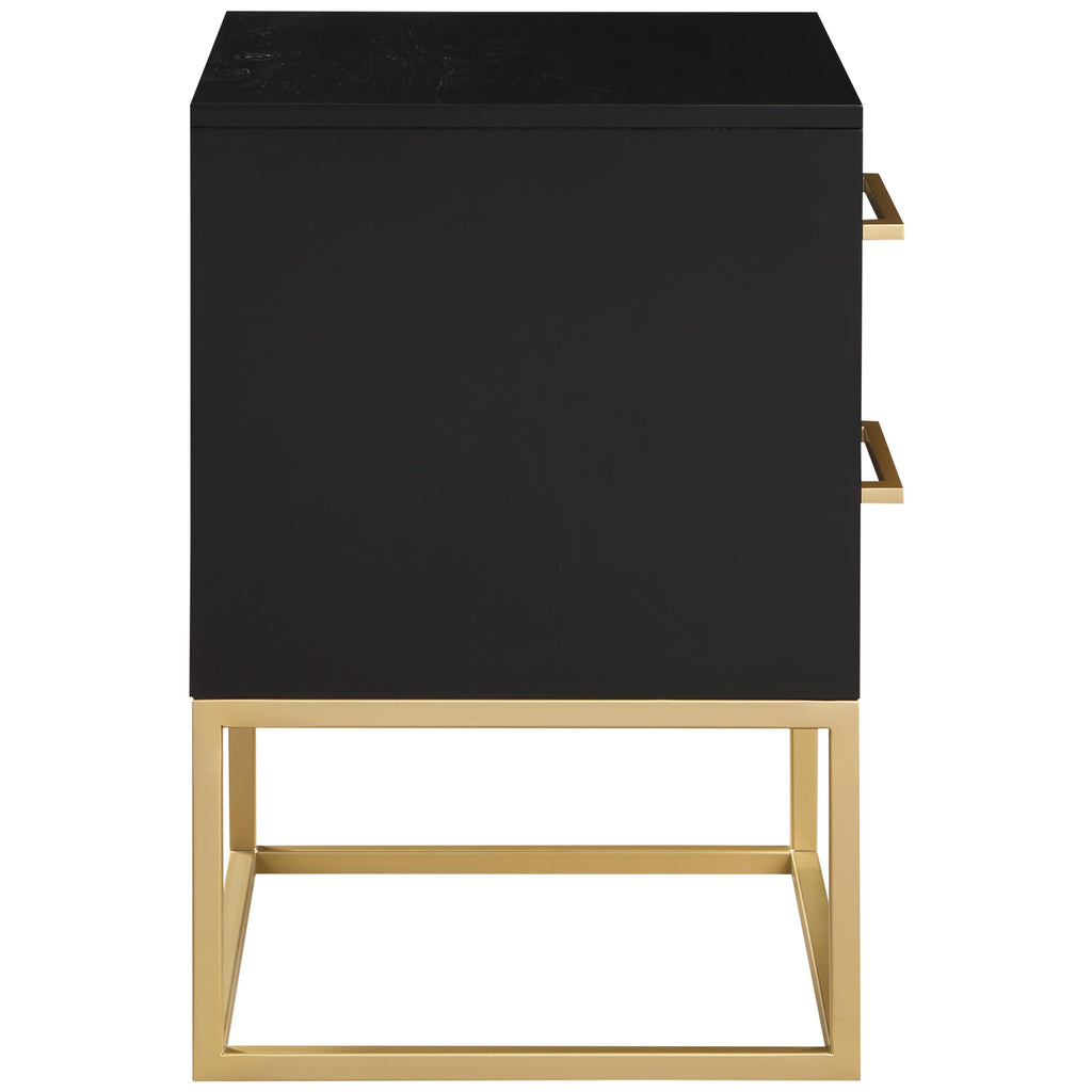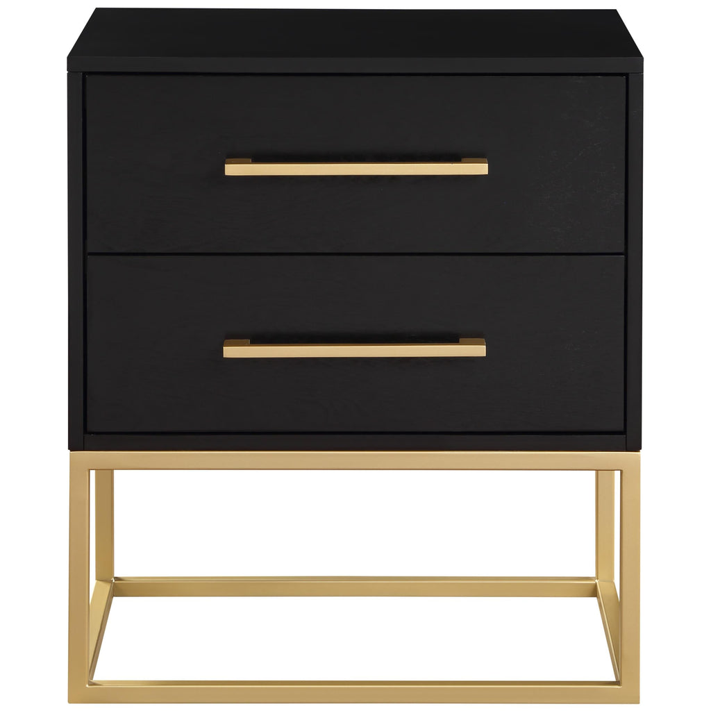 Inject bold, modern styling into your bedroom with this Maxine nightstand. The nightstand's contemporary design is nothing short of stunning, with unassuming lines and eye-grabbing hardware. A rich black finish is modish and up-to-the-minute, while the brushed gold metal legs and drawer handles give this unit added flair. A metal base raises the nightstand from the floor for a noticeably upscale vibe. Fill this nightstand's drawers with essentials for keeping your bedroom space clean and neat.