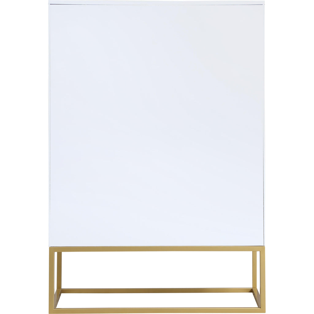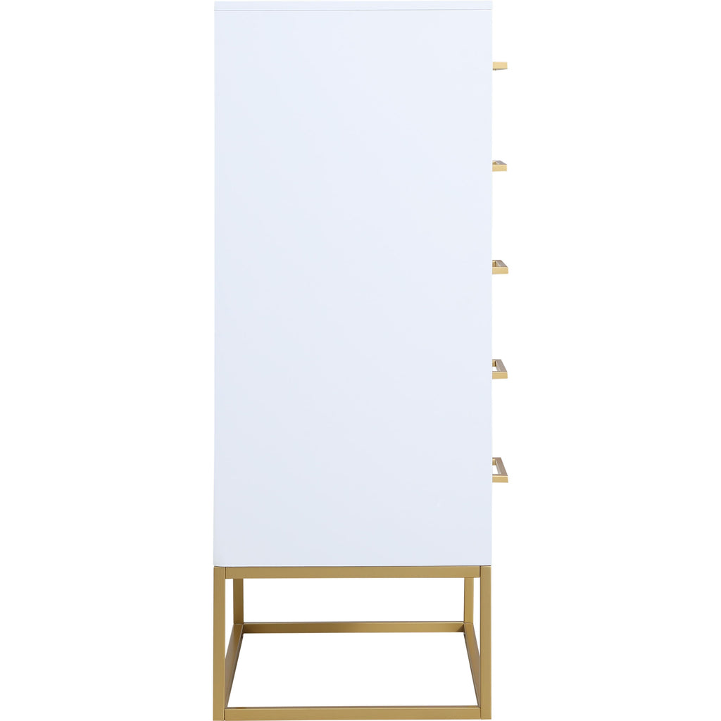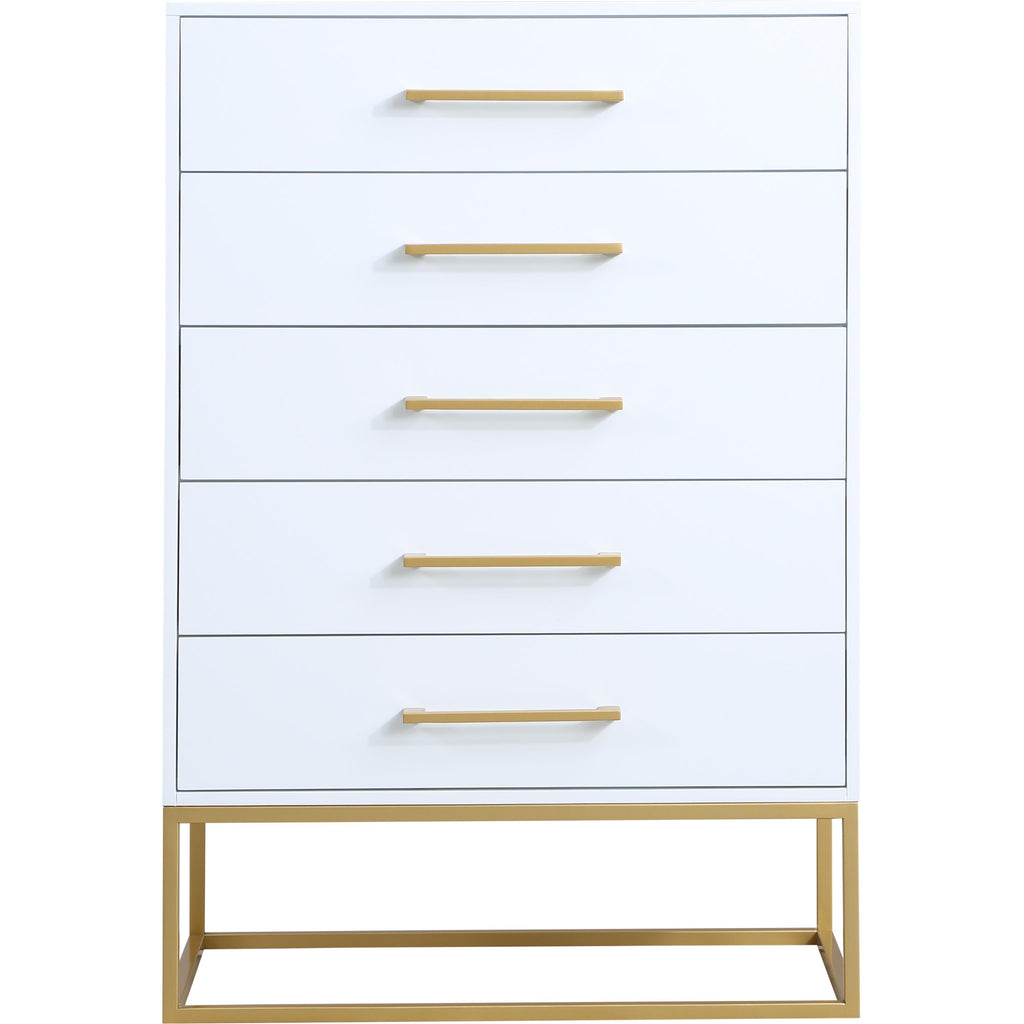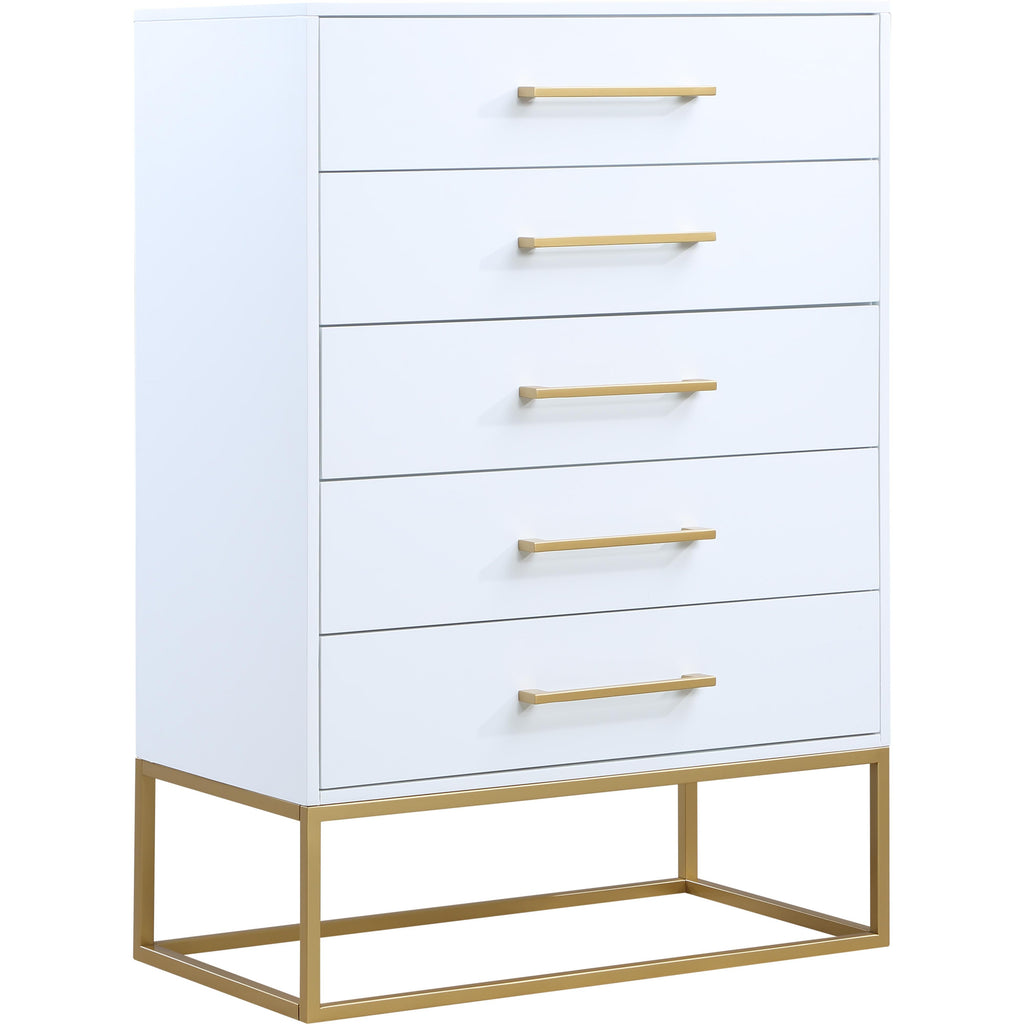 Outfit your space with this Maxine chest, part of the Maxine collection of contemporary bedroom furniture. This lovely chest features a rich white finish over birch veneer construction for durability, strength, and resilience, and it's equipped with brushed gold metal legs and hardware for a simplistic yet elegant finish. Pair this item with other bedroom essentials in the same collection for a beautiful look in your room.