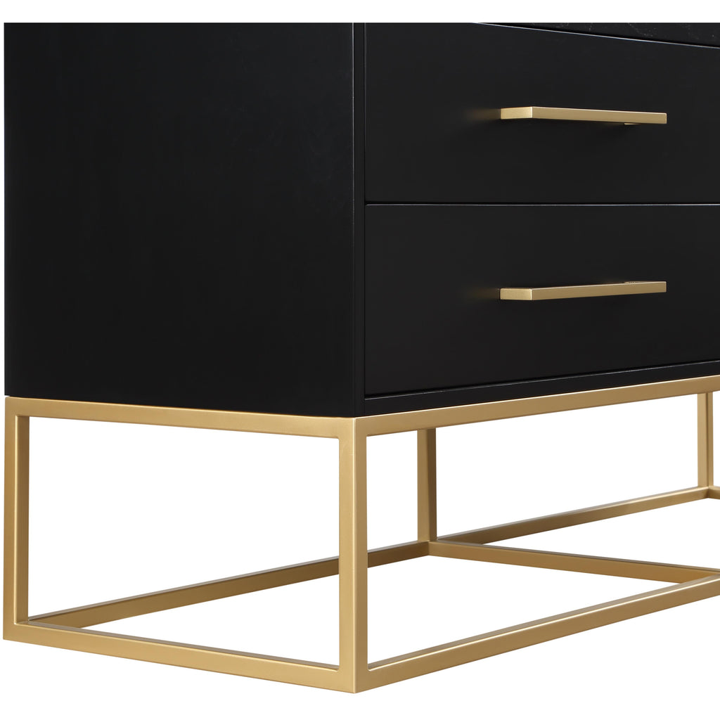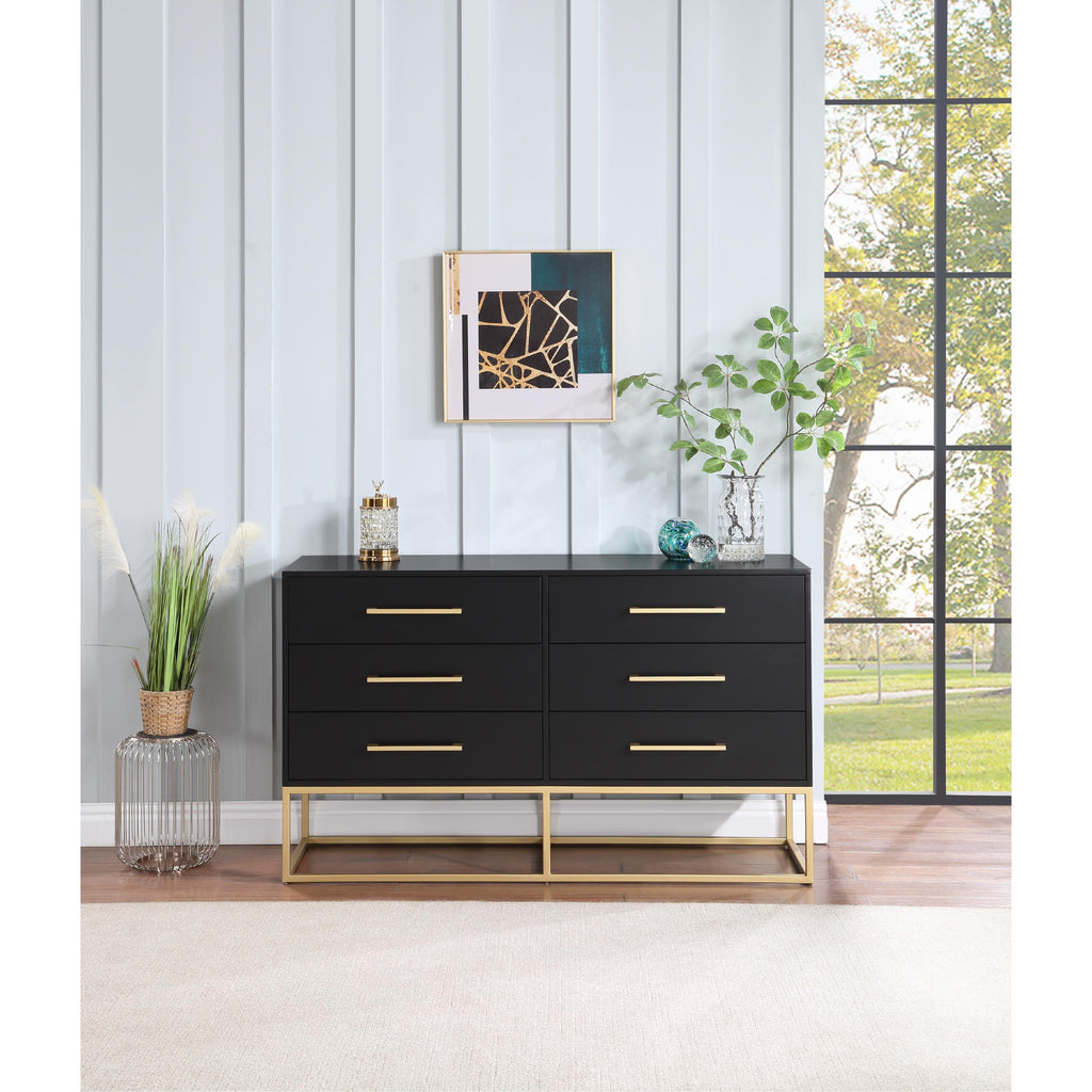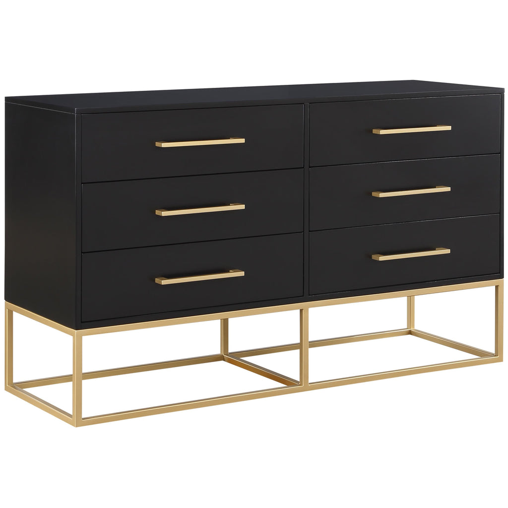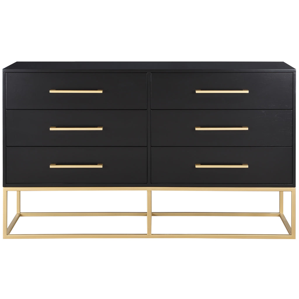 Inject bold, modern styling into your bedroom with this Maxine dresser. The dresser's contemporary design is nothing short of stunning, with unassuming lines and eye-grabbing hardware. A rich black finish is modish and up-to-the-minute, while the brushed gold metal legs and drawer handles give this unit added flair. A metal base raises the dresser from the floor for a noticeably upscale vibe. Fill this dresser's drawers with essentials for keeping your bedroom space clean and neat.