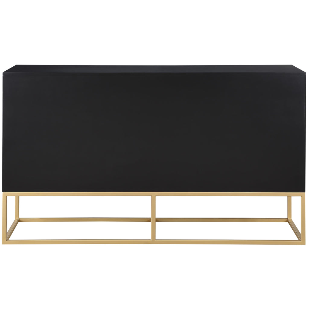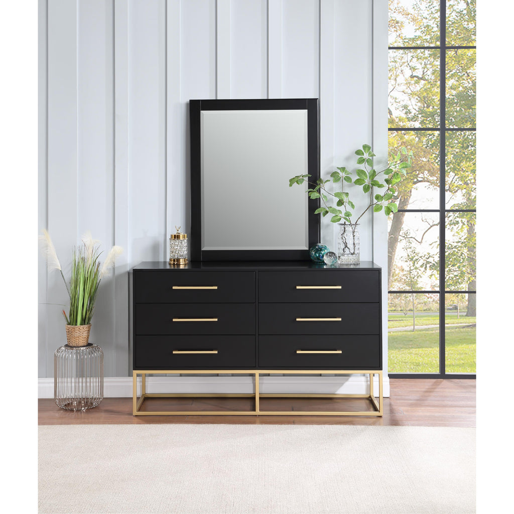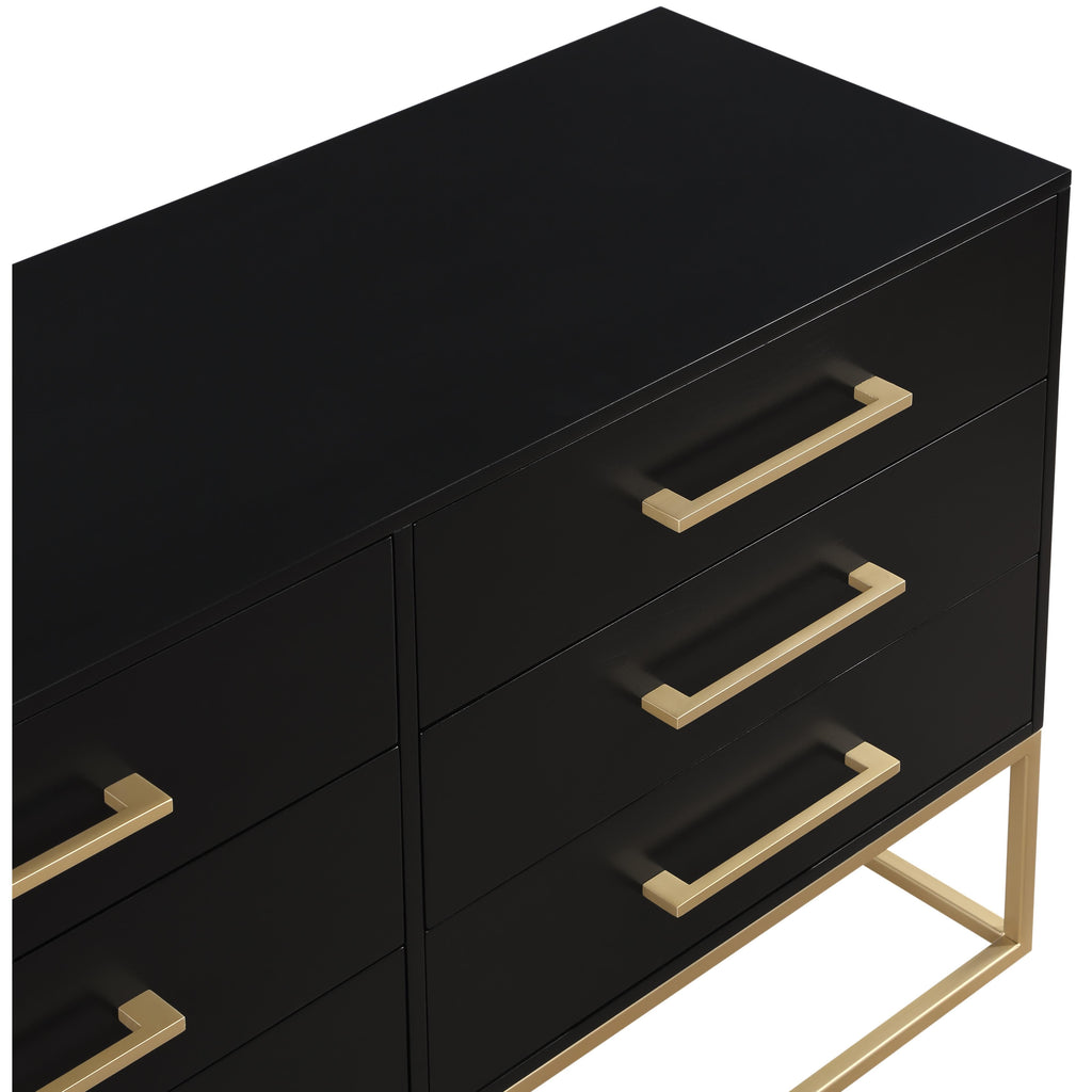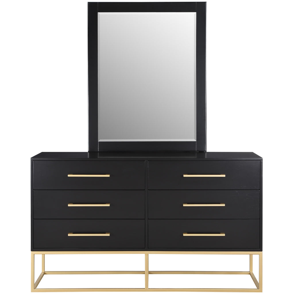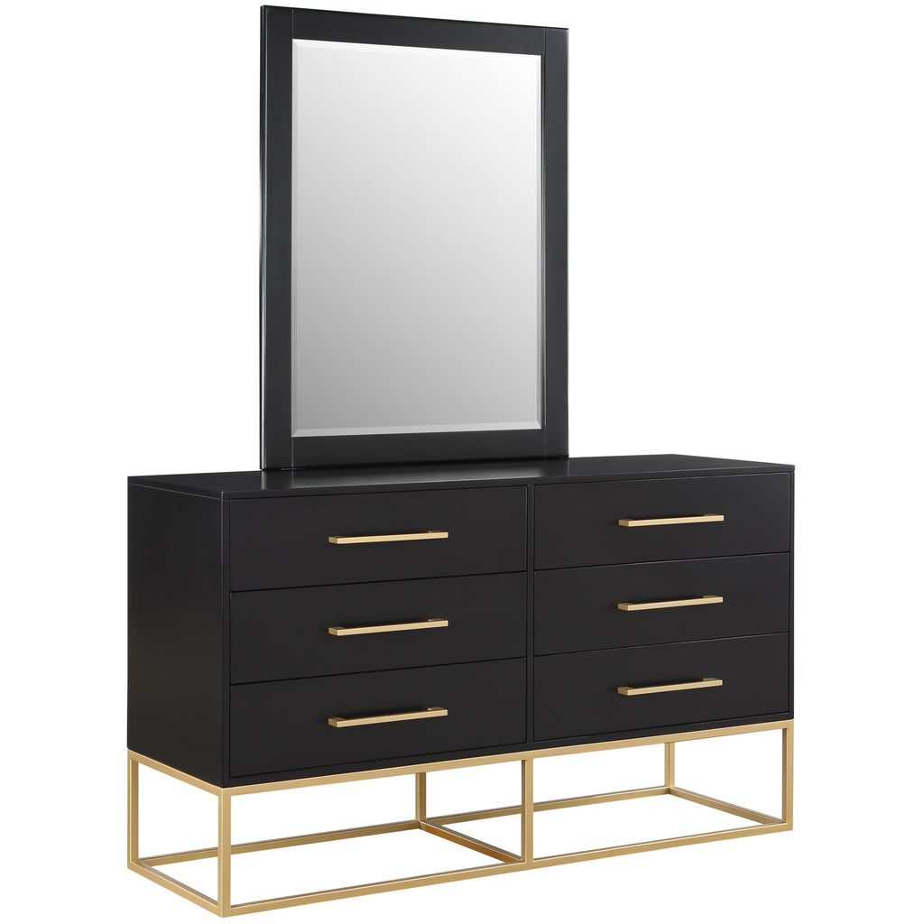 Inject bold, modern styling into your bedroom with this Maxine dresser. The dresser's contemporary design is nothing short of stunning, with unassuming lines and eye-grabbing hardware. A rich black finish is modish and up-to-the-minute, while the brushed gold metal legs and drawer handles give this unit added flair. A metal base raises the dresser from the floor for a noticeably upscale vibe. Fill this dresser's drawers with essentials for keeping your bedroom space clean and neat.