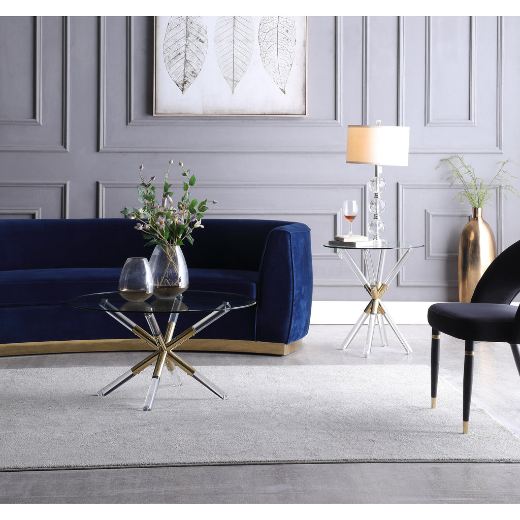 Bring modern pizzazz to your living room with this Mercury Acrylic Gold Coffee Table by Meridian Furniture. The base features a pedestal design with acrylic gold legs for a touch of contemporary fun. The tempered glass top offers plenty of room for holding items like framed pictures or magazines. The top is clear, so you can easily see the beauty of the metallic legs showing through, giving your living room or den a little something extra.