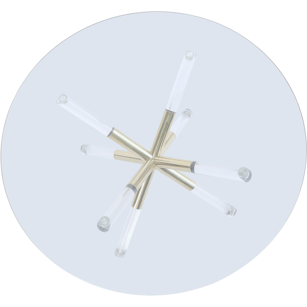 Bring modern pizzazz to your living room with this Mercury Acrylic Gold End Table by Meridian Furniture. The base features a pedestal design with acrylic gold legs for a touch of contemporary fun. The tempered glass top offers plenty of room for holding items like framed pictures or magazines. The top is clear, so you can easily see the beauty of the metallic legs showing through, giving your living room or den a little something extra.