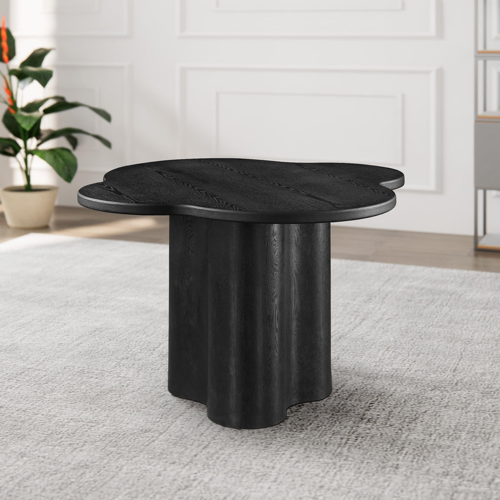 Bring a bold new look to your space with this Mesa Black Dining Table. Crafted with ash veneer and featuring a captivating black finish, this table exudes elegance and sophistication. The unique clover-shaped table top is not only visually striking but also adds an intriguing element to your decor. With its bold design and sleek construction, this dining table is a perfect addition to your modern home.