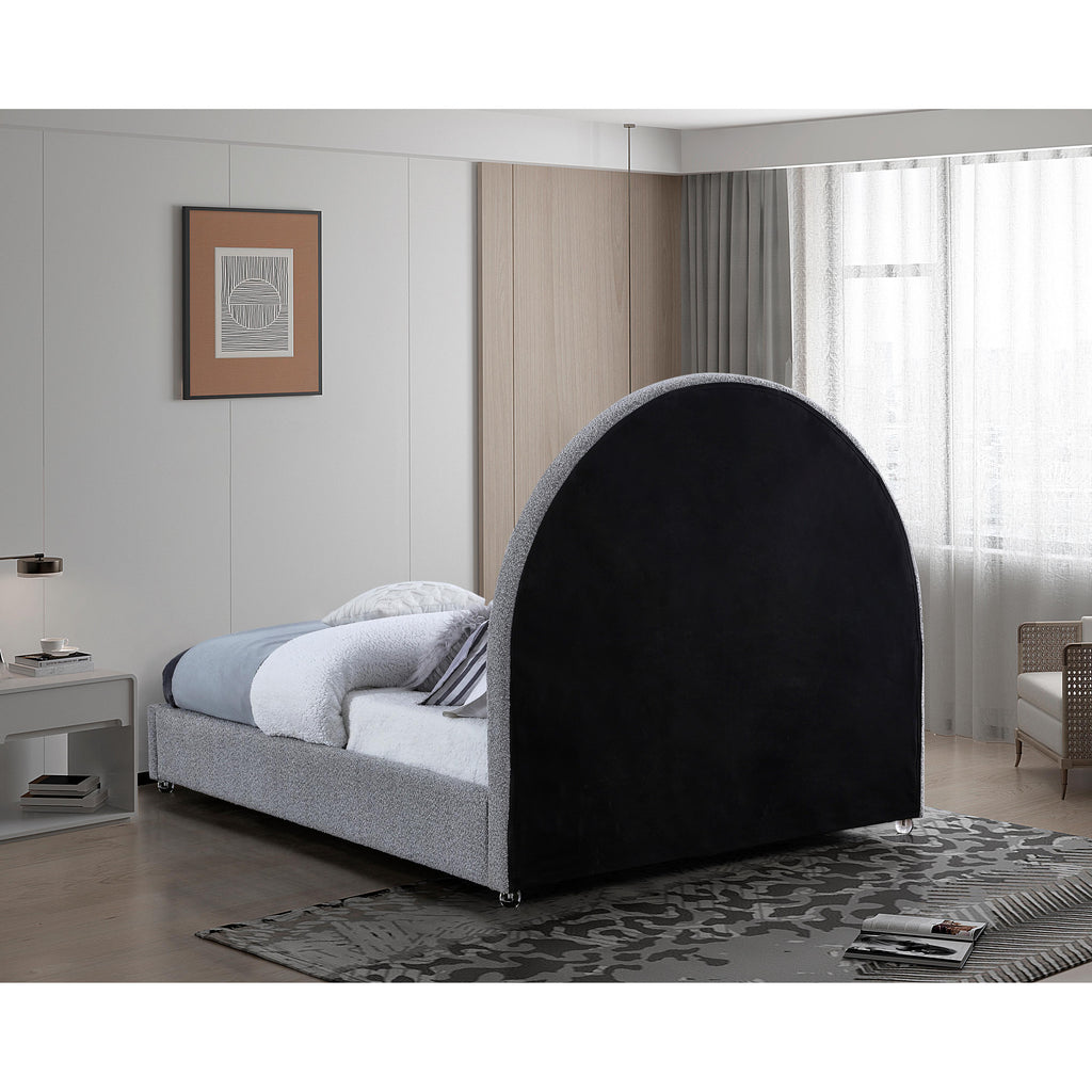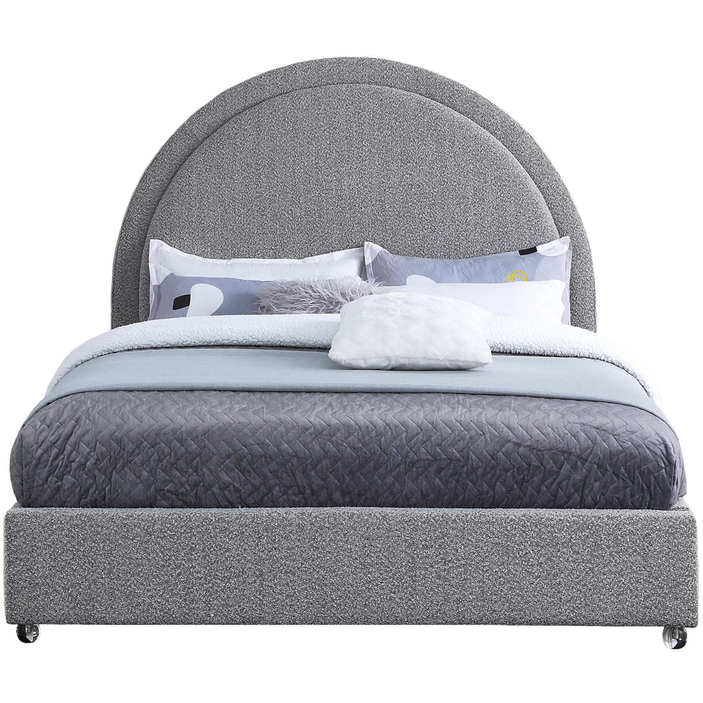 Get ready for compliments when you add this Milo boucle fabric bed to your space. It's upholstered head to foot in rich grey boucle fabric, so it's soft to the touch and regal to the eye. The star of the show is the bed's rounded headboard, which stretches out tall above you for a look that oozes regality and sophisticated charm. Acrylic legs give the bed a somewhat modern finish.