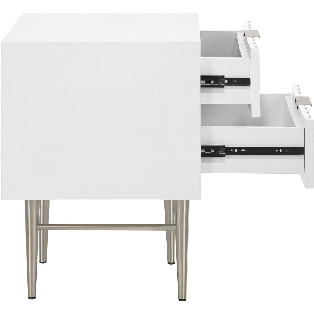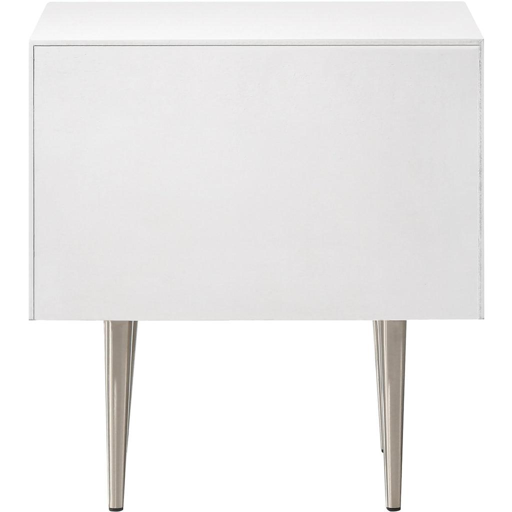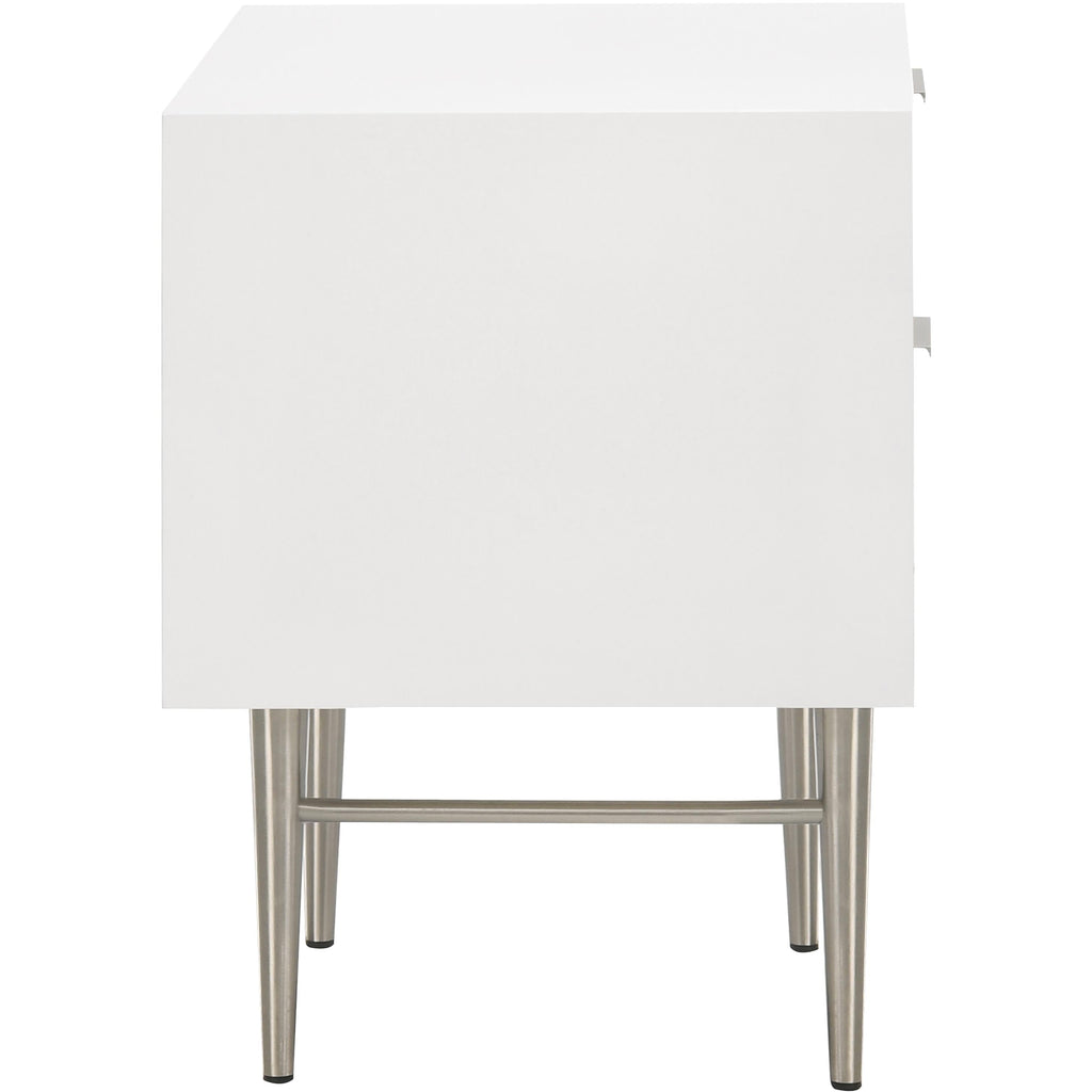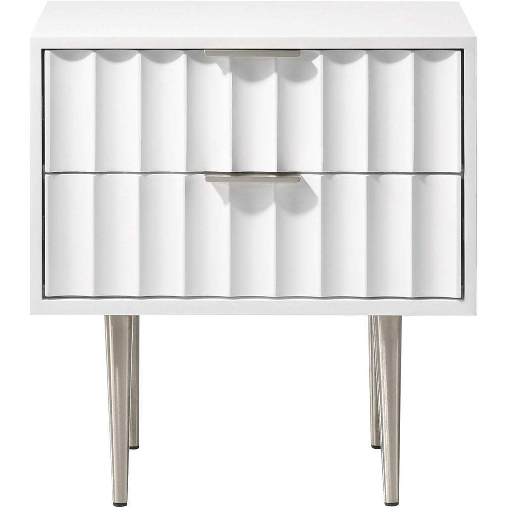 Embody industrialist style with this Modernist night stand in a white medium gloss finish. Utilitarian but sculptural in design, this piece features a ridged, textured look that is chic but sleek. It rests on brushed chrome steel legs and has chrome brushed handles for a bit of regality. Combine this piece with other items in the Modernist lineup for a cohesive finish to your room makeover.
