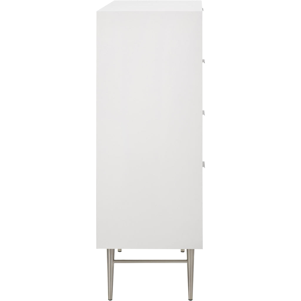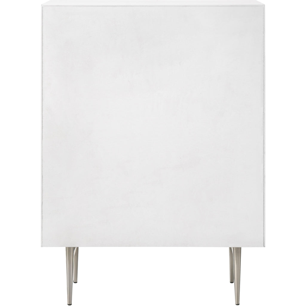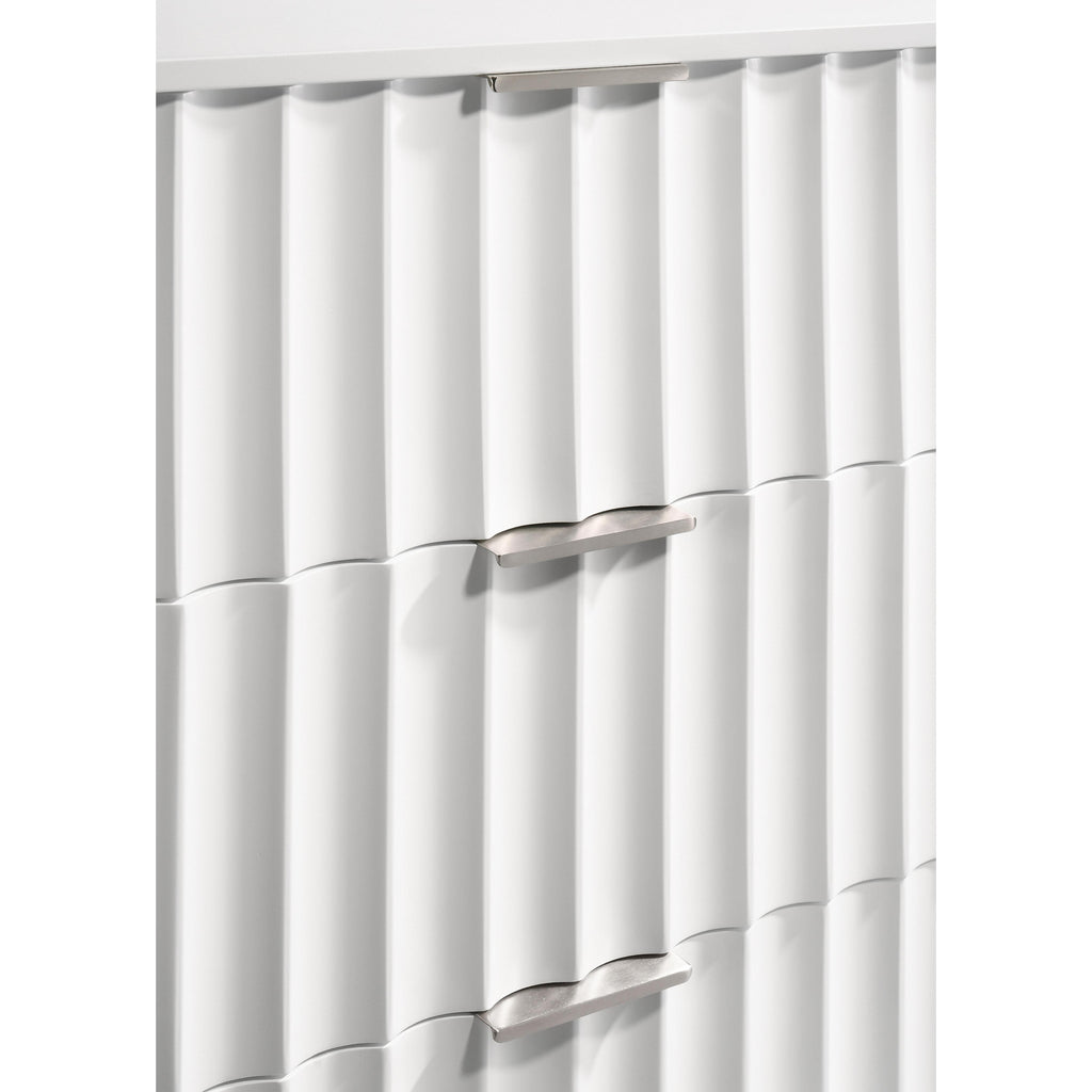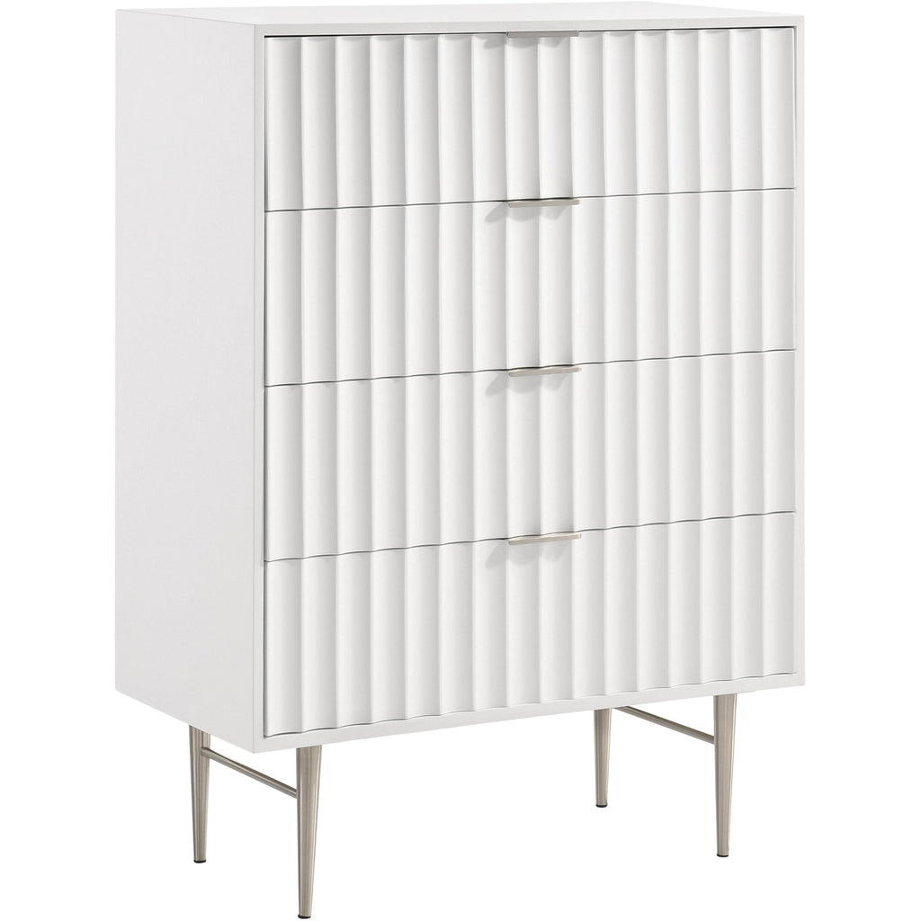 Embody industrialist style with this Modernist chest in a white medium gloss finish. Utilitarian but sculptural in design, this piece features a ridged, textured look that is chic but sleek. It rests on brushed chrome steel legs and has chrome brushed handles for a bit of regality. Combine this piece with other items in the Modernist lineup for a cohesive finish to your room makeover.