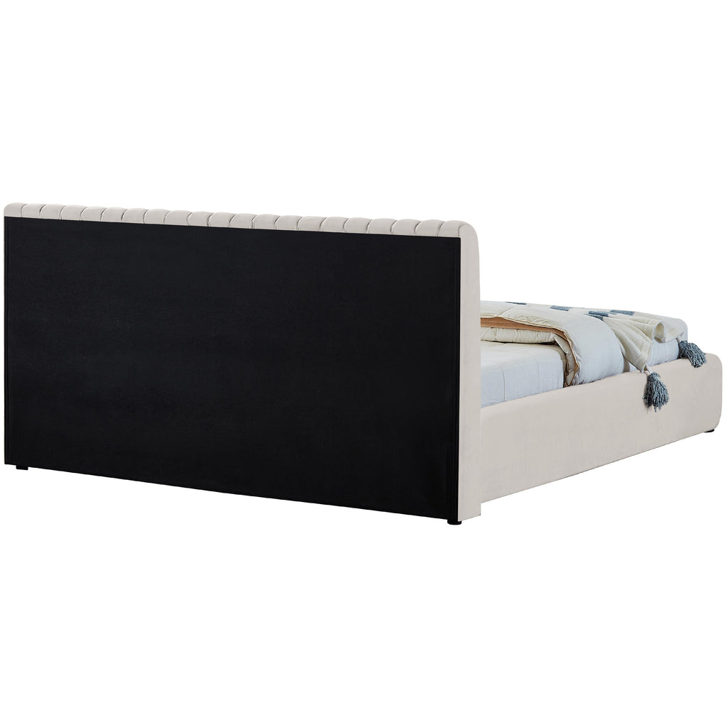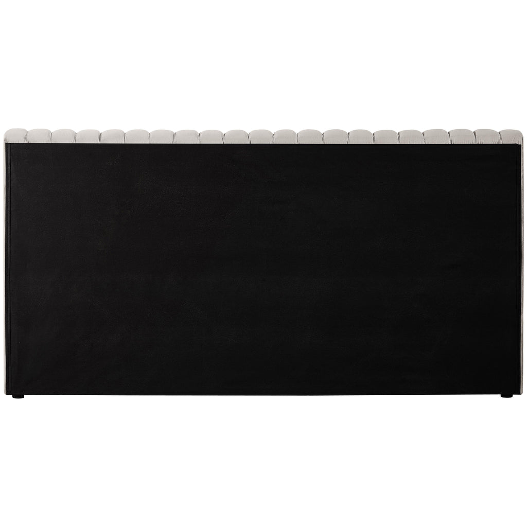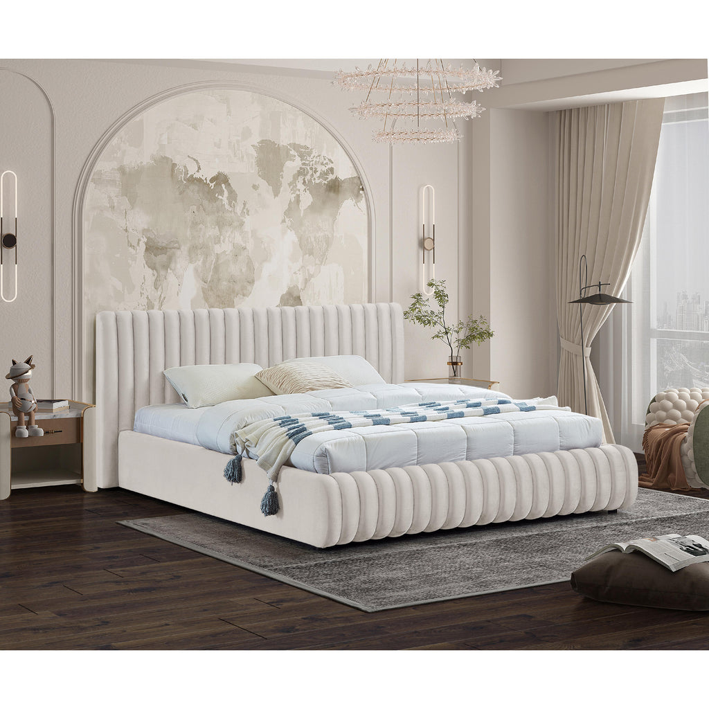 Bring upscale modernity to your bedroom space with this stunningly elegant, sumptuously appointed Nico bed. This queen bed has deep vertical channel tufting on the headboard and footboard, adding textural beauty that instantly catches the eye. The entire bed is upholstered in cream velvet for a luxurious design that makes the bed the star of the show. A padded headboard supports your back while you binge watch TV in bed or read a book.