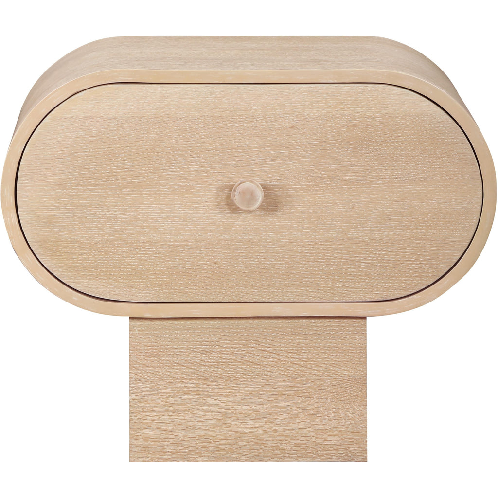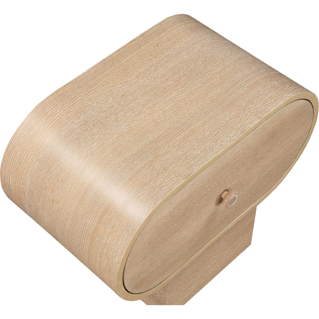 Slumber well knowing the things you need most at night are tucked out of sight and within easy reach with this Harlow natural nightstand. Its rich natural finish and oak veneer, crafted from a mix of solid wood and MDF, embody art deco elegance. Featuring natural wood grain variation, each piece is uniquely beautiful. A single drawer with an attractive pull offers discreet storage, blending practicality with timeless design. Enhance your bedroom with this sophisticated accent that combines function with exquisite craftsmanship.