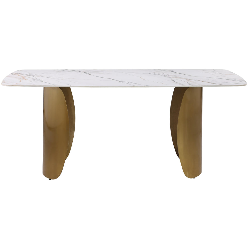Make even the most casual meals an elegant affair when guests gather around this Niya dining table. This handsome table is part art, part dining room must-have, with its elegant yet durable white marble-look sintered stone top and its brushed gold curve bases. Diners have loads of elbow room at this large dining table, so they stay cozy from appetizers through dessert. Add the chairs of your choice for a complete dining room rehab in an instant.