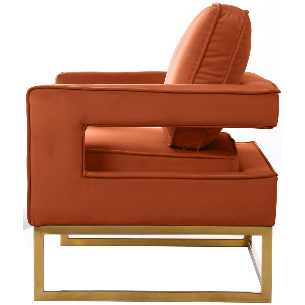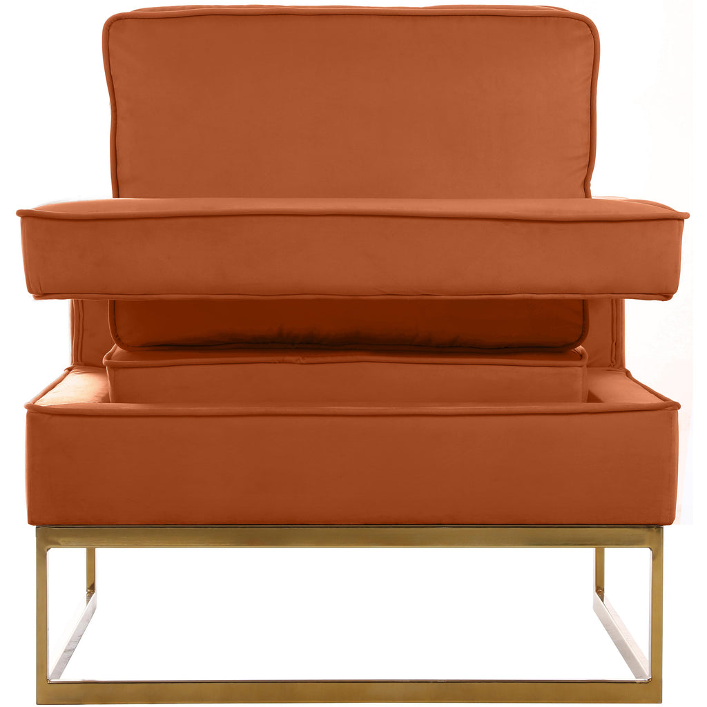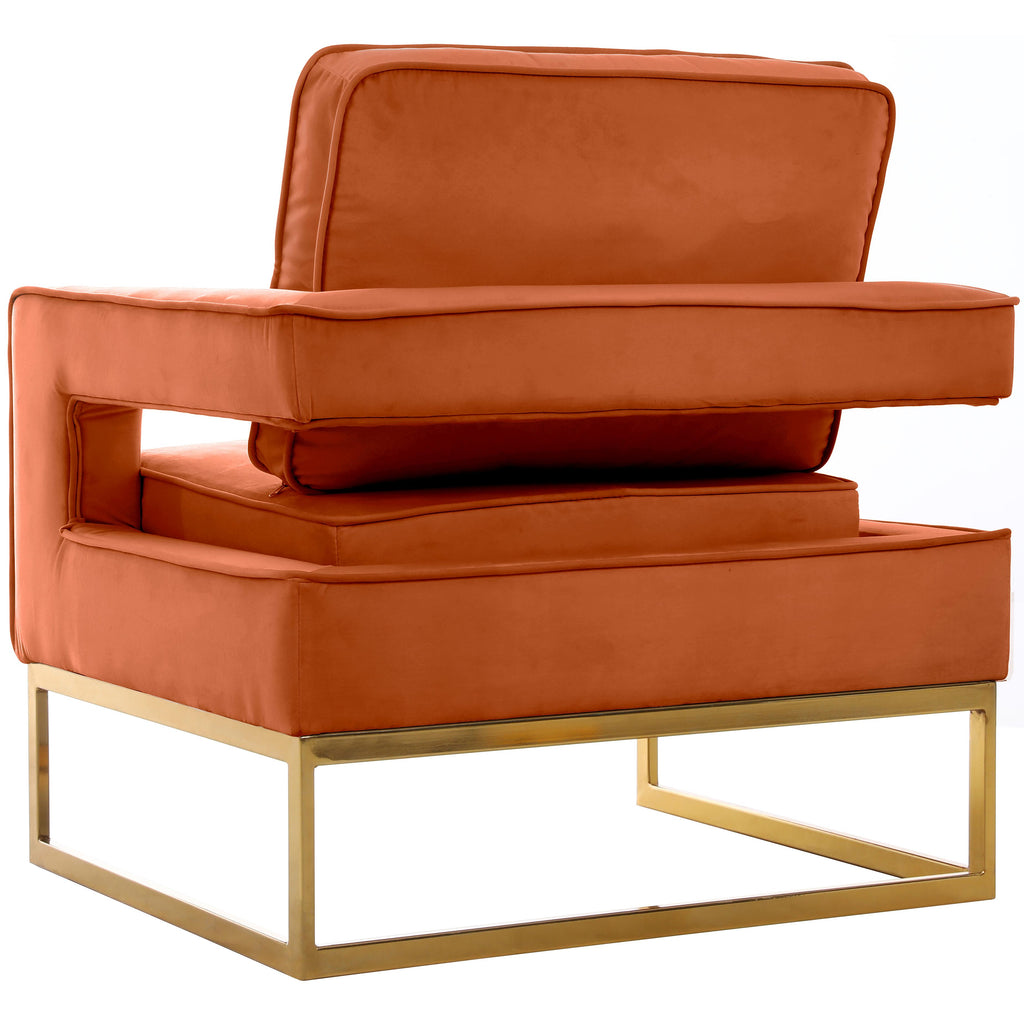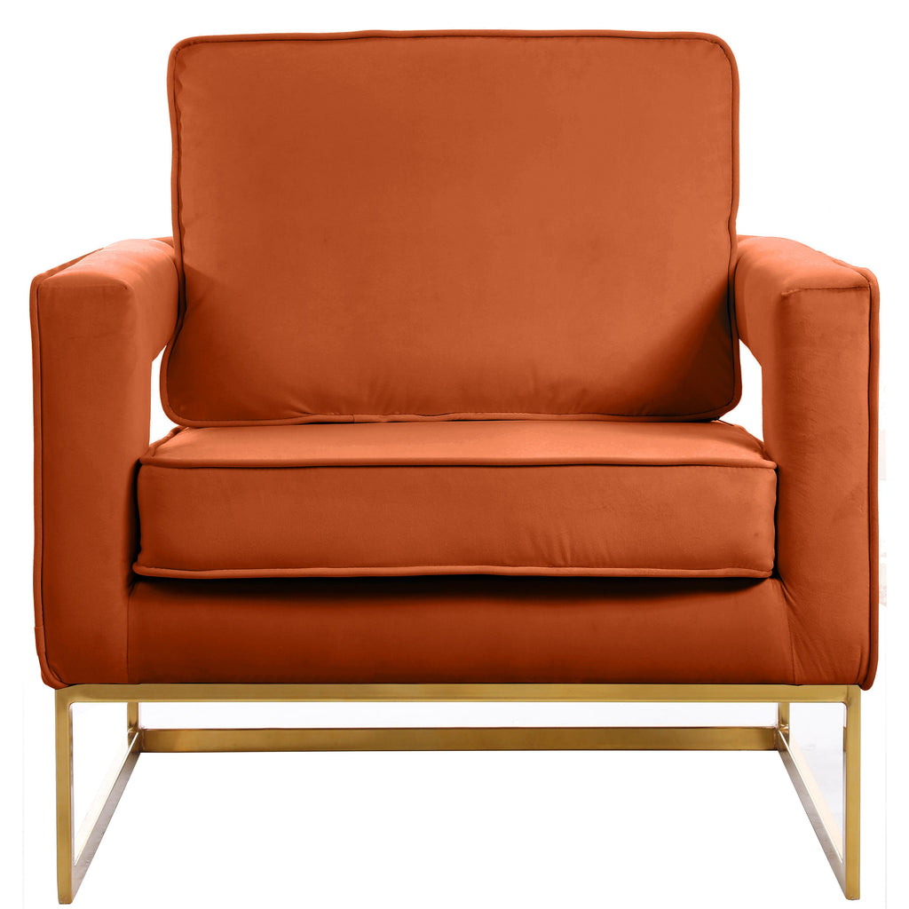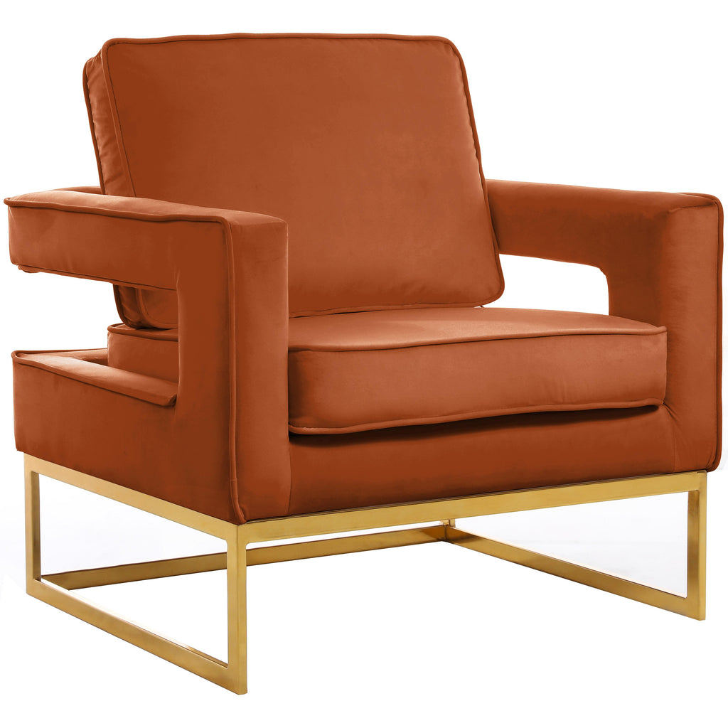 Kick back and relax in style with this eye-catching Noah cognac velvet accent chair. Featuring a unique, sleek modern design, this chair's cognac velvet upholstery and gold iron base is both plush and durable. The chair's cushion is padded with high-density foam, ensuring absolute comfort while you sit and read or watch TV.