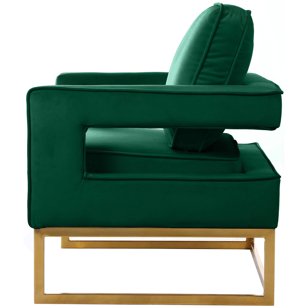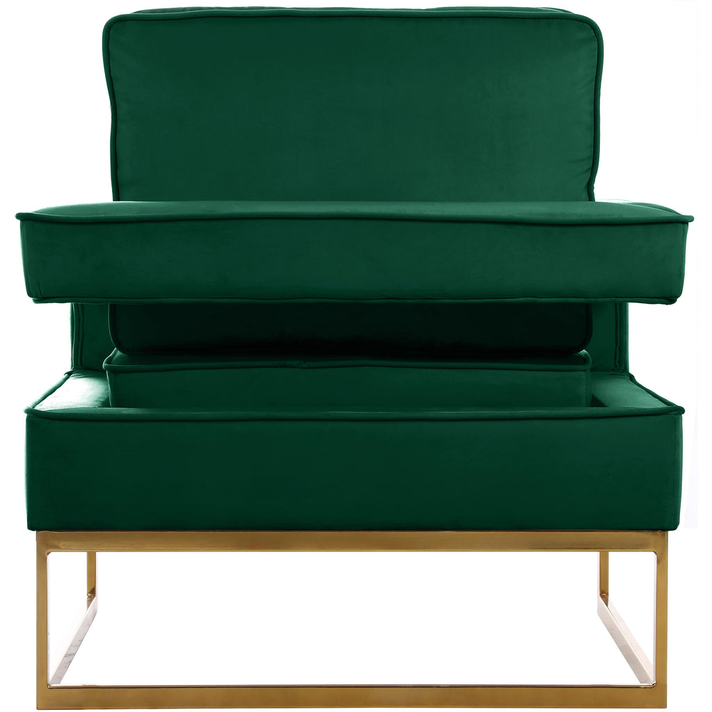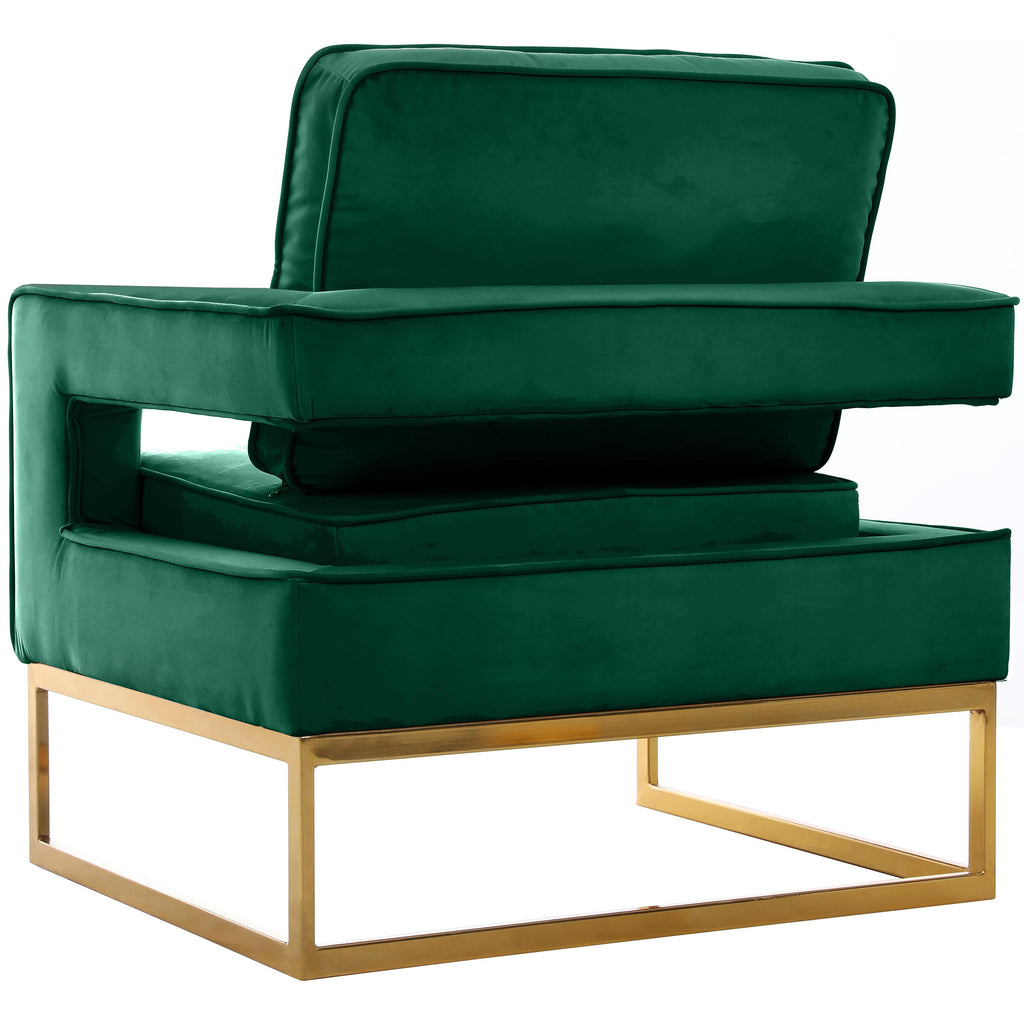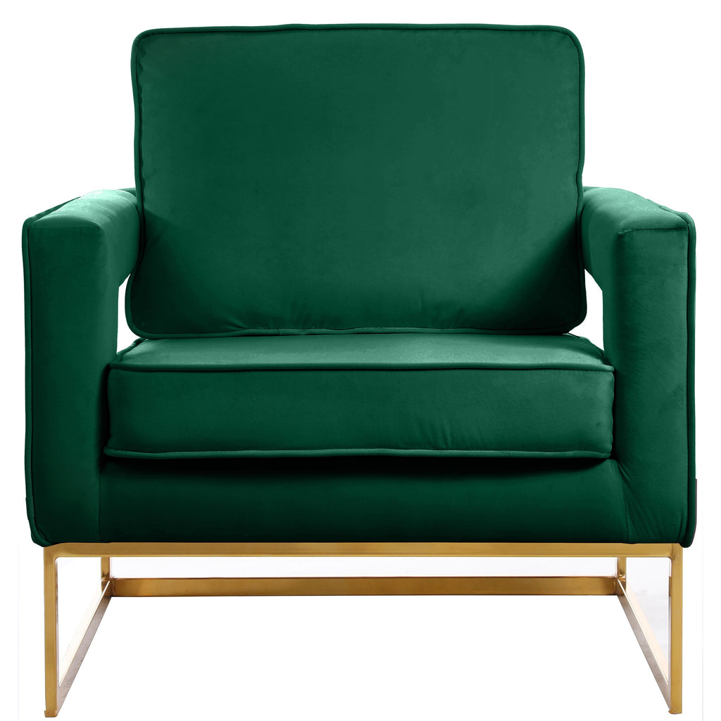 Kick back and relax in style with this eye-catching Noah green velvet accent chair. Featuring a unique, sleek modern design, this chair's green velvet upholstery and gold stainless steel base is both plush and durable. The chair's cushion is padded with high-density foam, ensuring absolute comfort while you sit and read or watch TV.