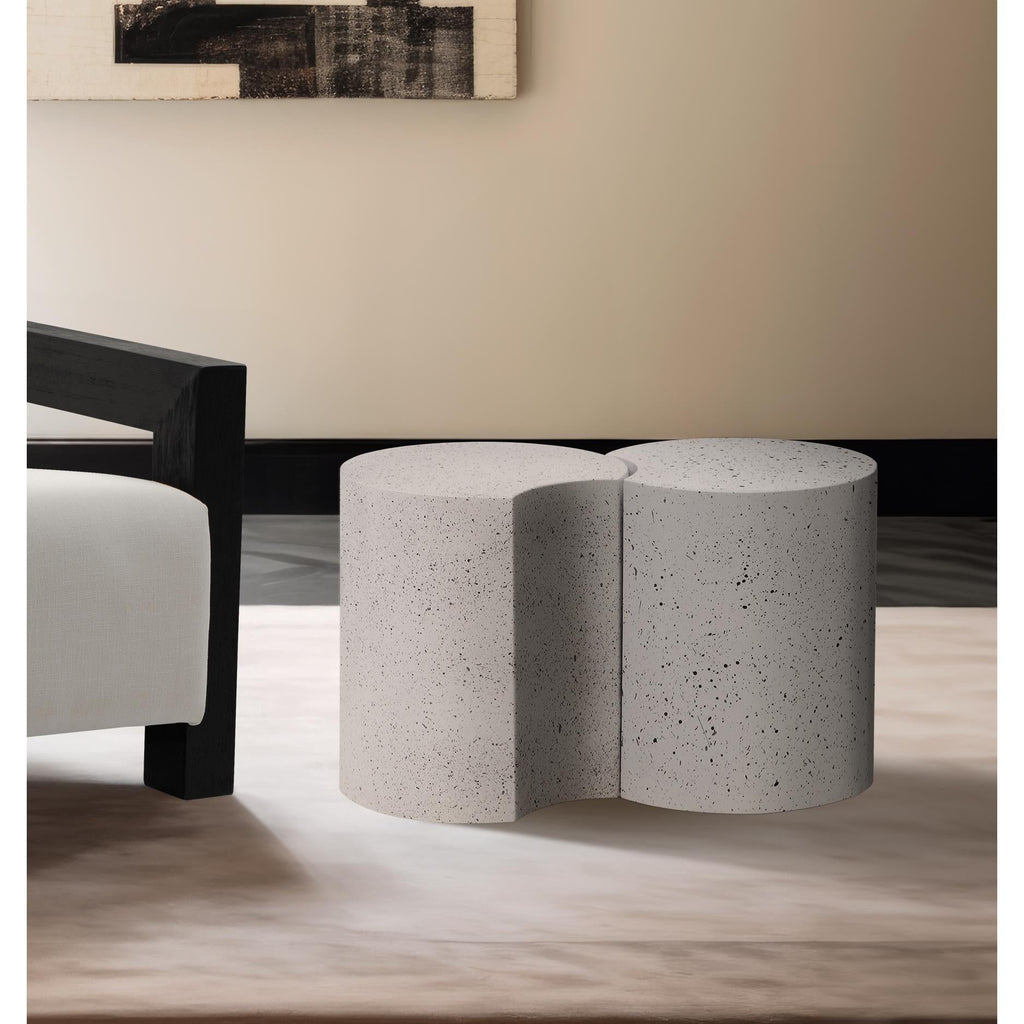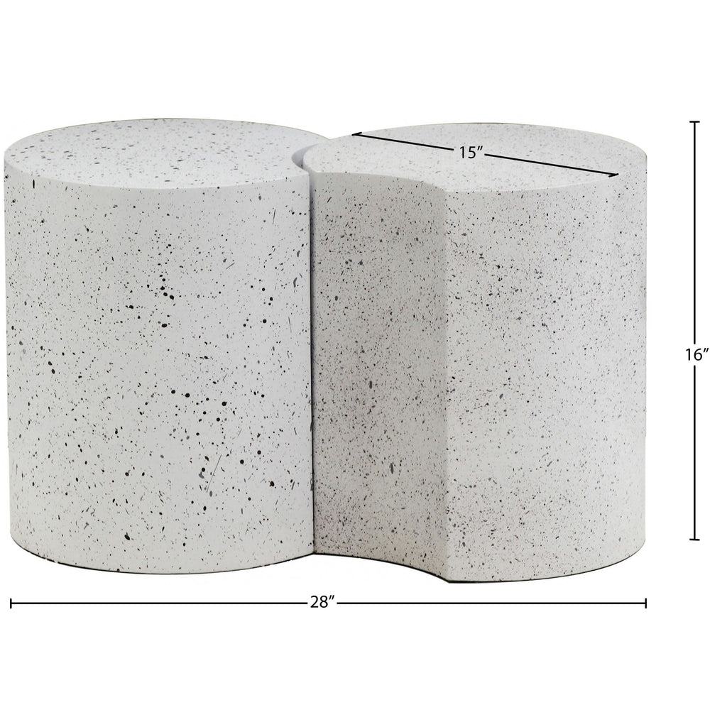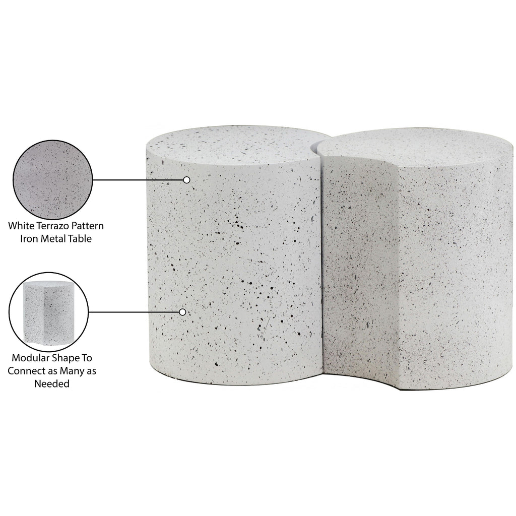 Beautify your room with this Dimple white end table. Crafted from white terrazo patterned iron metal, its modular shape allows you to connect as many as needed, offering versatility and style. With a contemporary nesting design, it adapts effortlessly to various spaces, whether used individually or in clusters. Perfect for adding both functionality and a modern aesthetic to your living area, this table promises to be a chic addition that enhances organization and visual appeal in any setting.
