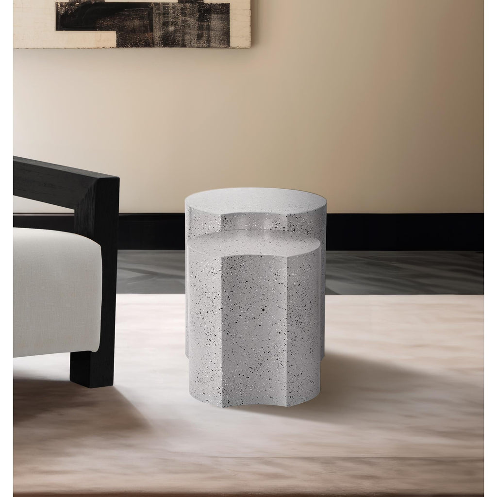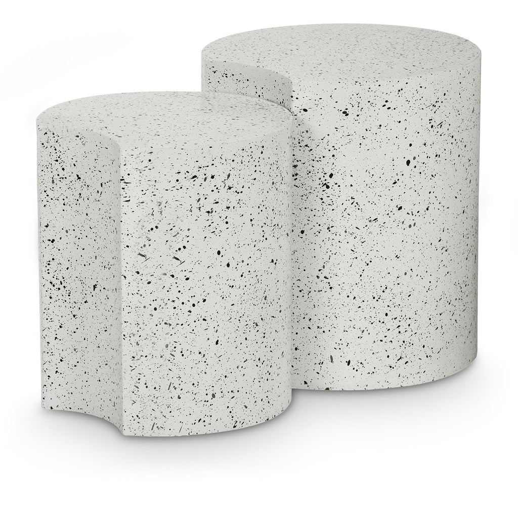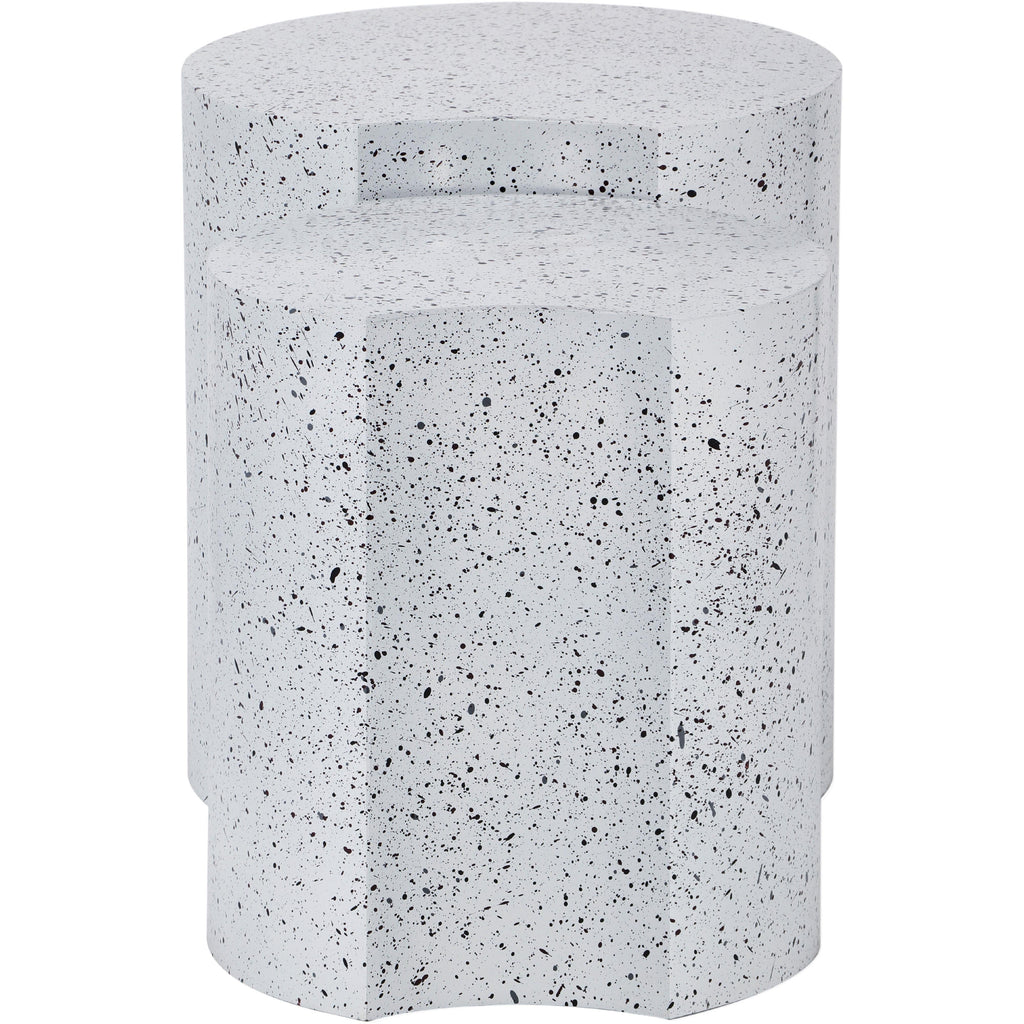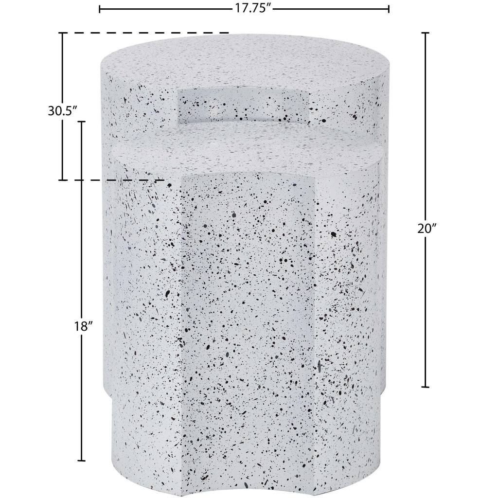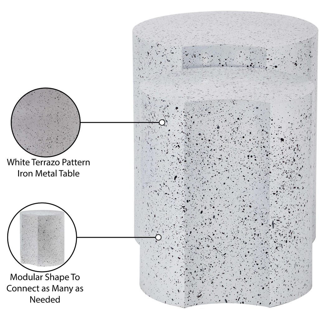Beautify your room with this Dimple white end table. Crafted from white terrazo patterned iron metal, its modular shape allows you to connect as many as needed, offering versatility and style. With a contemporary nesting design, it adapts effortlessly to various spaces, whether used individually or in clusters. Perfect for adding both functionality and a modern aesthetic to your living area, this table promises to be a chic addition that enhances organization and visual appeal in any setting.