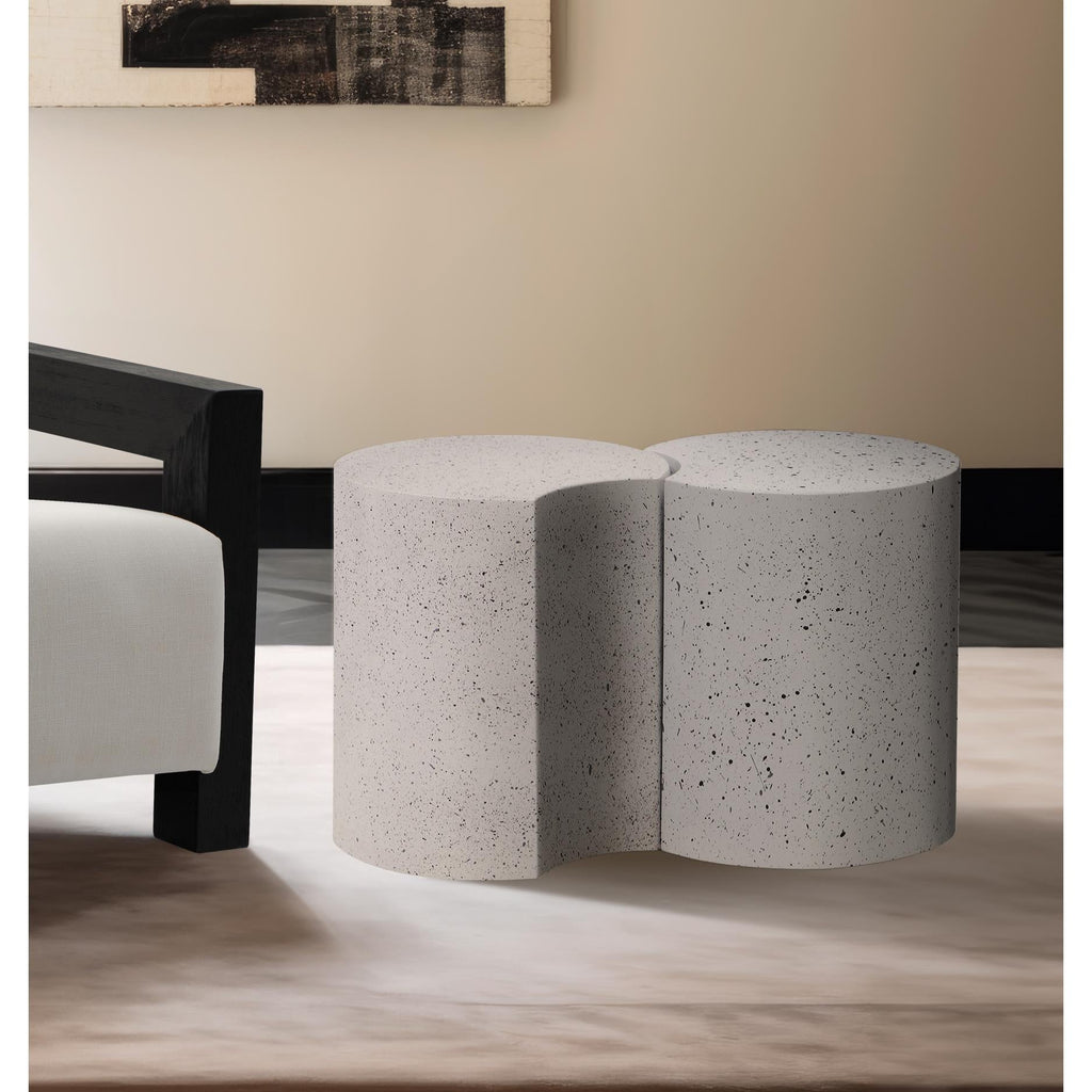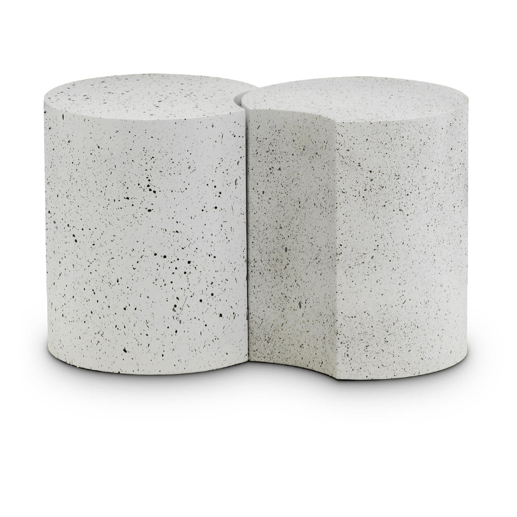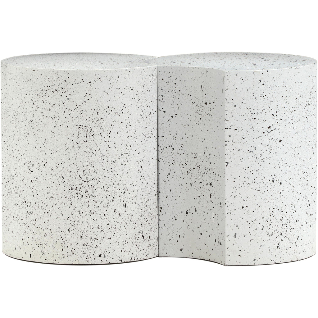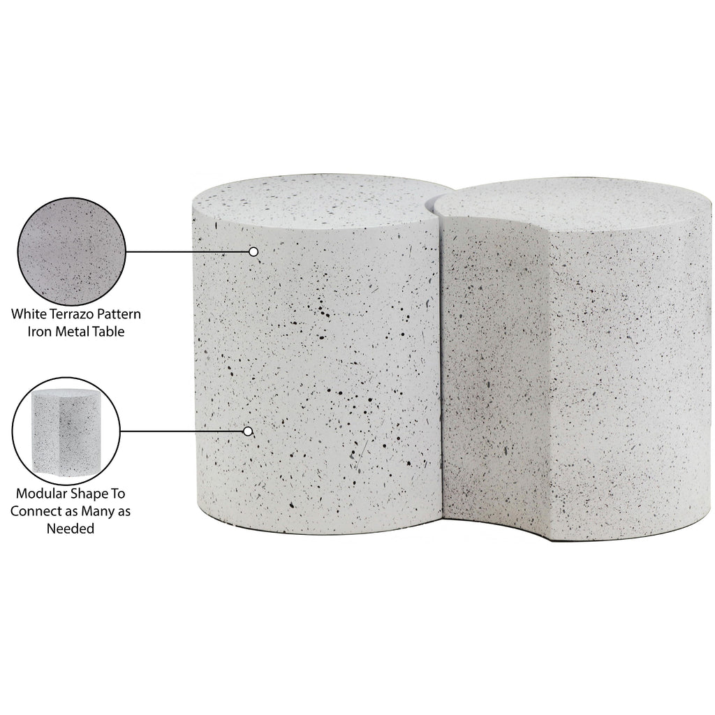 Beautify your room with this Dimple white end table. Crafted from white terrazo patterned iron metal, its modular shape allows you to connect as many as needed, offering versatility and style. With a contemporary nesting design, it adapts effortlessly to various spaces, whether used individually or in clusters. Perfect for adding both functionality and a modern aesthetic to your living area, this table promises to be a chic addition that enhances organization and visual appeal in any setting.