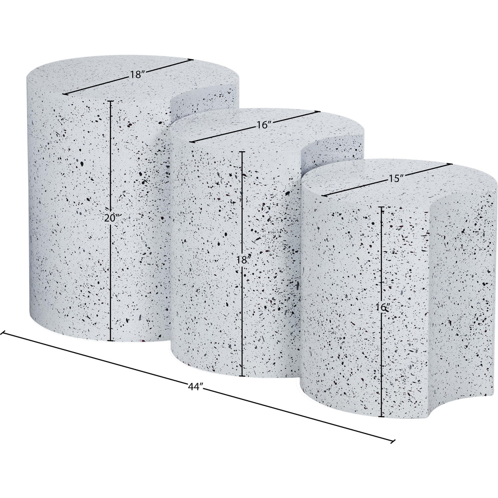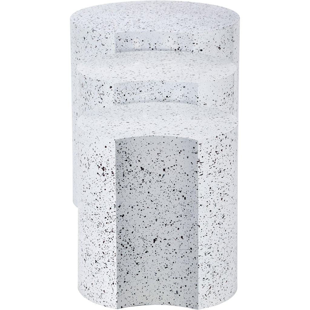 Beautify your room with this Dimple white end table. Crafted from white terrazo patterned iron metal, its modular shape allows you to connect as many as needed, offering versatility and style. With a contemporary nesting design, it adapts effortlessly to various spaces, whether used individually or in clusters. Perfect for adding both functionality and a modern aesthetic to your living area, this table promises to be a chic addition that enhances organization and visual appeal in any setting.