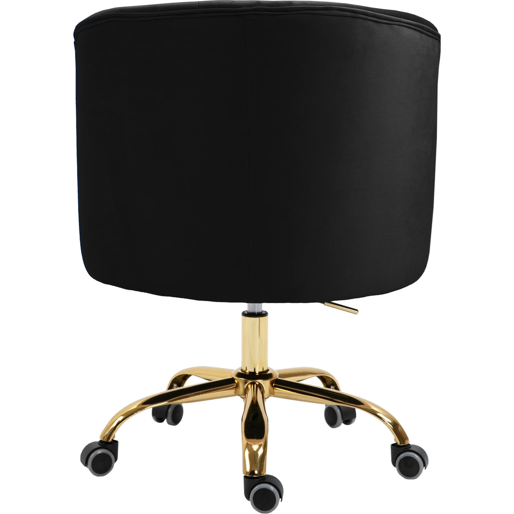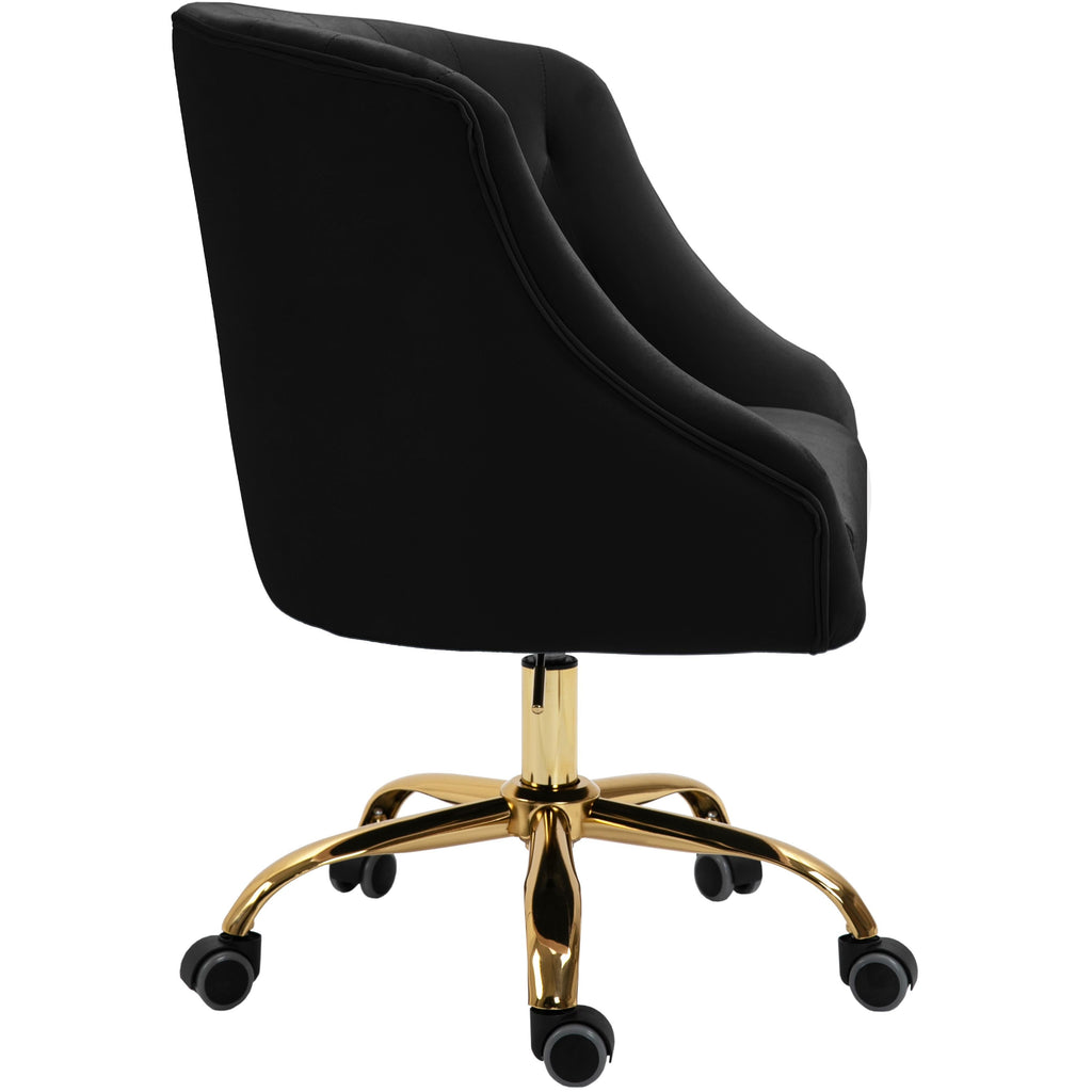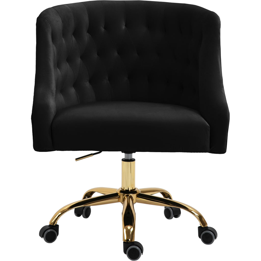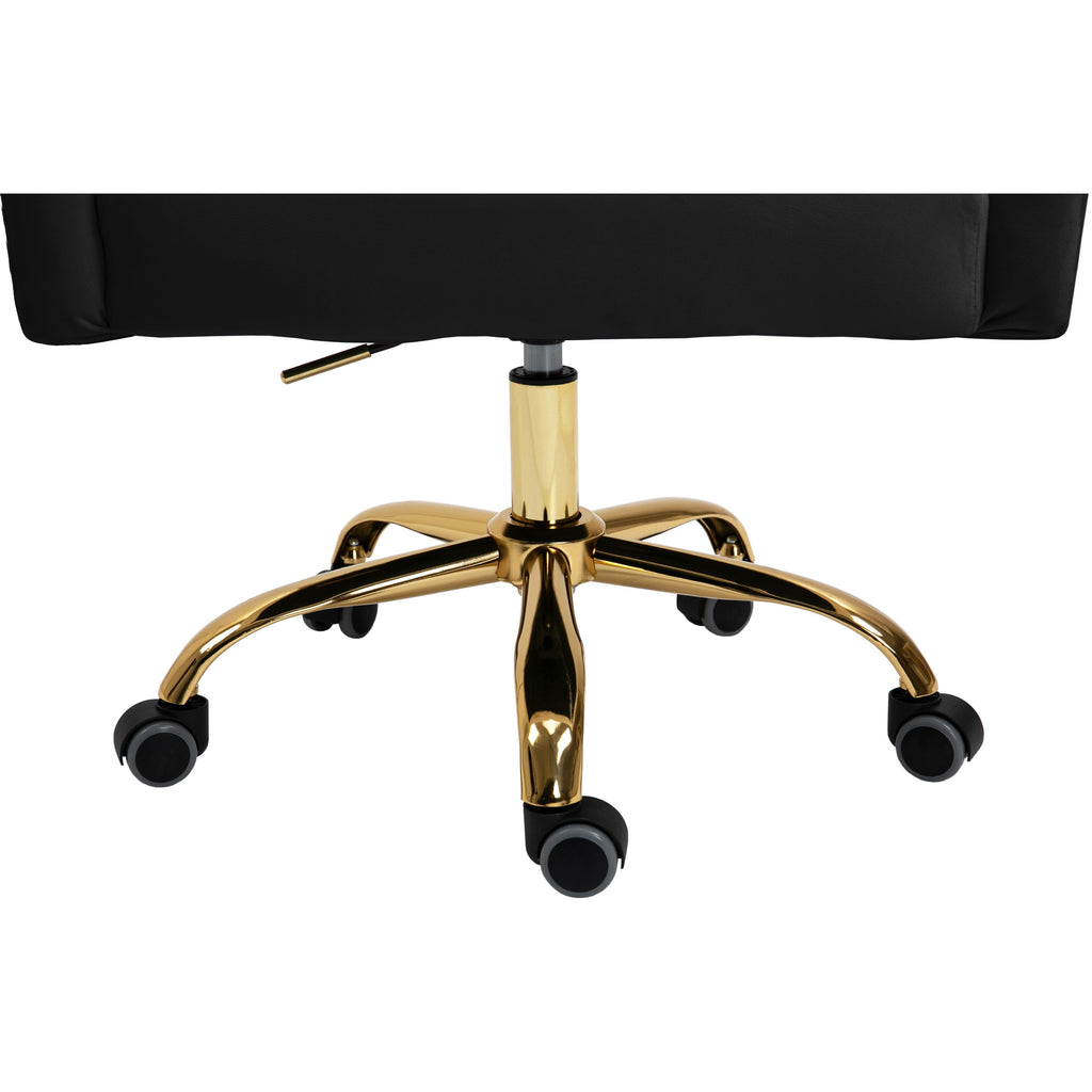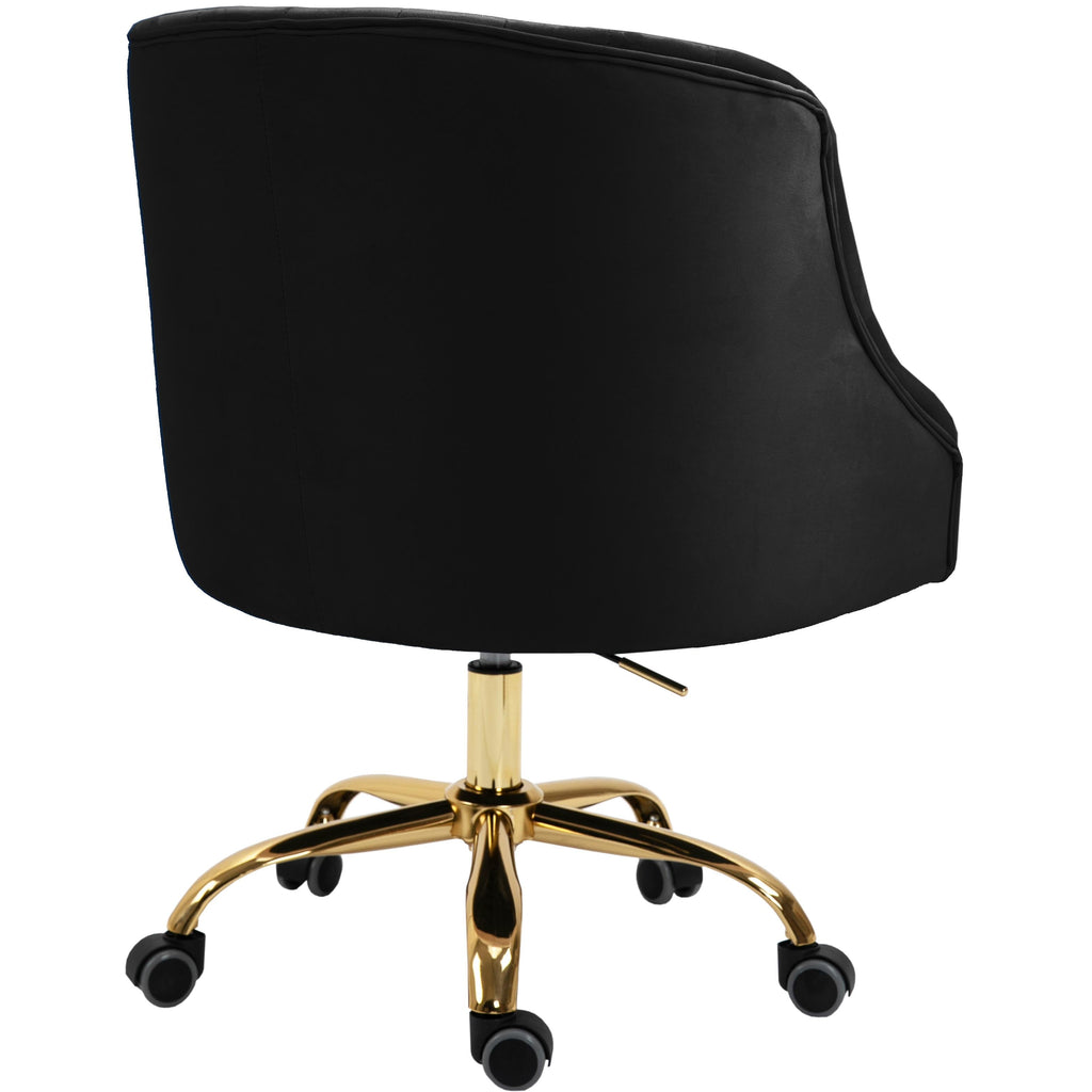 Stay cozy and comfortable at work while expressing your definitive modish tastes with this Arden Velvet Office Chair. This sumptuously appointed chair features soft black velvet upholstery with svelte button tufting and a rich gold base, ensuring that it garners more than its fair share of oohs and aahs, no matter who's admiring it. This contemporary office chair swivels to allow for expanded functionality, and it's adjustable, so you can customize the chair's position to meet your sitting preferences.