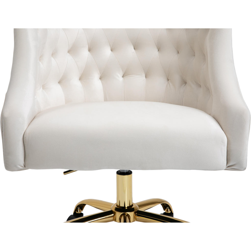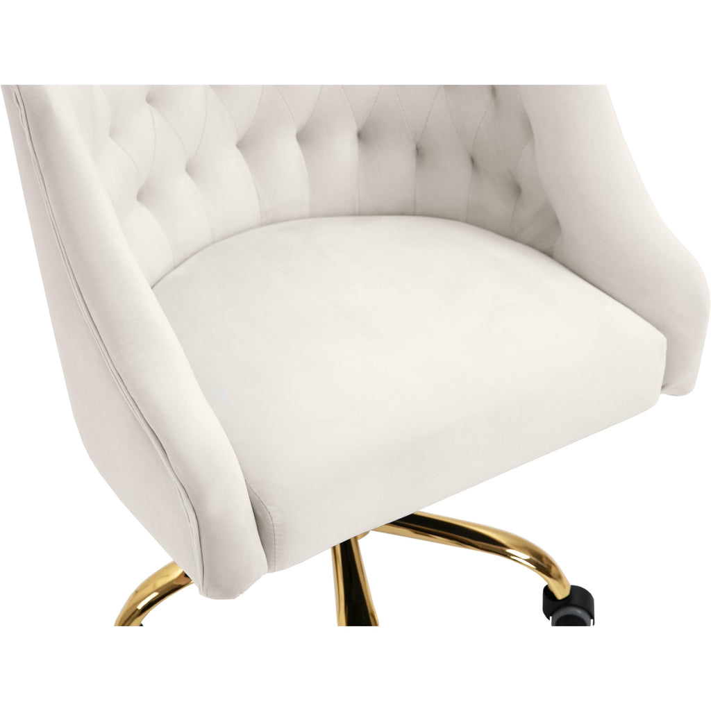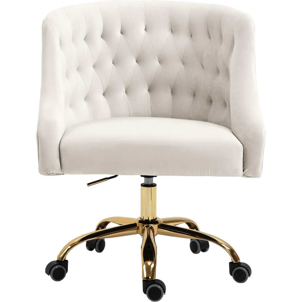 Stay cozy and comfortable at work while expressing your definitive modish tastes with this Arden Velvet Office Chair. This sumptuously appointed chair features soft cream velvet upholstery with svelte button tufting and a rich gold base, ensuring that it garners more than its fair share of oohs and aahs, no matter who's admiring it. This contemporary office chair swivels to allow for expanded functionality, and it's adjustable, so you can customize the chair's position to meet your sitting preferences.