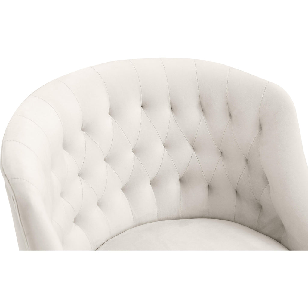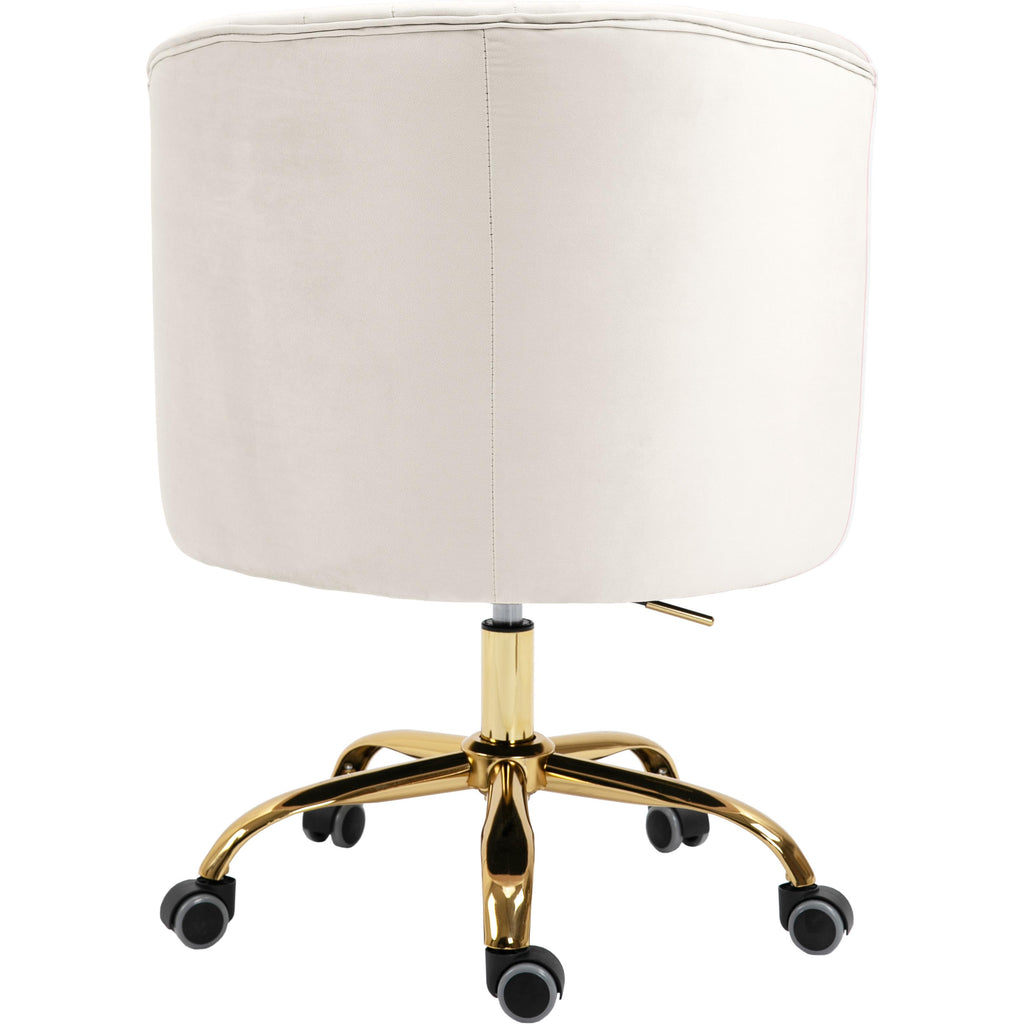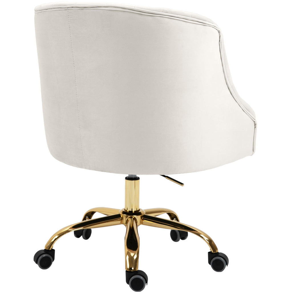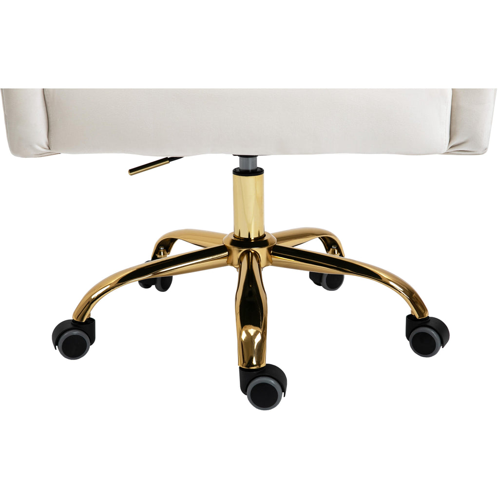 Stay cozy and comfortable at work while expressing your definitive modish tastes with this Arden Velvet Office Chair. This sumptuously appointed chair features soft cream velvet upholstery with svelte button tufting and a rich gold base, ensuring that it garners more than its fair share of oohs and aahs, no matter who's admiring it. This contemporary office chair swivels to allow for expanded functionality, and it's adjustable, so you can customize the chair's position to meet your sitting preferences.
