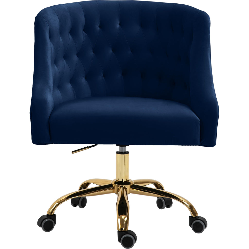 Stay cozy and comfortable at work while expressing your definitive modish tastes with this Arden Velvet Office Chair. This sumptuously appointed chair features soft navy velvet upholstery with svelte button tufting and a rich gold base, ensuring that it garners more than its fair share of oohs and aahs, no matter who's admiring it. This contemporary office chair swivels to allow for expanded functionality, and it's adjustable, so you can customize the chair's position to meet your sitting preferences.