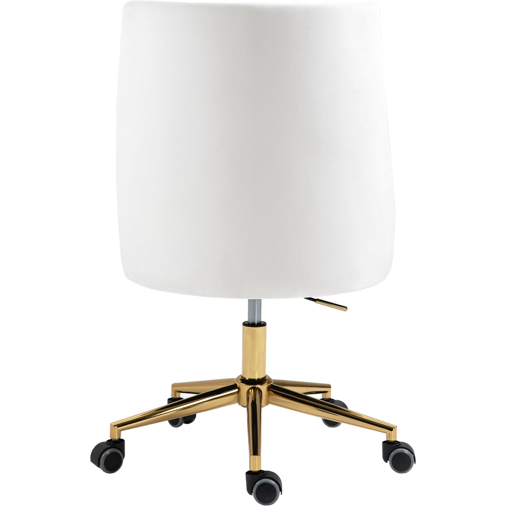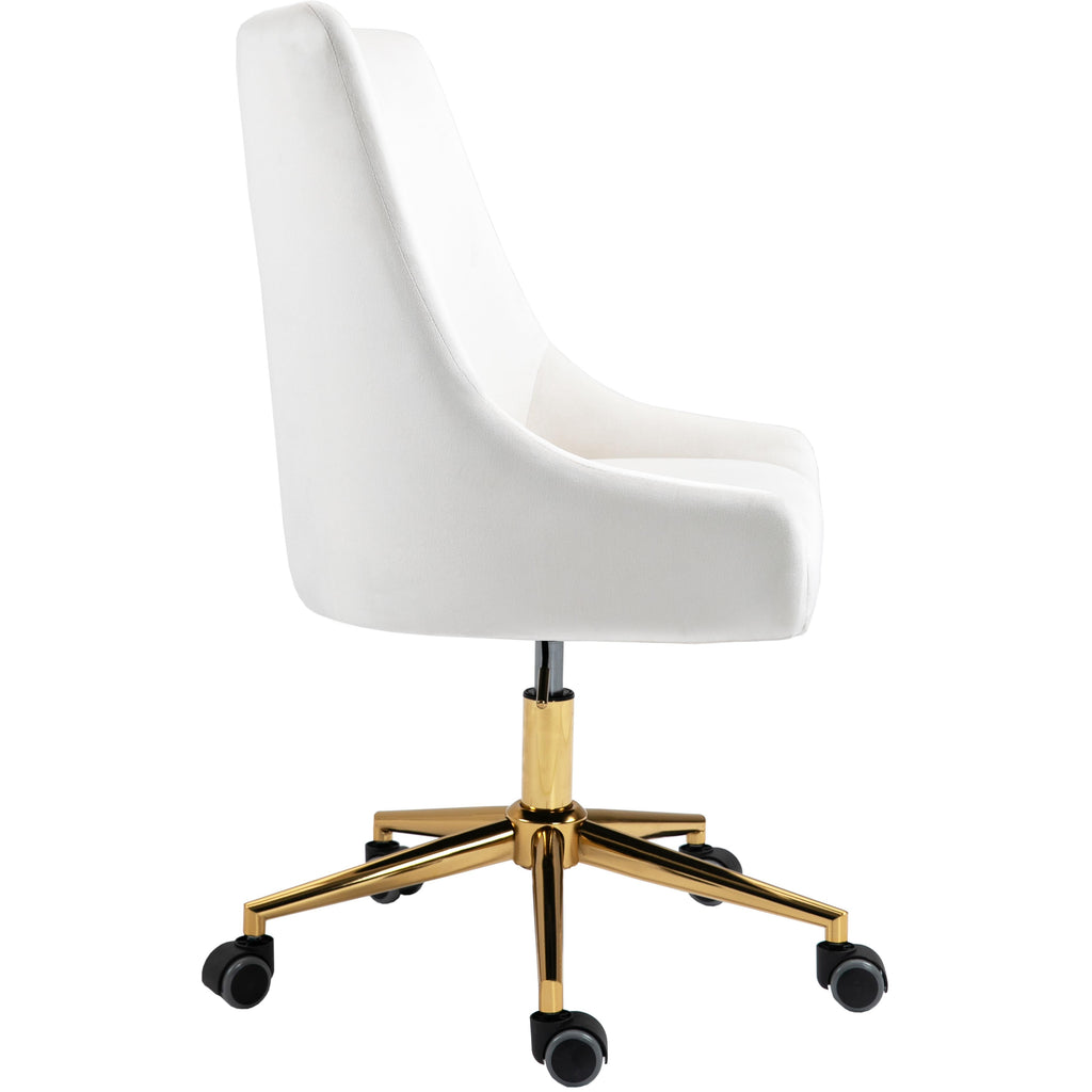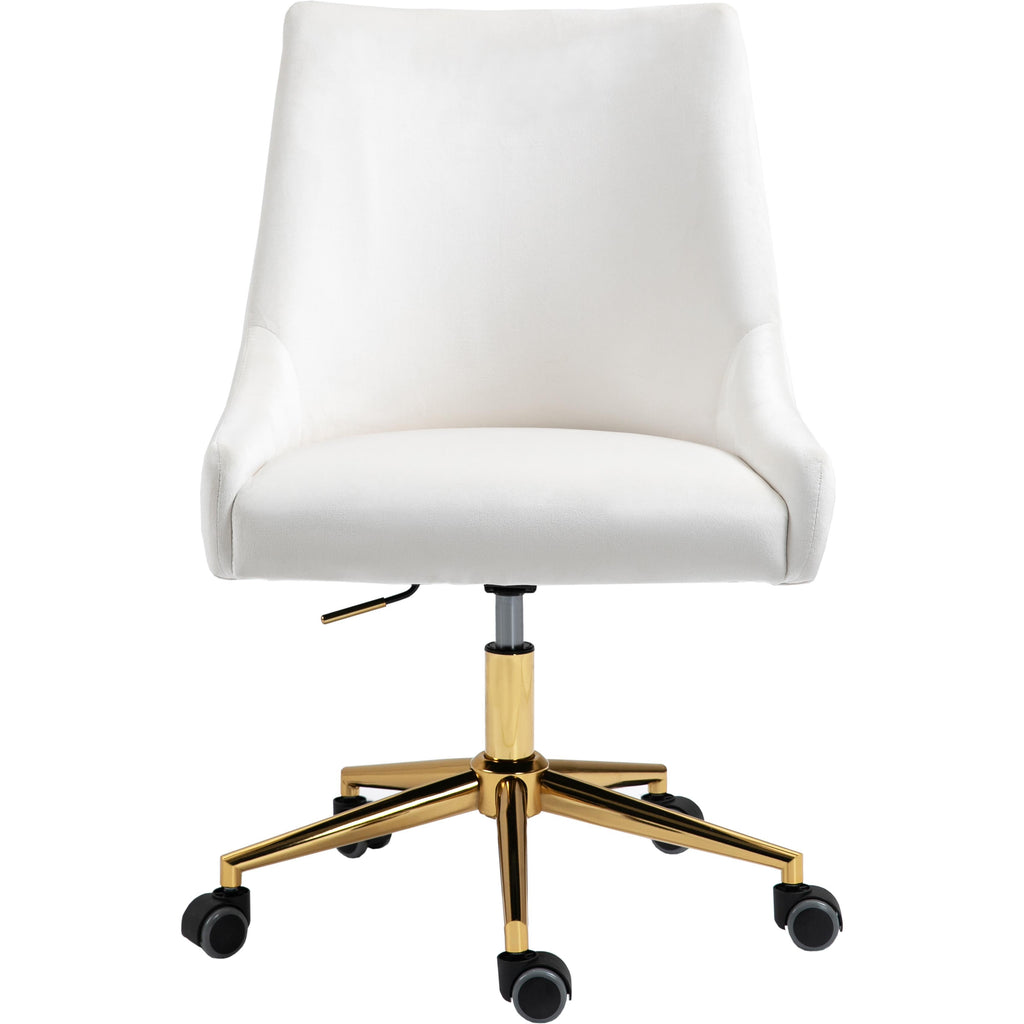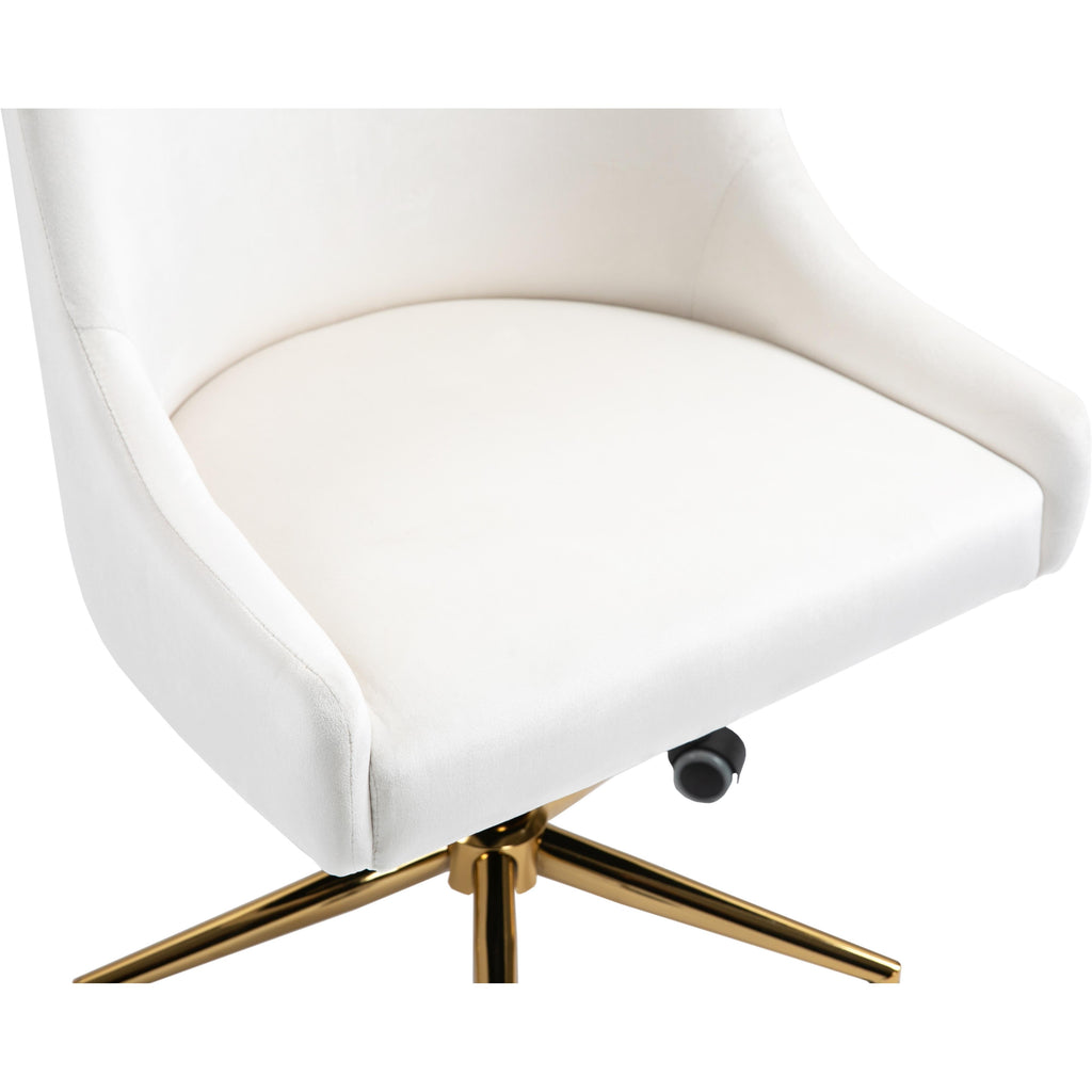Bring functional beauty to the limelight whenyou'rere seated in the comforting confines of this Karina Velvet Office Chair. This chair isn't just another handsome face for your office, althoughyou'rell fall for its soft cream velvet upholstery and rich gold base. This contemporary chair is just as utilitarian as it is attractive, with its swiveling design and five-star base with casters to make it easy to maneuver around your workstation. The chair is also adjustable, so it's easy to get comfortable and find your favorite sitting position.