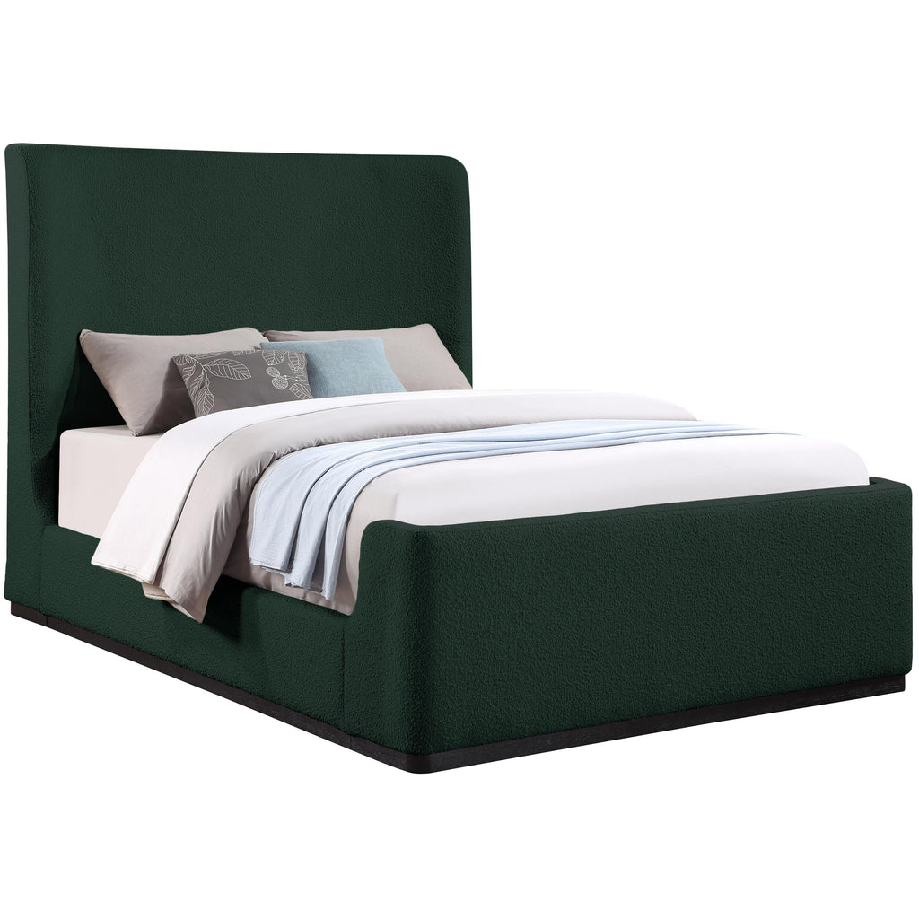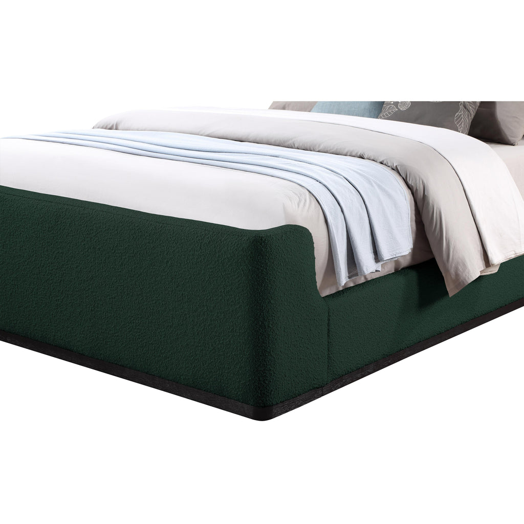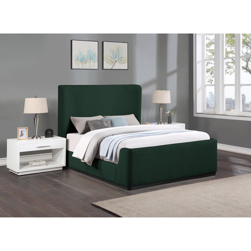 Make a bold statement with this stunning Oliver queen-size bed from Meridian Furniture. Its contemporary design is comprised of rubber wood with a solid wood black wire brush finish, upholstered with rich green boucle fabric, giving it an elegant appearance. A high headboard gives the bed a contemporary design, which fits any bedroom space. Add multicolored pillows and blankets for a unique touch that contrasts with the green boucle fabric.