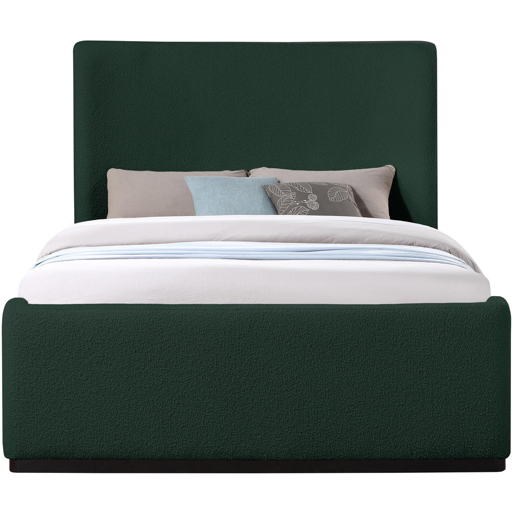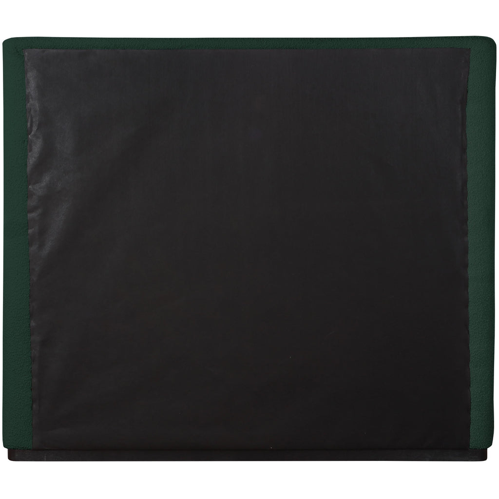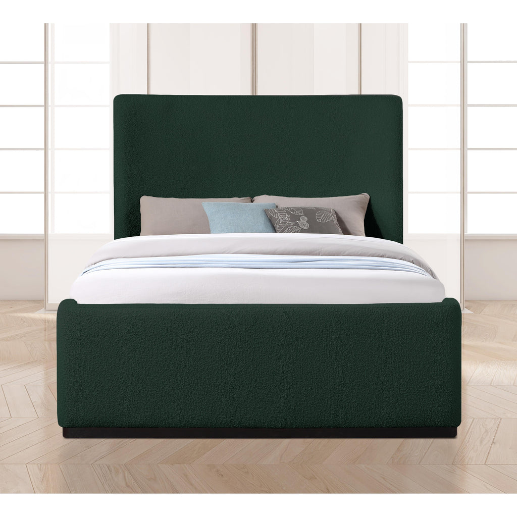 Make a bold statement with this stunning Oliver queen-size bed from Meridian Furniture. Its contemporary design is comprised of rubber wood with a solid wood black wire brush finish, upholstered with rich green boucle fabric, giving it an elegant appearance. A high headboard gives the bed a contemporary design, which fits any bedroom space. Add multicolored pillows and blankets for a unique touch that contrasts with the green boucle fabric.
