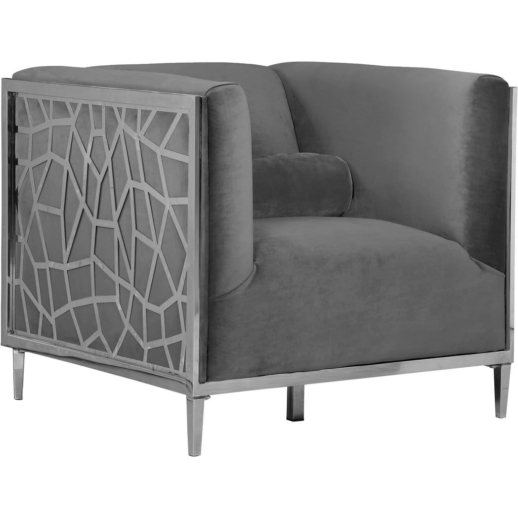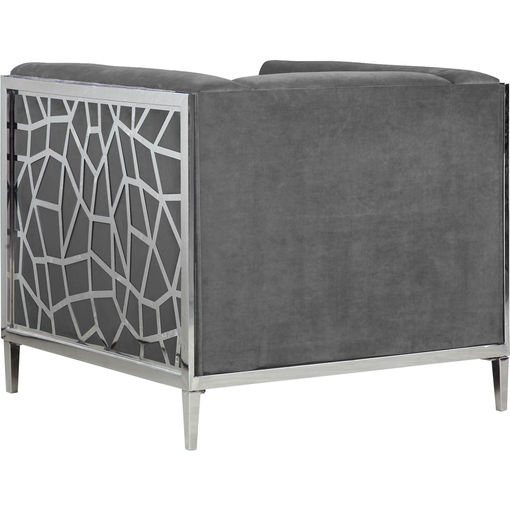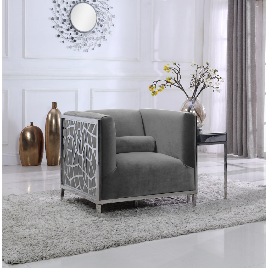 Catch the eyes of all who step foot in your home with this bold Opal grey velvet chair. Its chrome stainless steel patterned design creates a contemporary flair against its plush, grey velvet upholstery, creating a home accent piece that is both comfy and stylish. Its roomy design offers ample room to kick back and relax after a long day, while its stocky shape adds a daring touch to your decor.