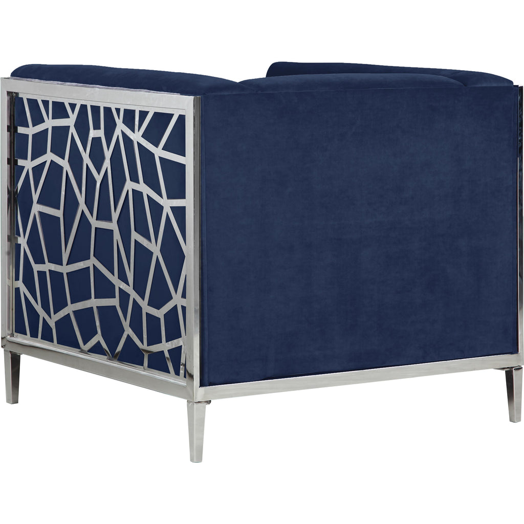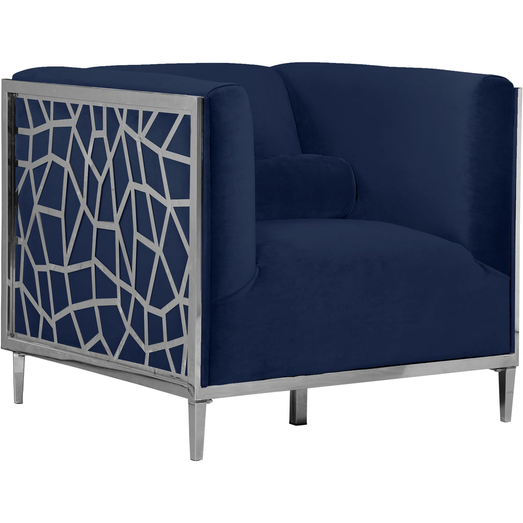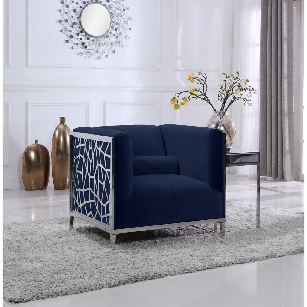 Catch the eyes of all who step foot in your home with this bold Opal navy velvet chair. Its chrome stainless steel patterned design creates a contemporary flair against its plush, navy velvet upholstery, creating a home accent piece that is both comfy and stylish. Its roomy design offers ample room to kick back and relax after a long day, while its stocky shape adds a daring touch to your decor.