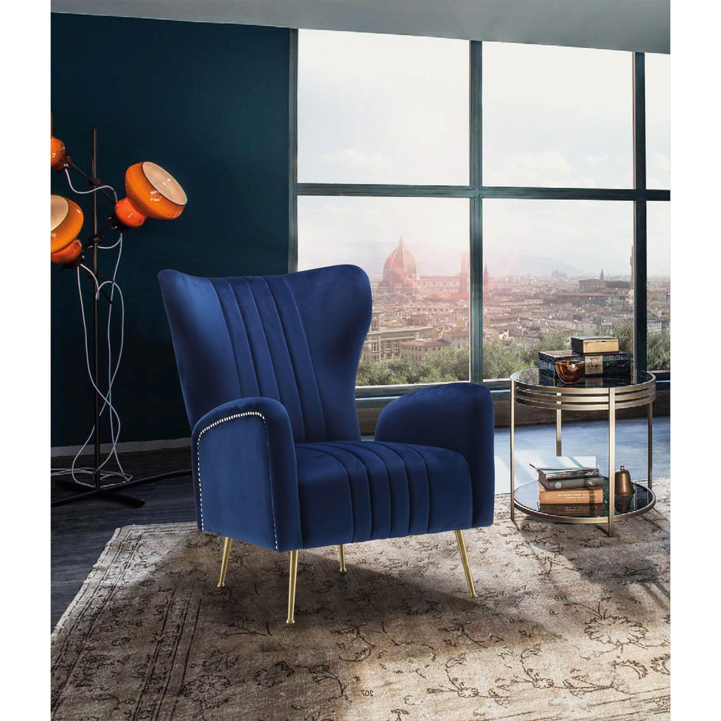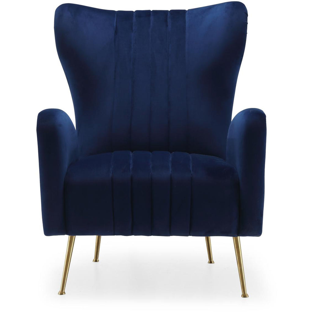 Inject contemporary finesse into your space with this pretty Opera navy velvet accent chair that puts a new twist on a classic design. This chair features a plush footprint with thickly padded back, seat, and arm cushions that cradle each part of your body, so you can relax and unwind at day's end. The legs are made from stainless steel for strength and durability and have a gold tone finish for a rich, elegant look. Horizontal tufting on the seat and back add to the distinctive look of this fabulous chair.