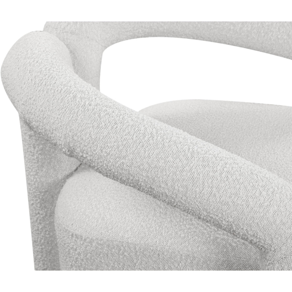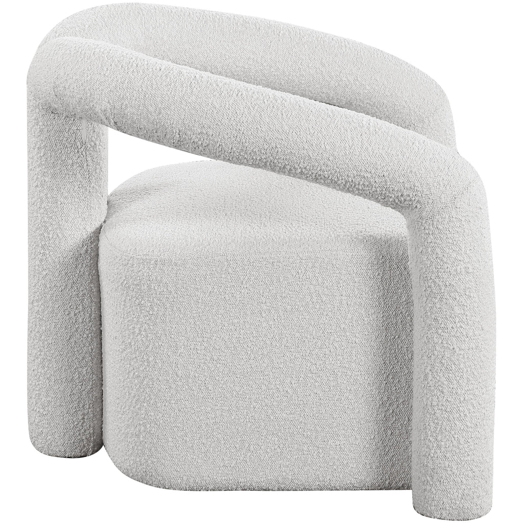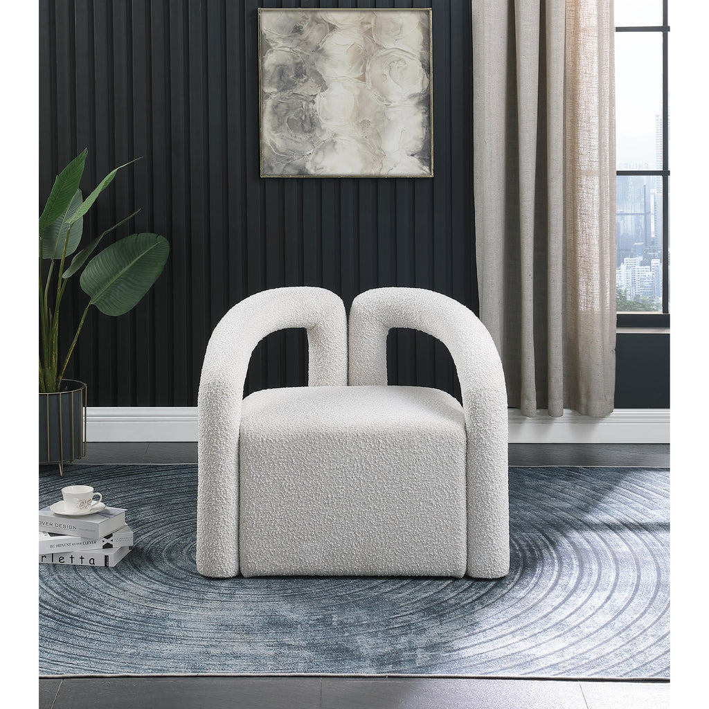 Liven up your home with this unique Otto accent chair. Crafted from a mixture of plywood, metal, foam, and fabric, this open-back chair is durable and sturdy enough to support just about anyone who sits on it. Its curved back provides a cushy surface to rest your back, and its open back style makes a bold statement in any modern living space. Its thick foam seat offers you a cozy place to rest your weary bones, and rich cream boucle fabric adds to its style and comfort.
