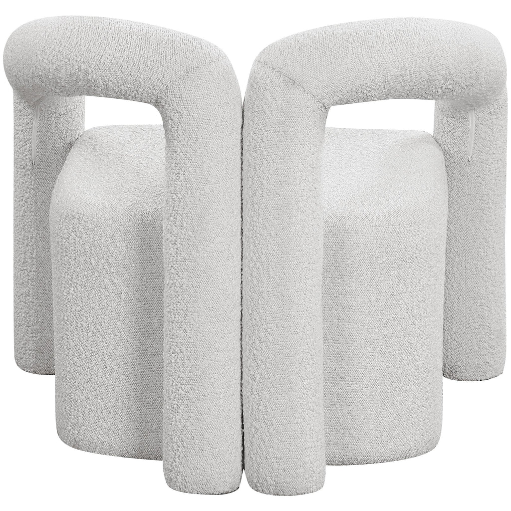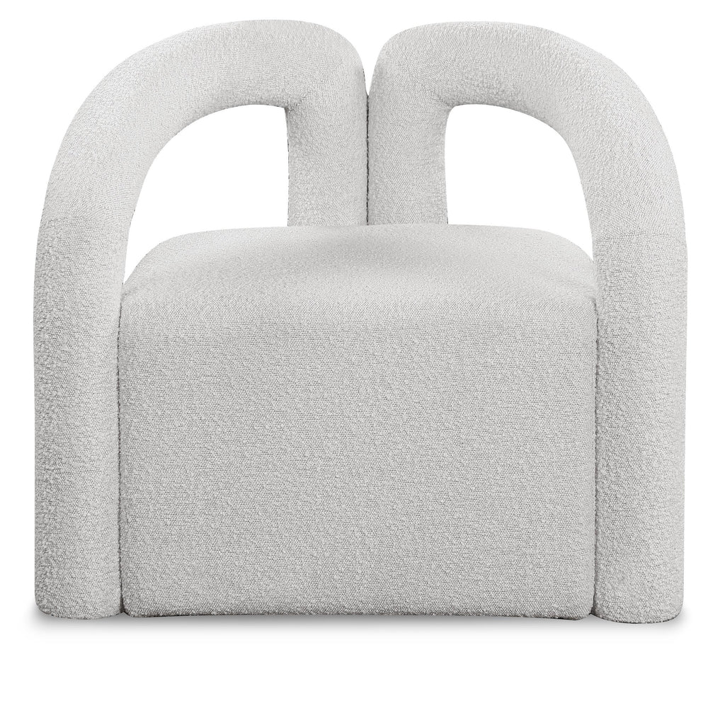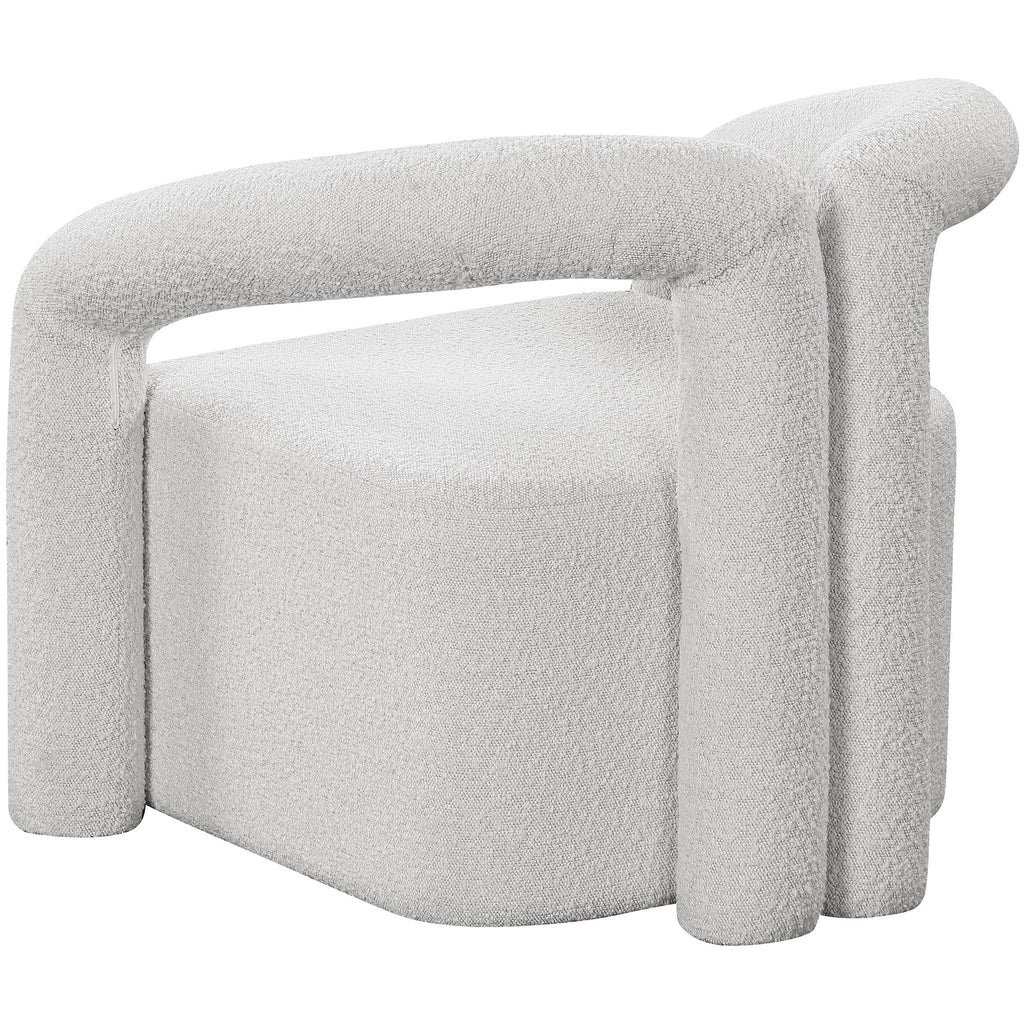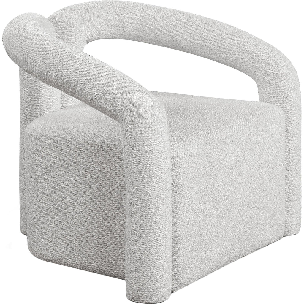 Liven up your home with this unique Otto accent chair. Crafted from a mixture of plywood, metal, foam, and fabric, this open-back chair is durable and sturdy enough to support just about anyone who sits on it. Its curved back provides a cushy surface to rest your back, and its open back style makes a bold statement in any modern living space. Its thick foam seat offers you a cozy place to rest your weary bones, and rich cream boucle fabric adds to its style and comfort.